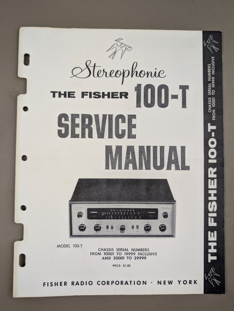 The Fisher Stereophonic 100-T Service Manual This manual/schematic is gently used and may have slight yellowing/patina. Corners and edges may have light wear, light bends. Professionally packaged between 2 cardboard stock sheets and placed inside of a plastic sleeve inside of mailer for effective protection in shipping. No P.O. boxes please!