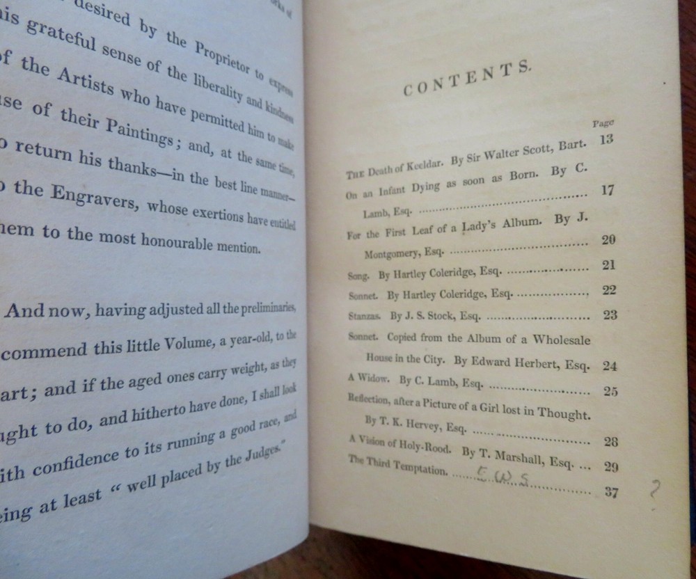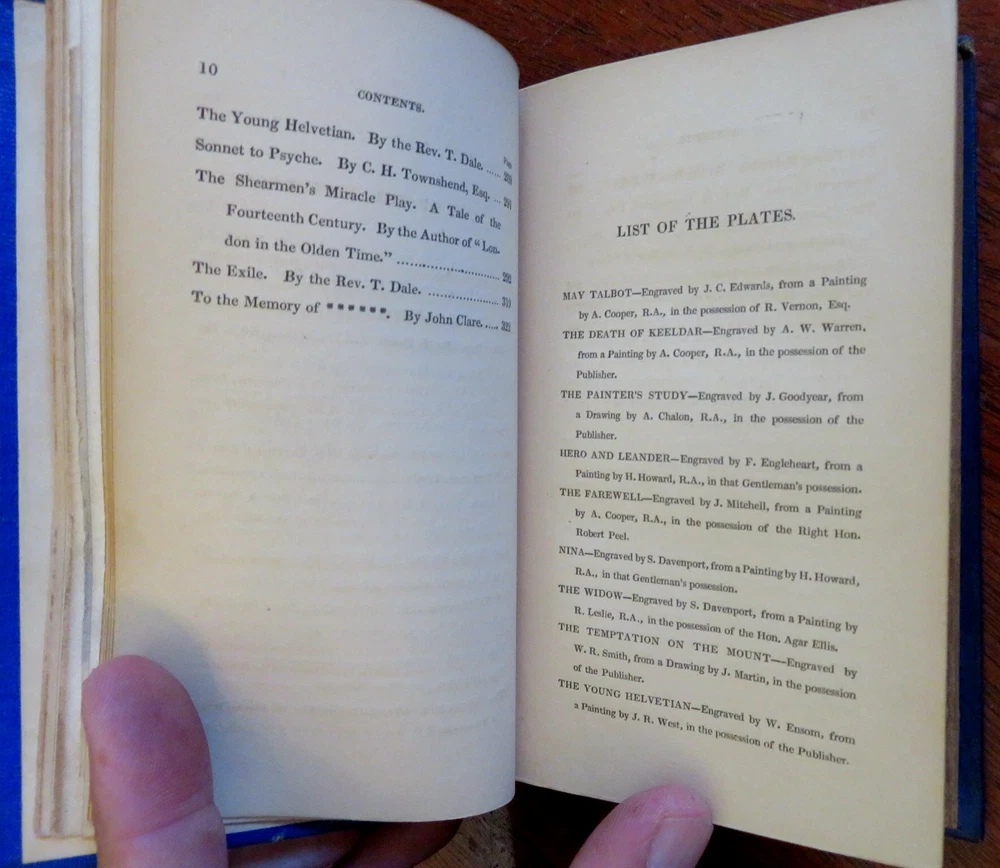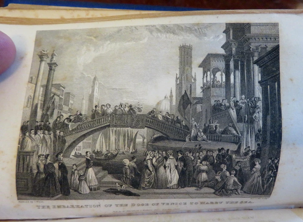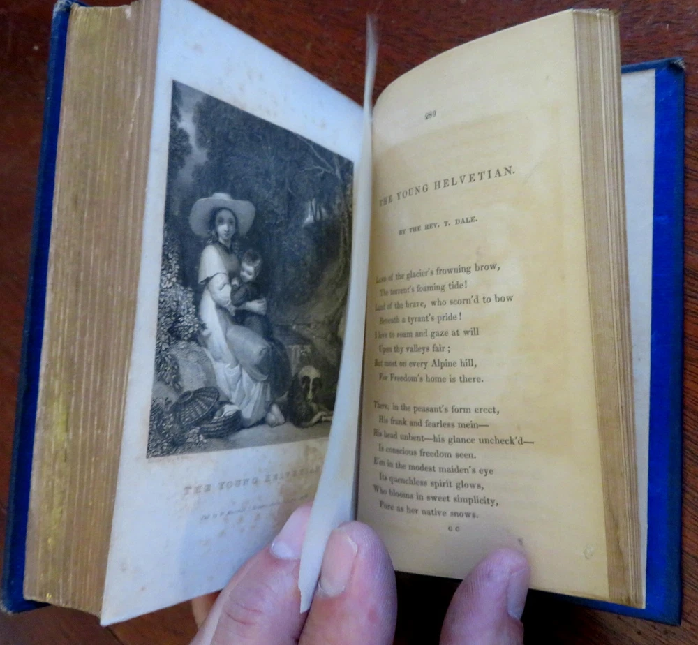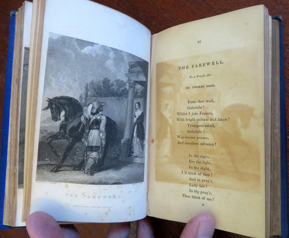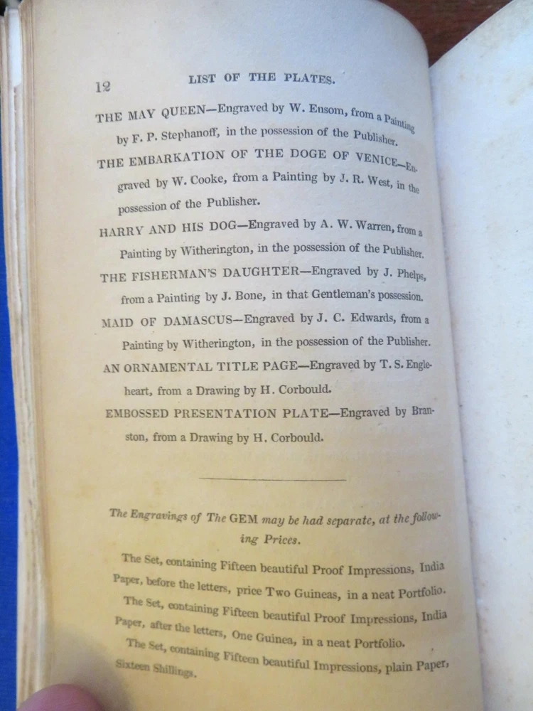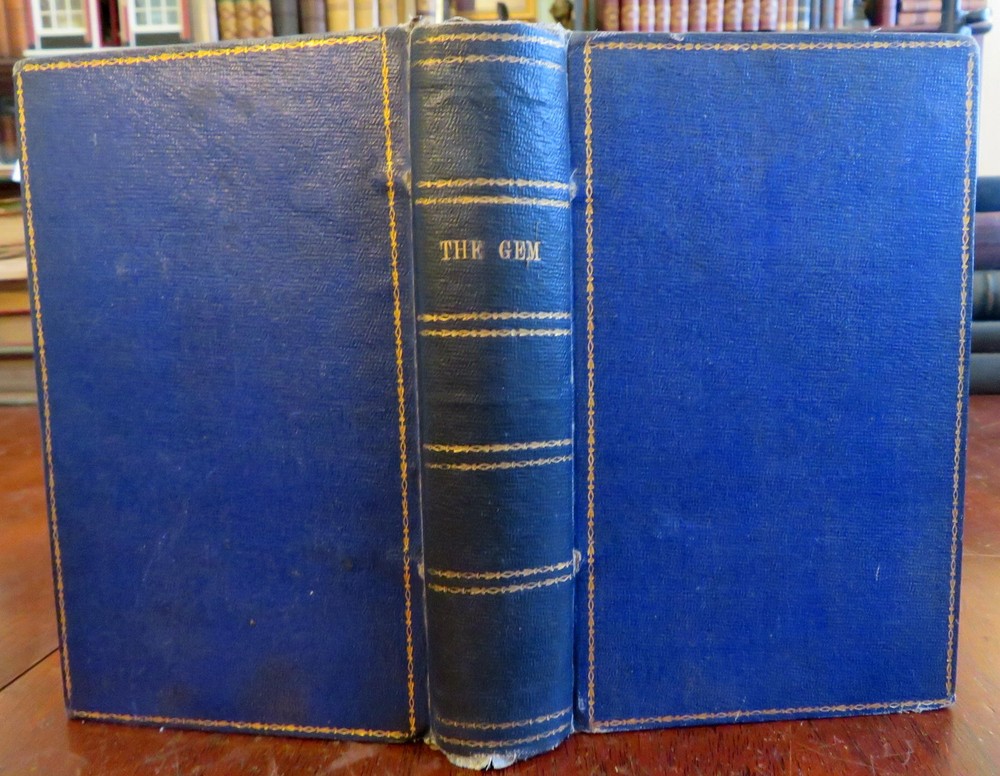 The Gem Literary Annual 1829 Leather Gift Book Poetry w/ 16 engraved plates The Gem Literary Annual 1829 Leather Gift Book Poetry w/ 16 engraved plates (Old Books, 19th Century Books, Leather Books, Literature, Gift Books, Illustrated Books). The Gem: A Literary Annual, edited by Thomas Hood. Published 1829, London by W. Marshall. 324 pages. Text in English. Engraved frontis & half title protected by original tissue guard. Illustrated throughout with 15 full page engraved plates plus an embossed presentation plate (complete as issued). Attractive antiquarian cloth binding, smooth spine, gilt bands, gilt title lettering, all edges gilt. Scarce book is physically old and shows some signs of handling and time. Binding gently age worn but still appealing, leather and joints slightly rubbed but still supple, remains overall very attractive as an object. Text block paper is gently age toned as typical, internally book remains mostly clean, tight and sound. A book which has been taken care of but may/ does not look like new. Still attractive on the shelf. Book displays a pleasing and unique age patina and is in rather nice antiquarian condition, any age flaws seem easy to overlook or forgive. Please review photos for more detailed attempt to present this book as it survives. We often over-describe any flaws that many sellers would not even bother to mention since most people would overlook them as minor and unworthy of comment. Many people tell us the books they receive from us are nicer in person than they appears on the screen. We want you to be clear about what you are buying, so we take numerous photos and try to describe it openly and honestly. Book Measures c. 6 3/4" H x 4" W. [B10259].