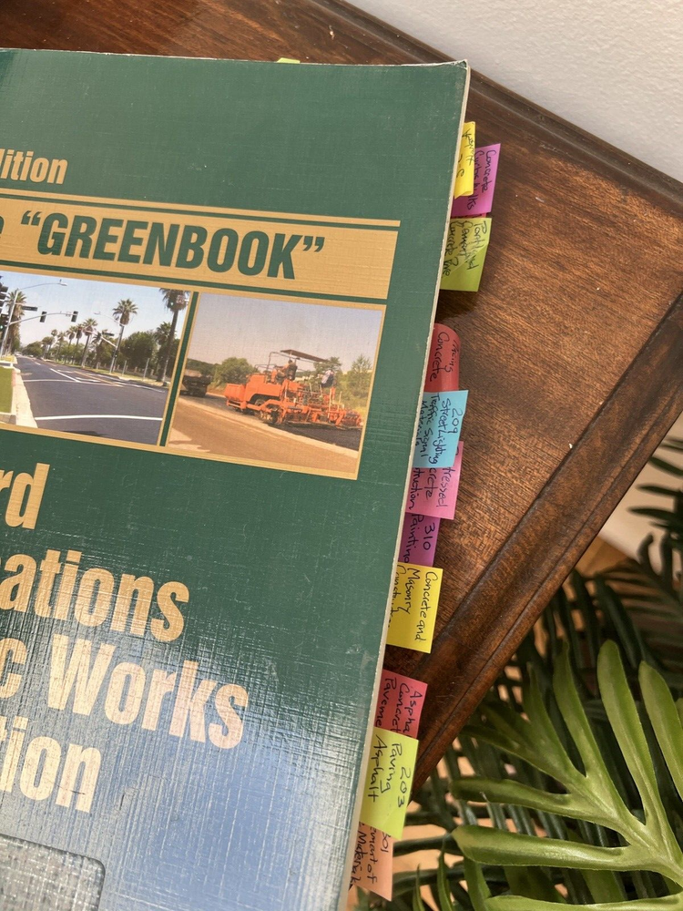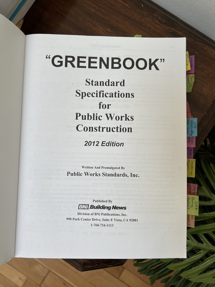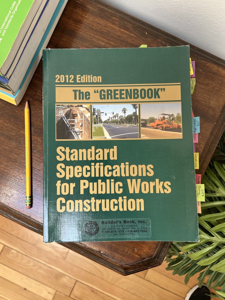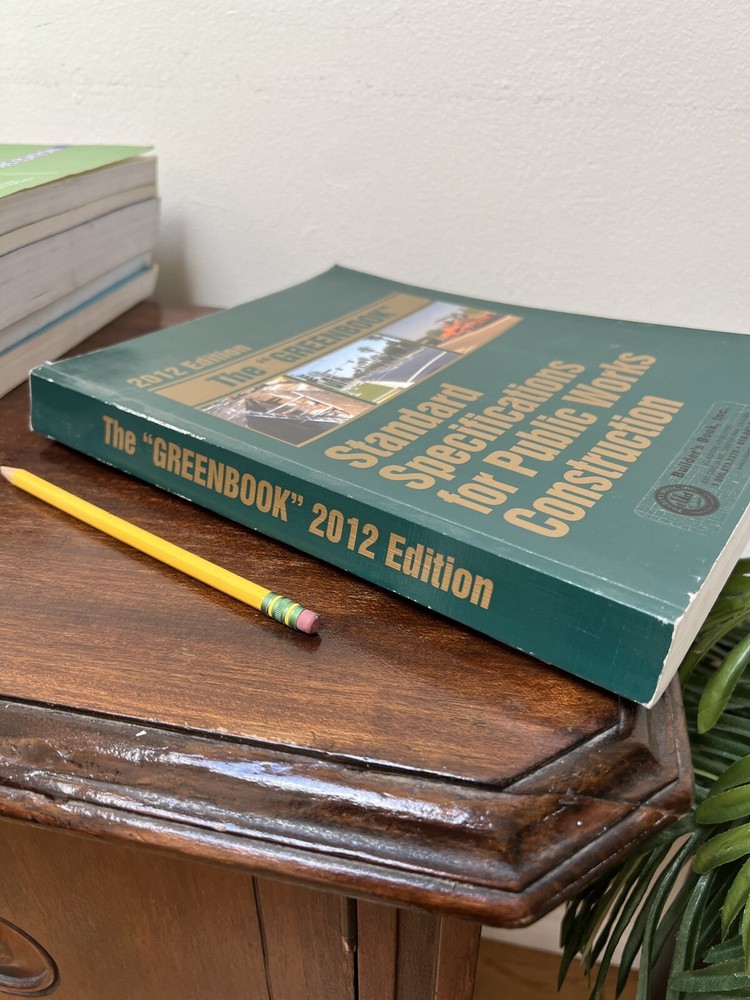 The "Greenbook" 2012 Edition: Standard Specifications for Public Works Construction Published by Public Works Standards, Inc. The 2012 Edition of The "Greenbook" is a definitive guide for public works construction projects, providing standardized specifications widely used by municipalities, counties, and construction professionals. This trusted reference ensures uniformity, clarity, and compliance across a range of public works projects. Published by Public Works Standards, Inc. , this comprehensive manual is an essential resource for engineers, contractors, and public works officials. Key Features: Title: The "Greenbook" 2012 Edition: Standard Specifications for Public Works Construction Publisher: Public Works Standards, Inc. Copyright: 2012 Pages: Approx. 600 Dimensions: Approx. 11 x 8.5 inches Condition: Cover: Moderate wear with minor scuffs and edge wear from use. Spine: Strong and intact, with no major damage. Pages: Clean and legible, free from writing. Some highlighting. Removable 3M tabs. Binding: Secure with no loose or missing pages. Weight: Approx. 3 pounds Why Buy This Book? Widely recognized standard for public works construction projects. Used by municipalities and counties for consistent specifications and guidelines. Comprehensive coverage of construction standards, materials, and processes. Trusted by engineers, contractors, and public works officials nationwide. Shipping: This book will be securely packaged and shipped promptly to ensure it arrives in excellent condition.