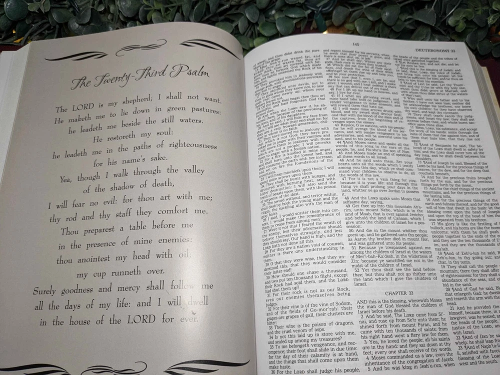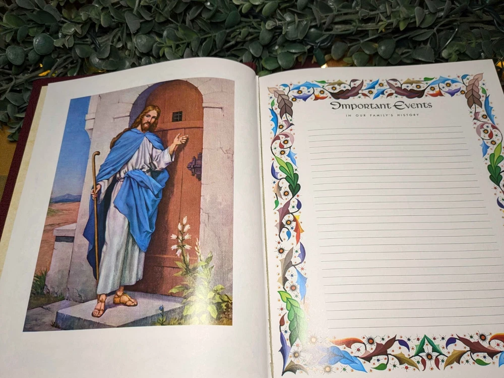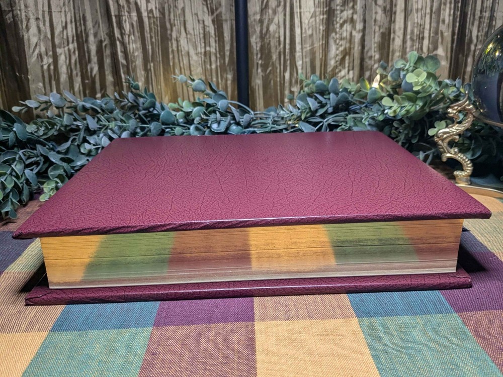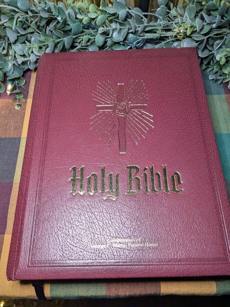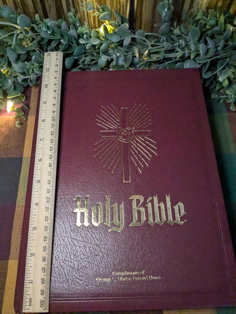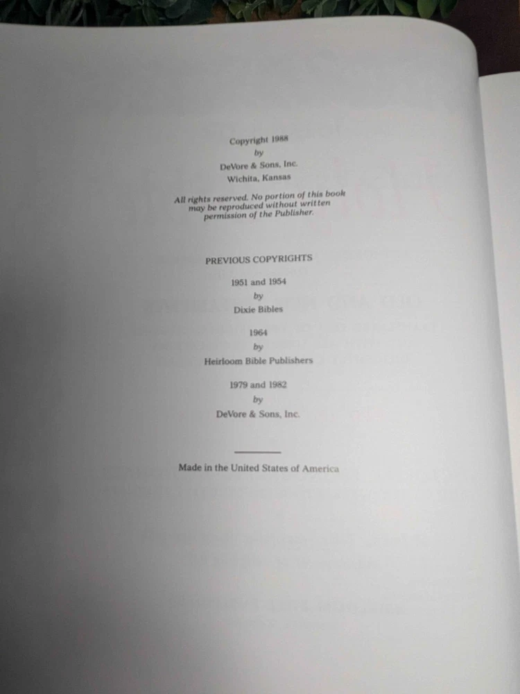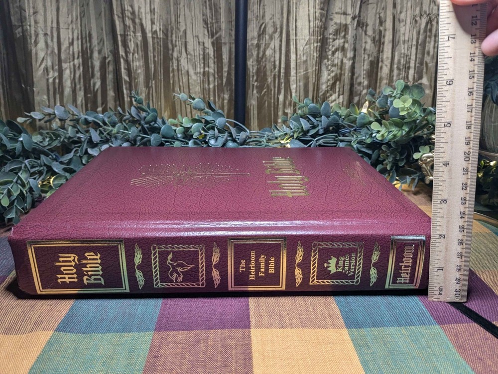 The "Heirloom Bible" by DeVore & Sons, Inc is a vintage Red Letter Edition Bible published in 1988. It is a hardcover Bible with a faux leather bound cover, illustrated and written in English by the author God. This Bible features the King James Version, Old Testament, and New Testament, making it a valuable resource for spirituality, Christianity, and historical reference. Made in the United States.