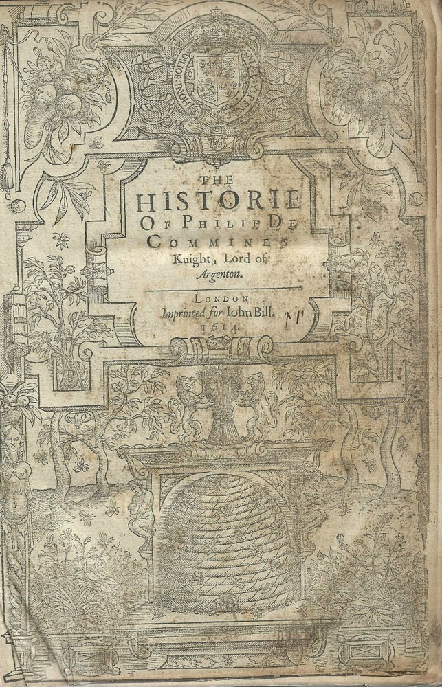 The Historie Of Philip De Commines Knight, Lord of Argenton. London, imprinted by John Bill 1614. full period brown leather. 362 pages. engraved title and chapter heading letters. lacks 2/3 of spine cover o/w good. see scans size, 10 1/2 x 7 1/4 inches. pen and ink notes in margins. VERY RARE.
