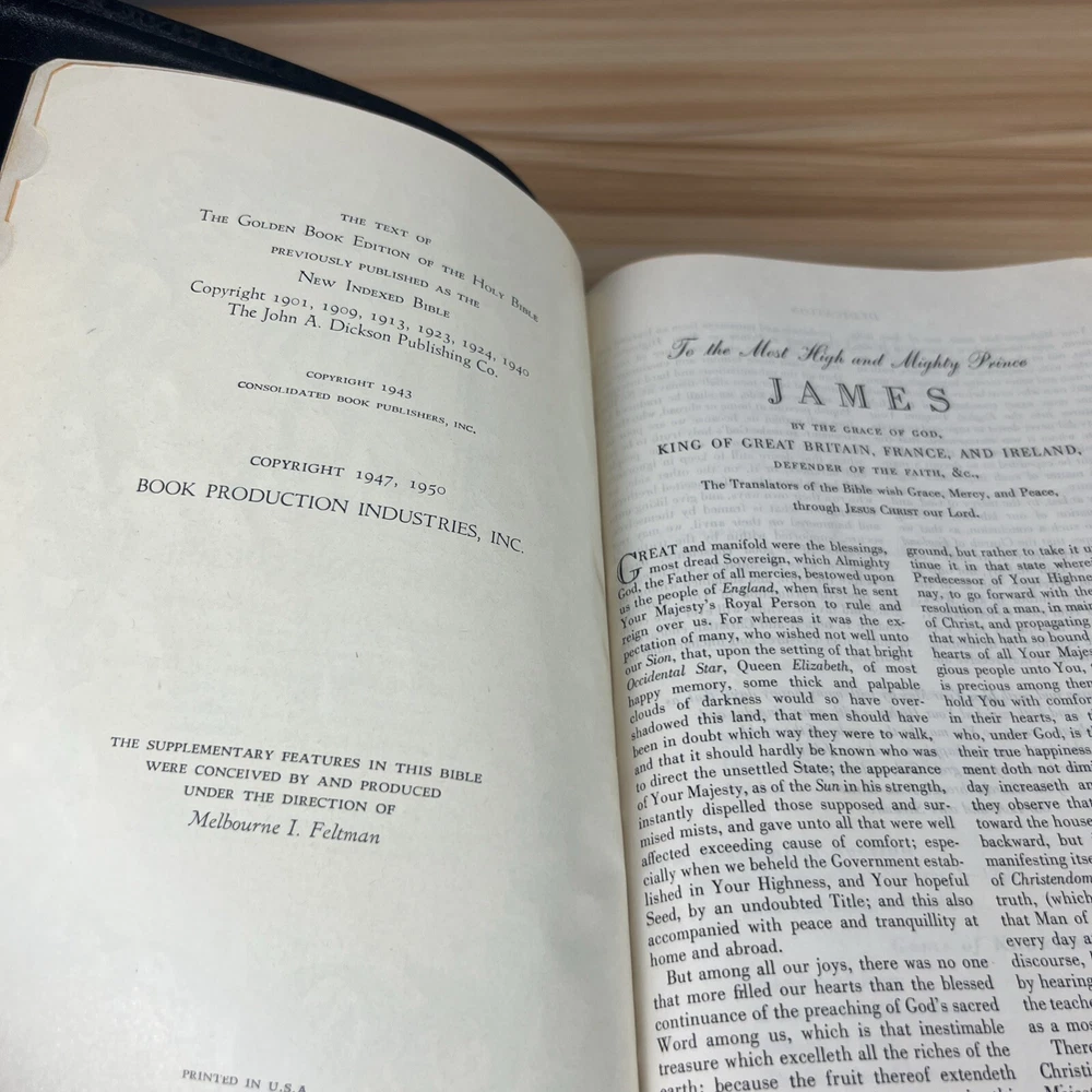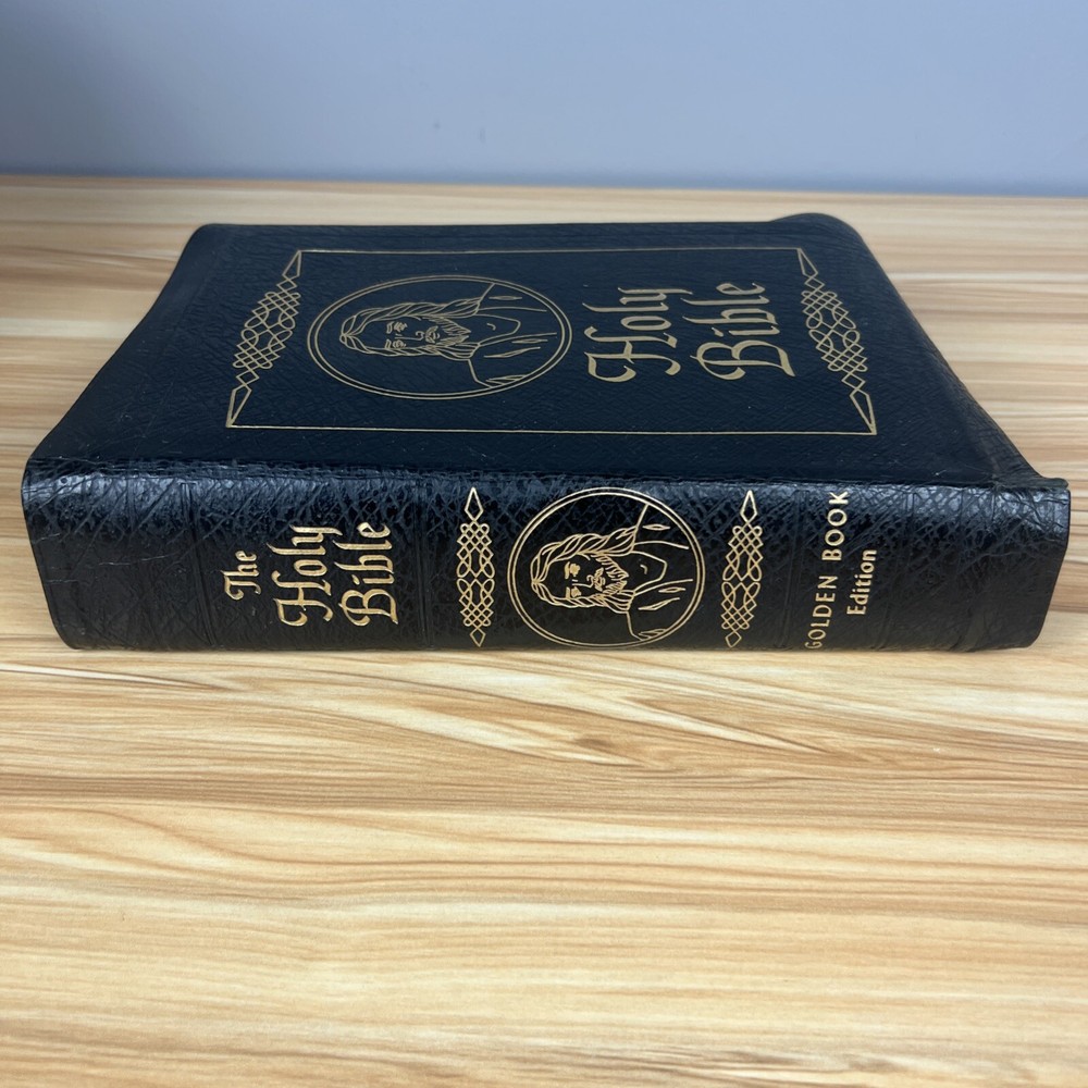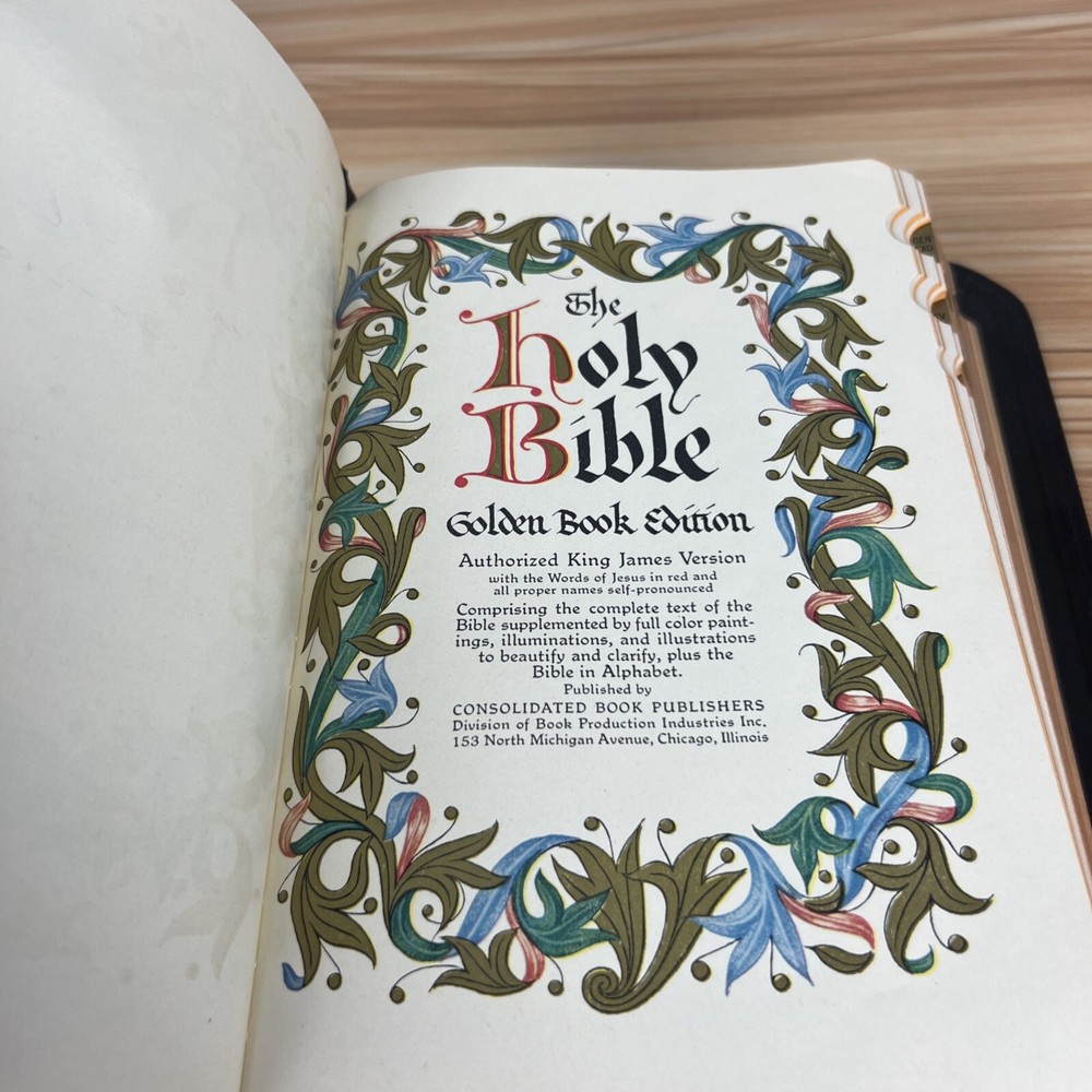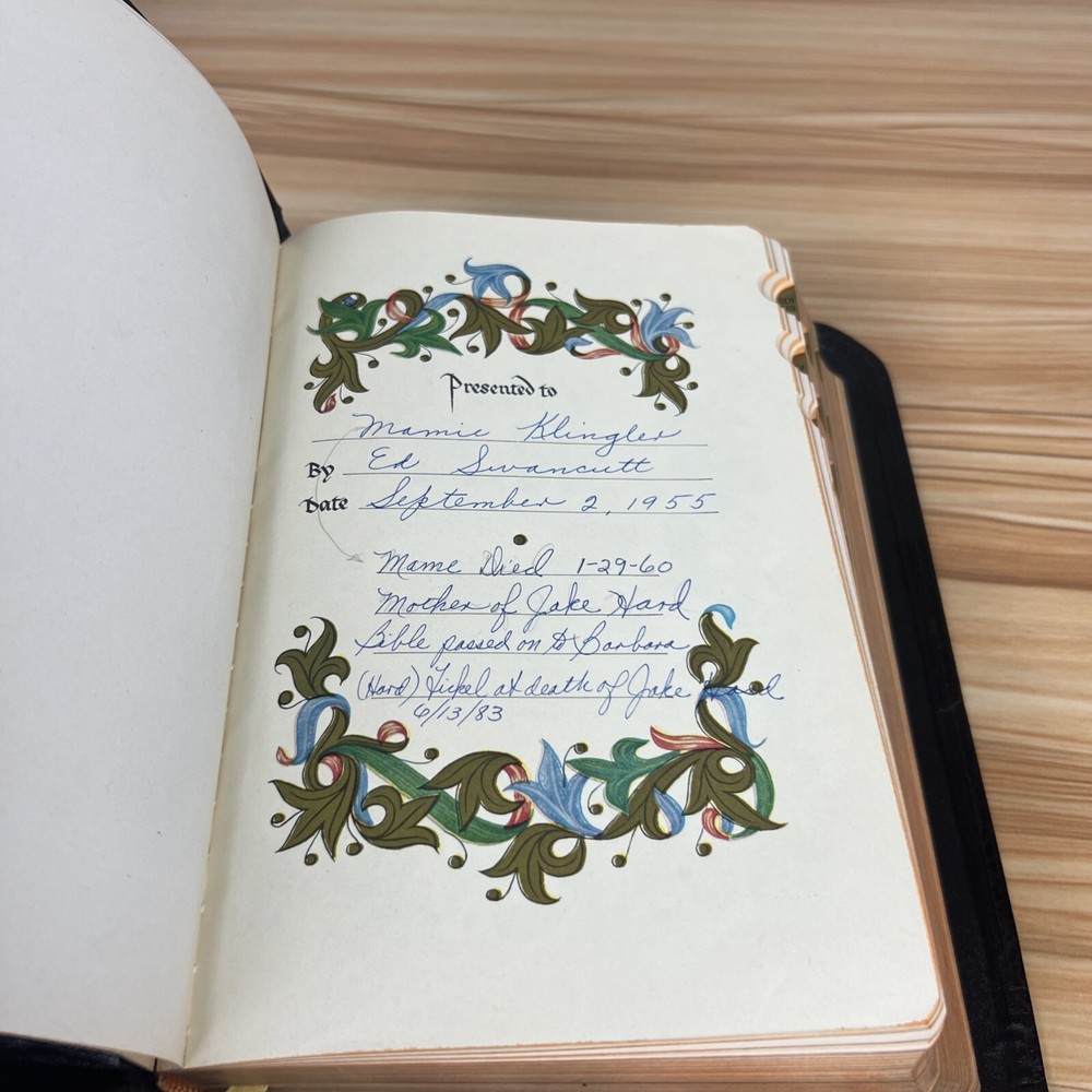 The Holy Bible 1950 Golden Book Edition KJV Thumb Indexed with Leather Binding. The only markings will be found on the presented page. This is seen in the pictures. There are no other markings. The edges of the Bible are bowed in, but that is by design