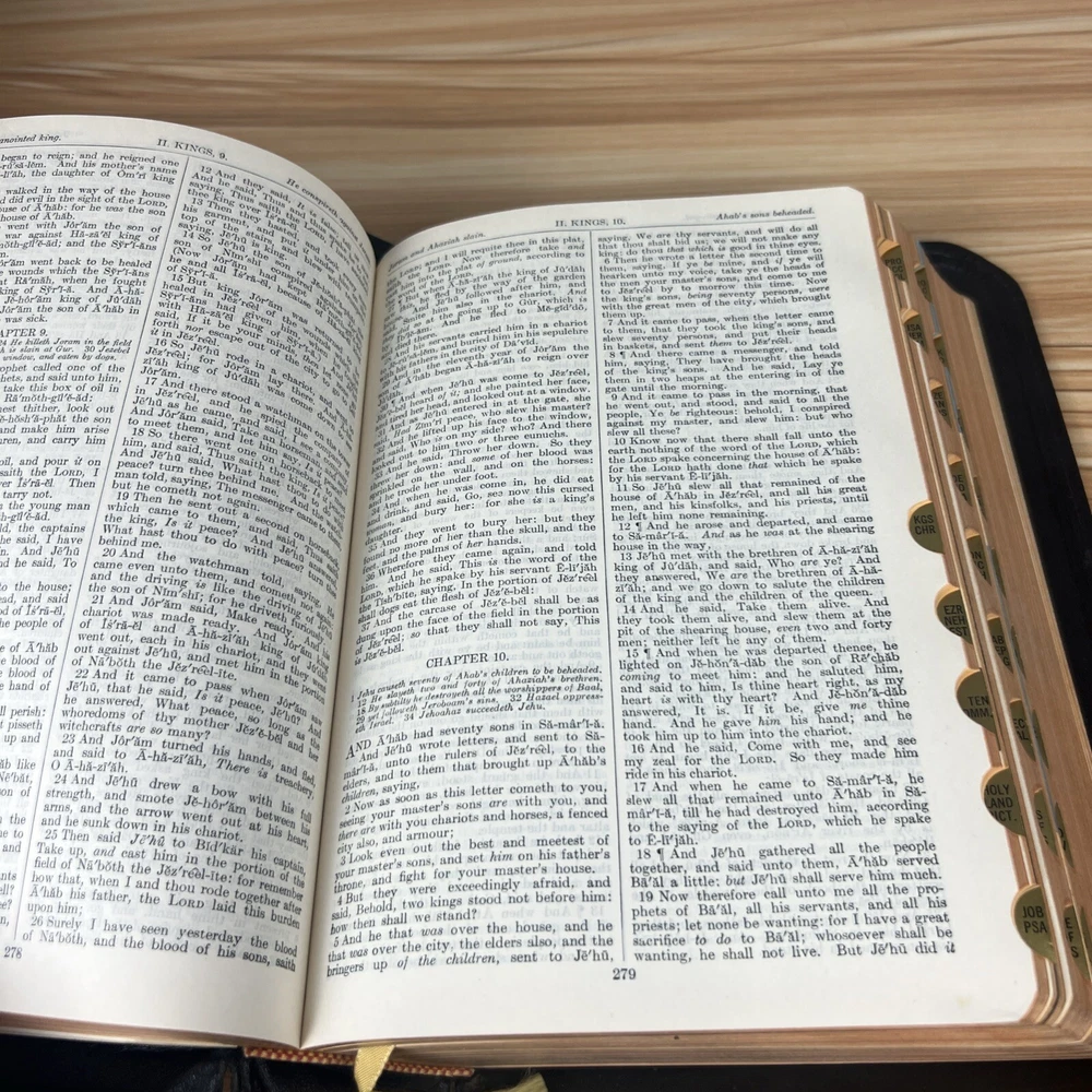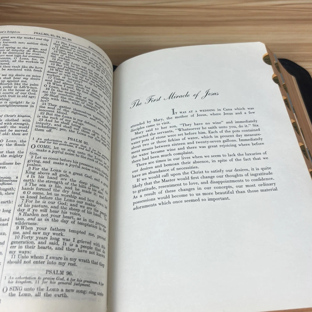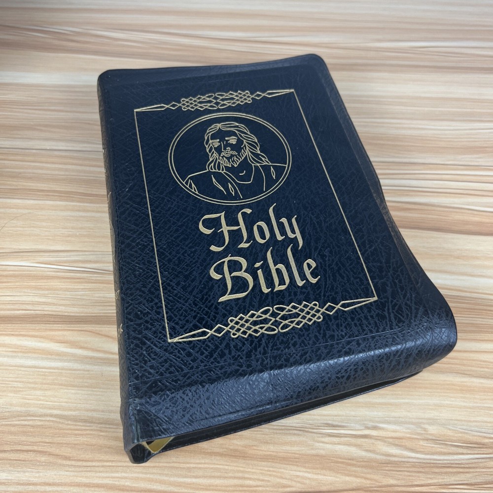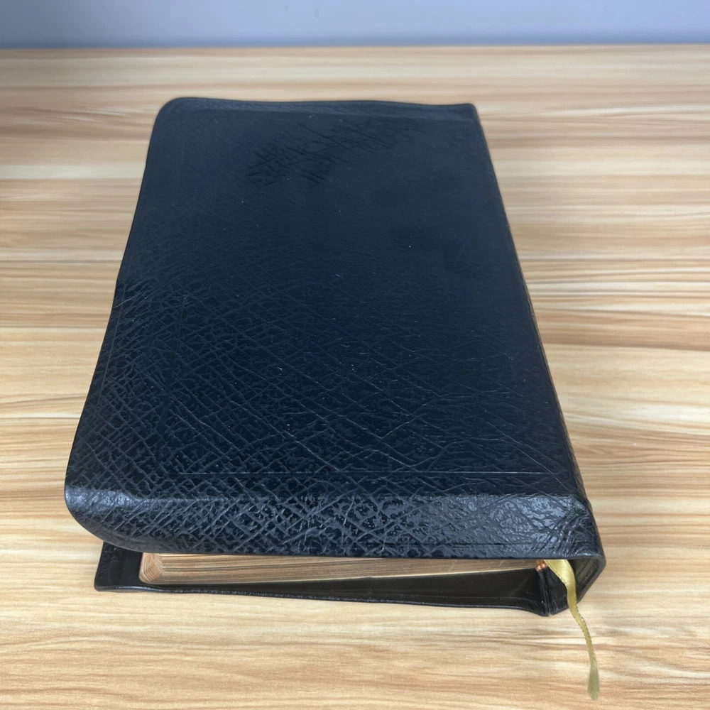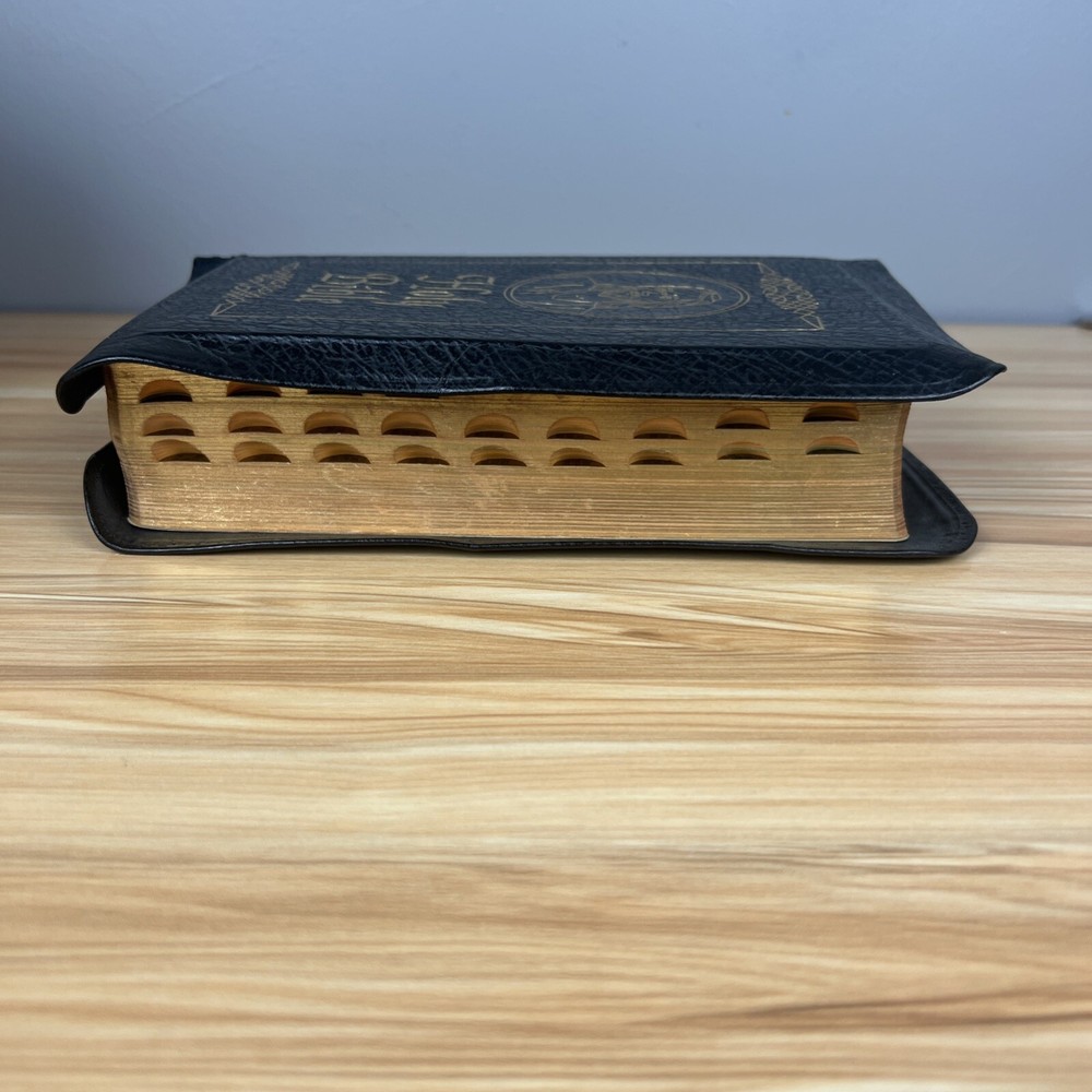 The Holy Bible 1950 Golden Book Edition KJV Thumb Indexed with Leather Binding. The only markings will be found on the presented page. This is seen in the pictures. There are no other markings. The edges of the Bible are bowed in, but that is by design