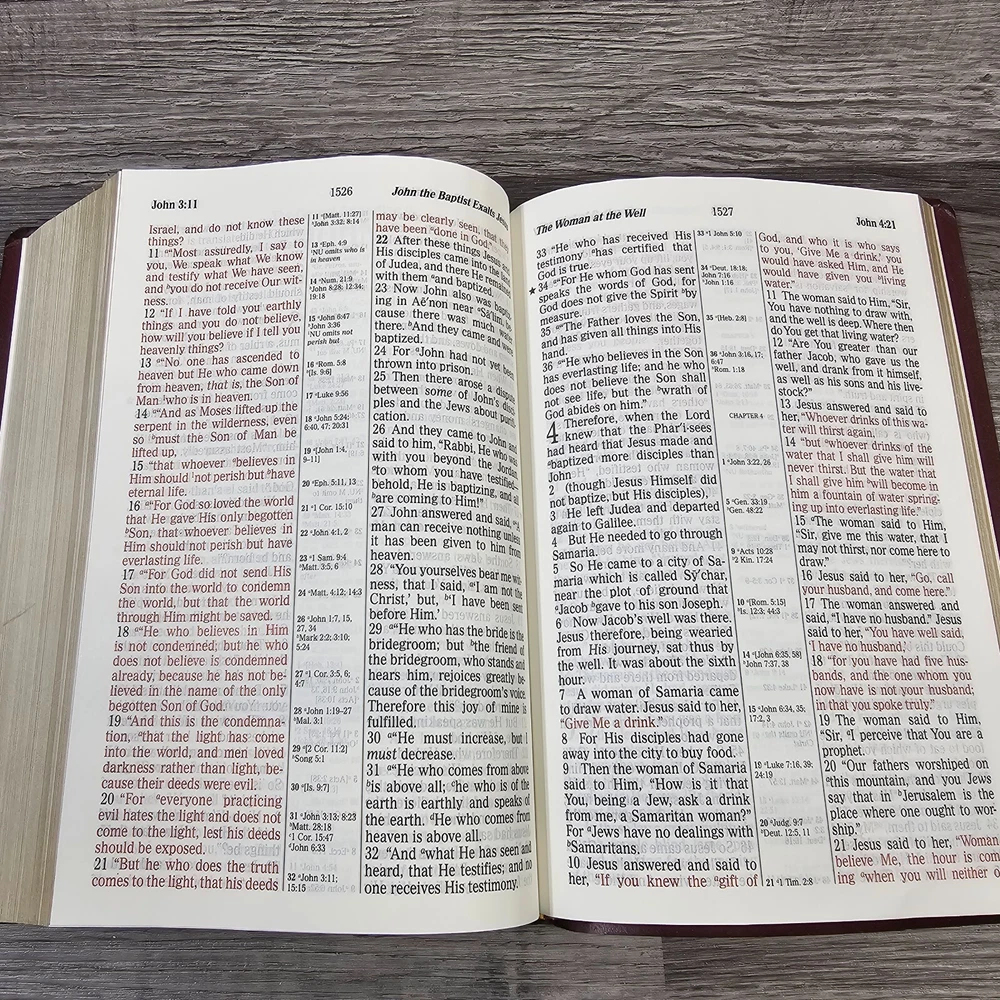 | Features | Faux Leather Bound, Large Print, Center-Column Reference, Textual Notes, Concordance, Red Letter |