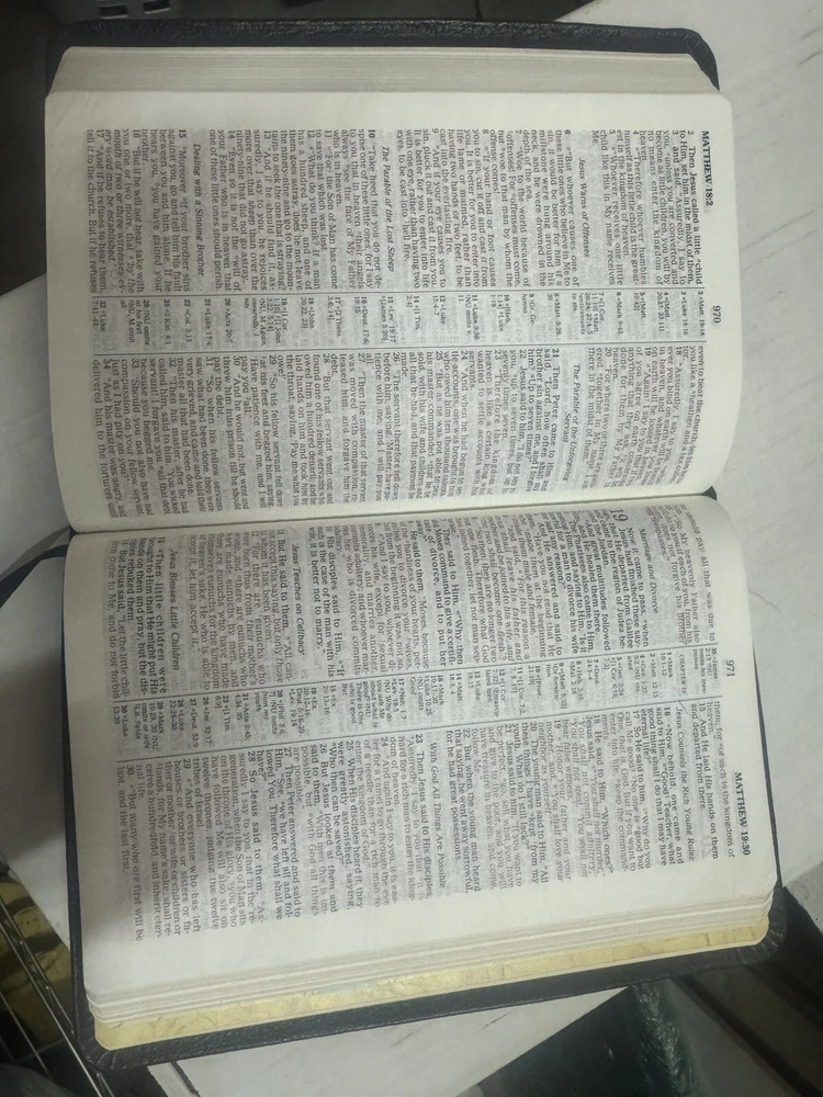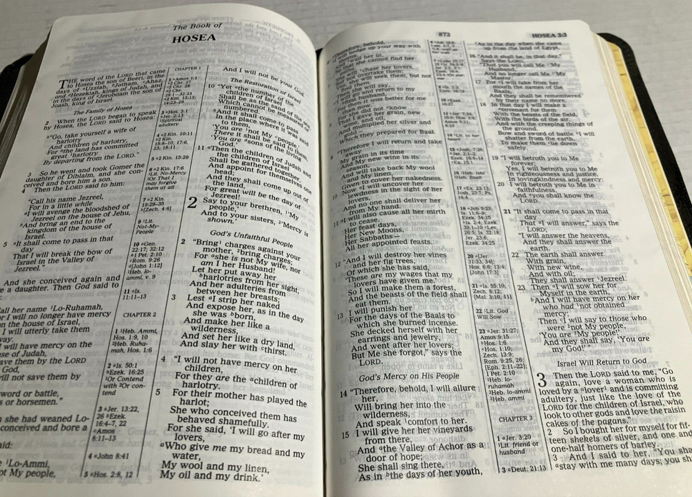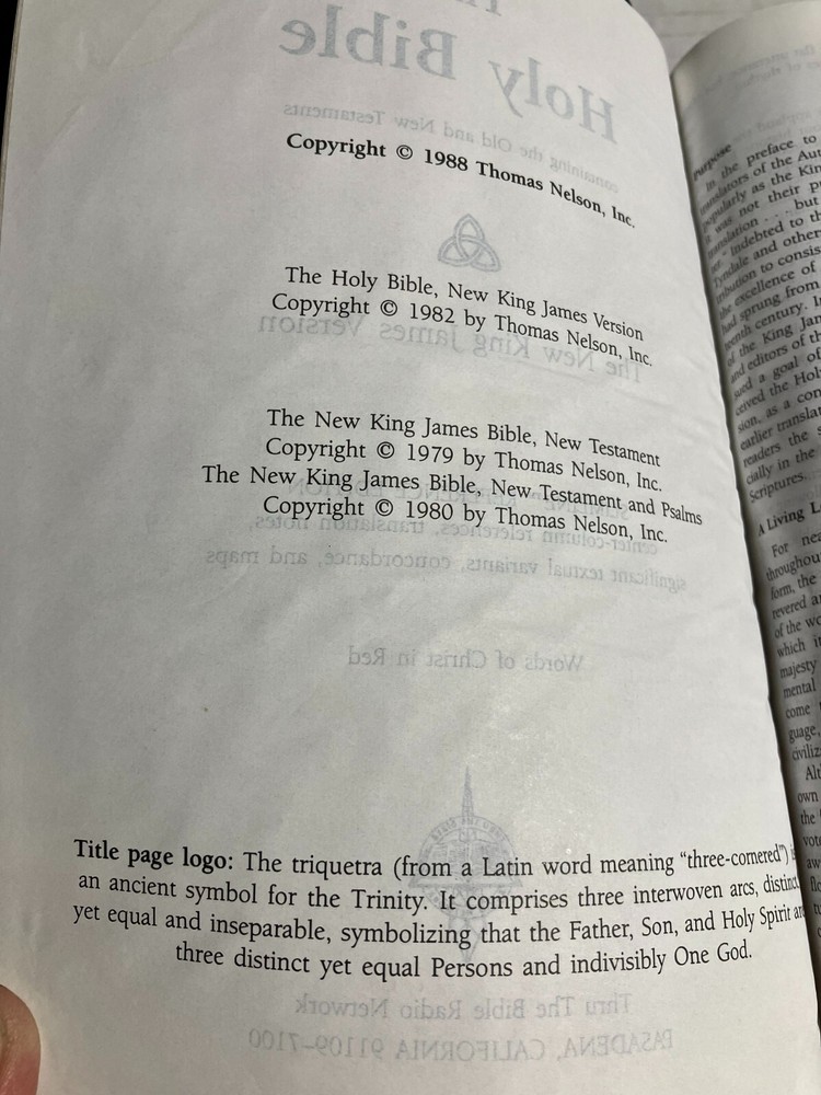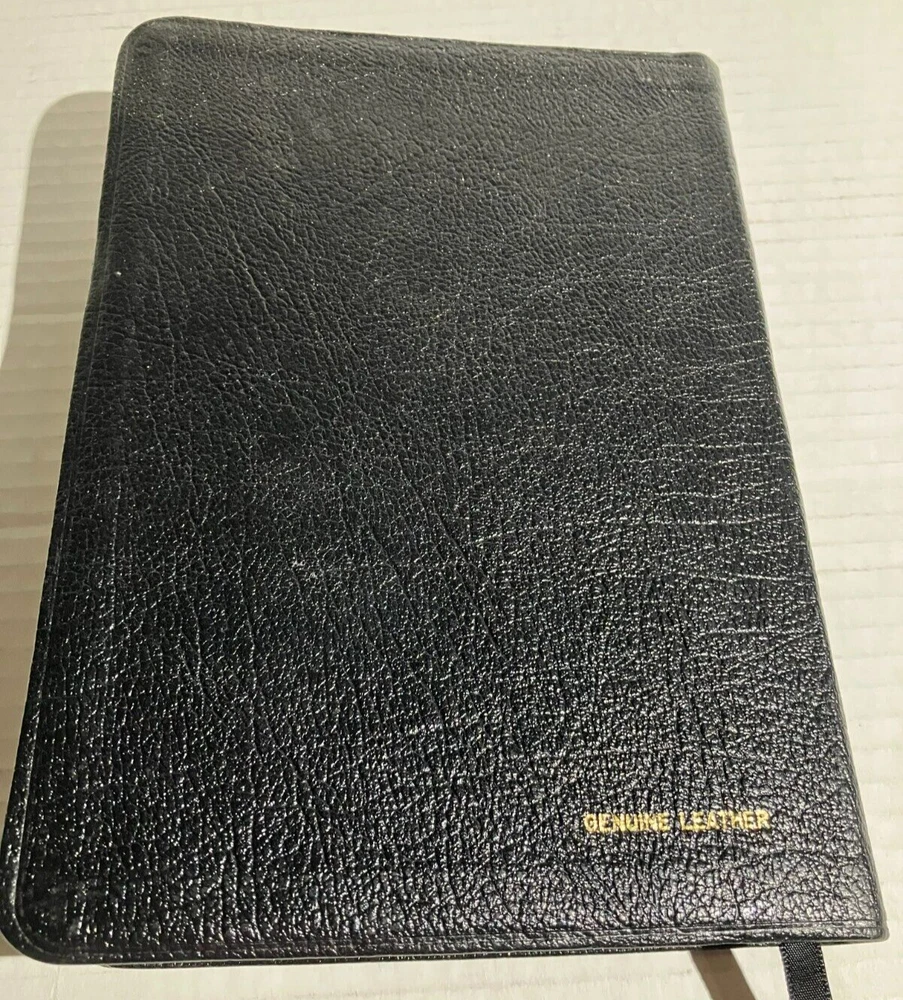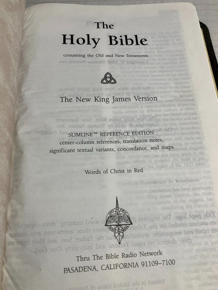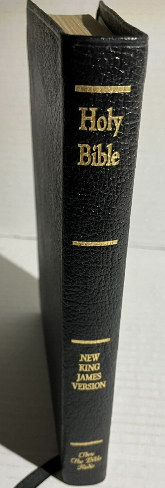 The Holy Bible NKJV Slimline Reference Edition 1988 Thomas Nelson, Inc. Leather B-76 Vintage leather bound book with minor signs of shelf wear & scuffing on cover. Good condition. Please see photos for more details.