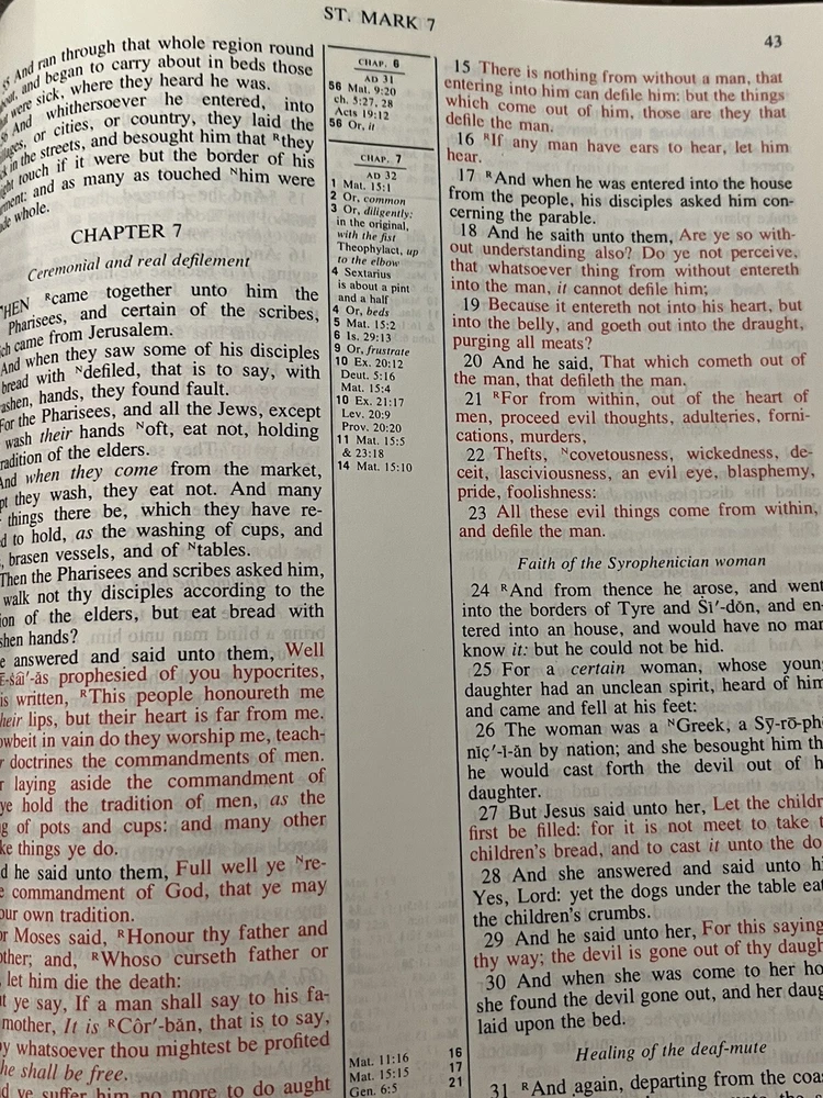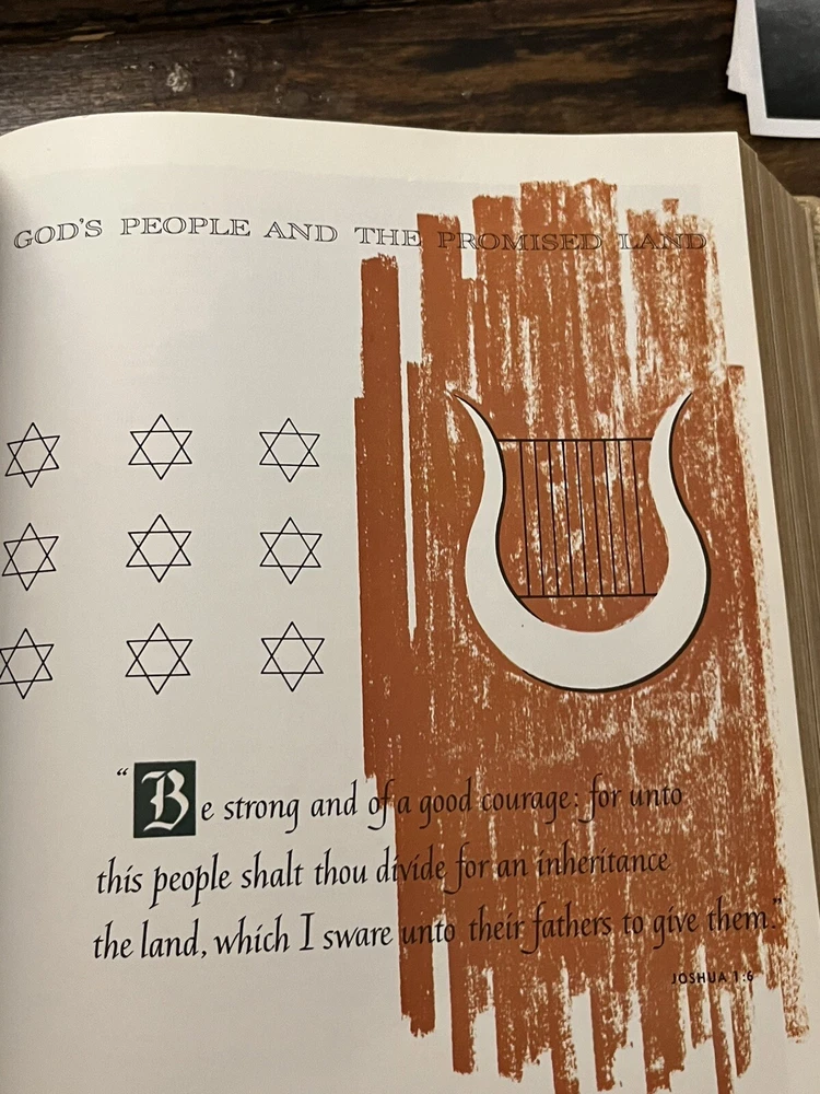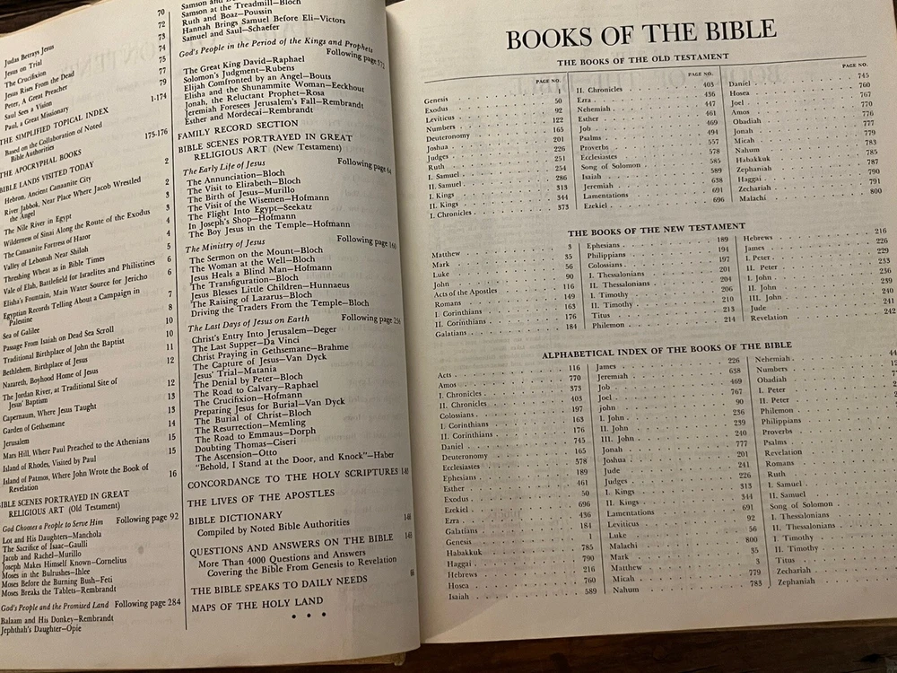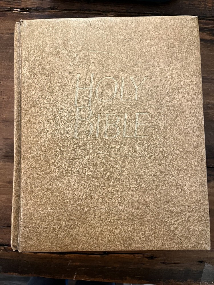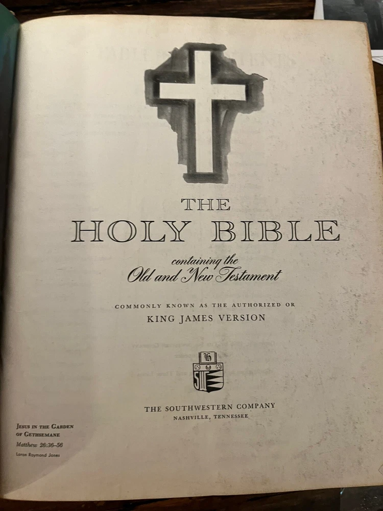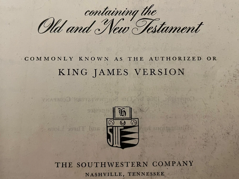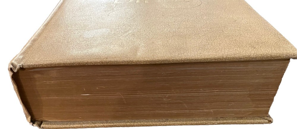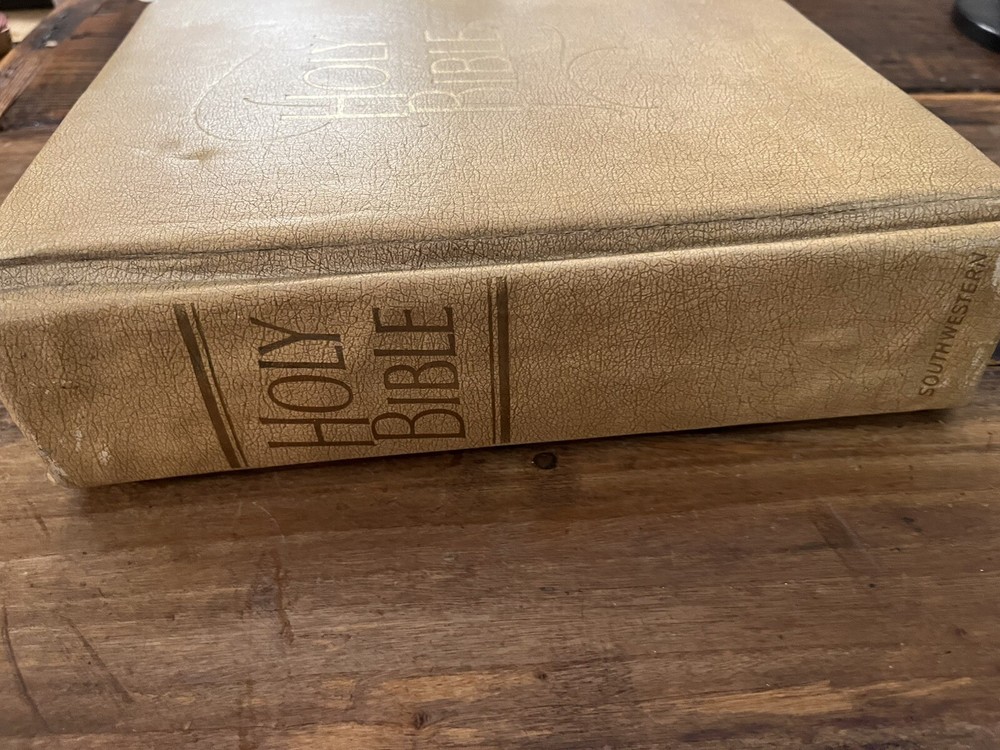 The product is a hardcover reference book titled "The Holy Bible Old & New Testament King James Version Hardcover 1966." It is a faux leather-bound illustrated edition of the New Testament, published in 1966 by Southwestern. The book is in English and part of a religious book series, featuring the King James Version translation. Some pages have been filled in and back inside cover has a pencil scribble.