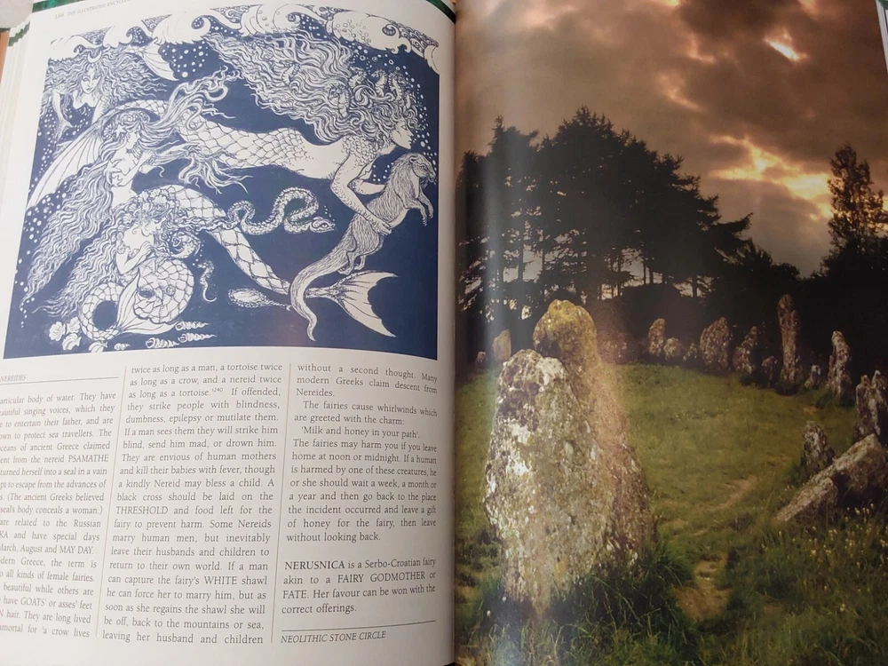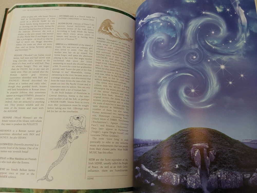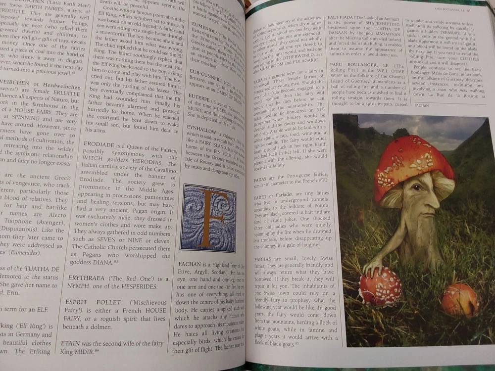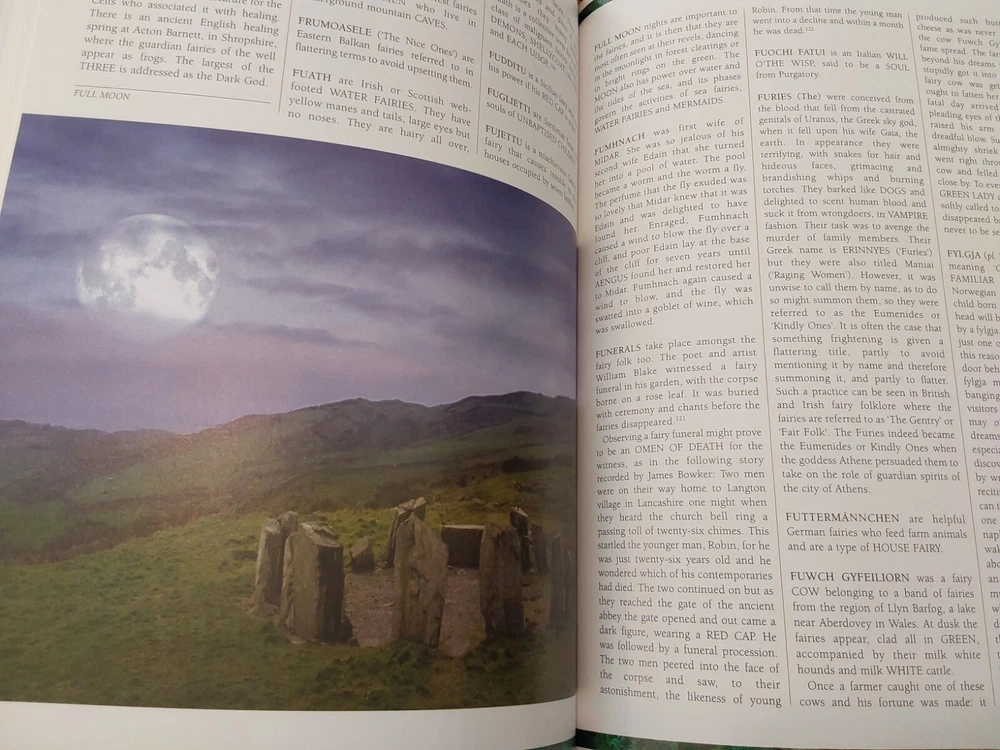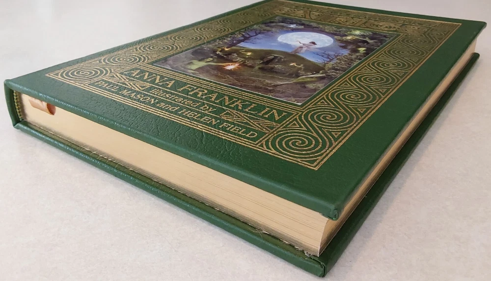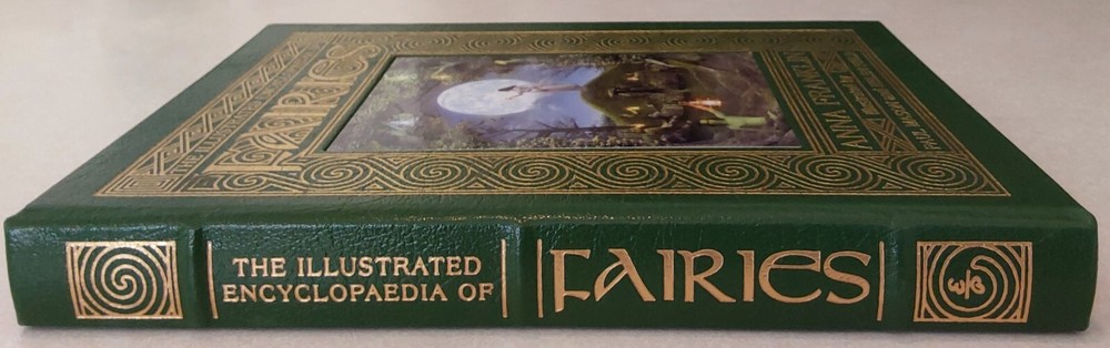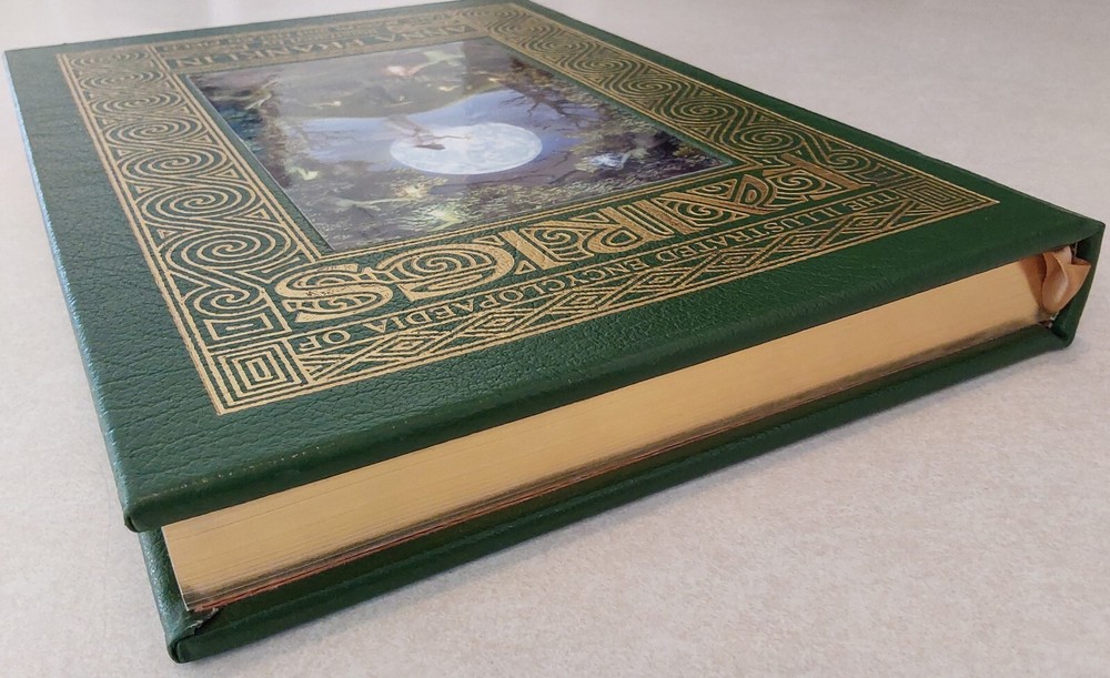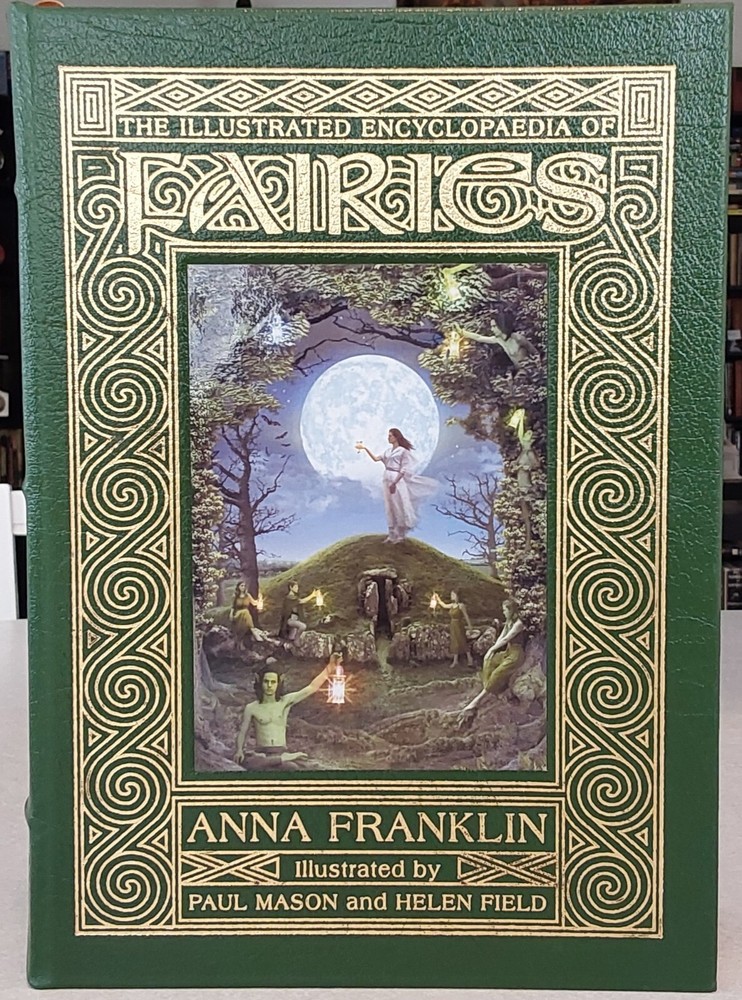 The Illustrated Encyclopedia of Fairies by Anna Franklin. Illustrated by Paul Mason and Helen Field. Norwalk, CT: The Easton Press/London: Paper Tiger, 2002. Green leather covers, with a pictorial center decoration on cover, along with gilt lettering and design on cover and spine, 3 raised bands on spine, gilt-edged text blocks, attached ribbon page marker, moire fabric end papers. With References, a Select Bibliography, List of Periodicals, Internet Sites, and Illustrations information at the back of the book, 288 pages. ISBN: 1-84340-240-8. Measures about 7 ¾” x 11.” Weighs alomost 3 1/2 pounds. The book looks like it was never read. No creases, tears, marks, or writing to pages. Pages are secure to the spine and binding is tight. Note that I have described the book as best as I can. Look closely at all photos for condition and details as they are also part of the description. Email with any questions.