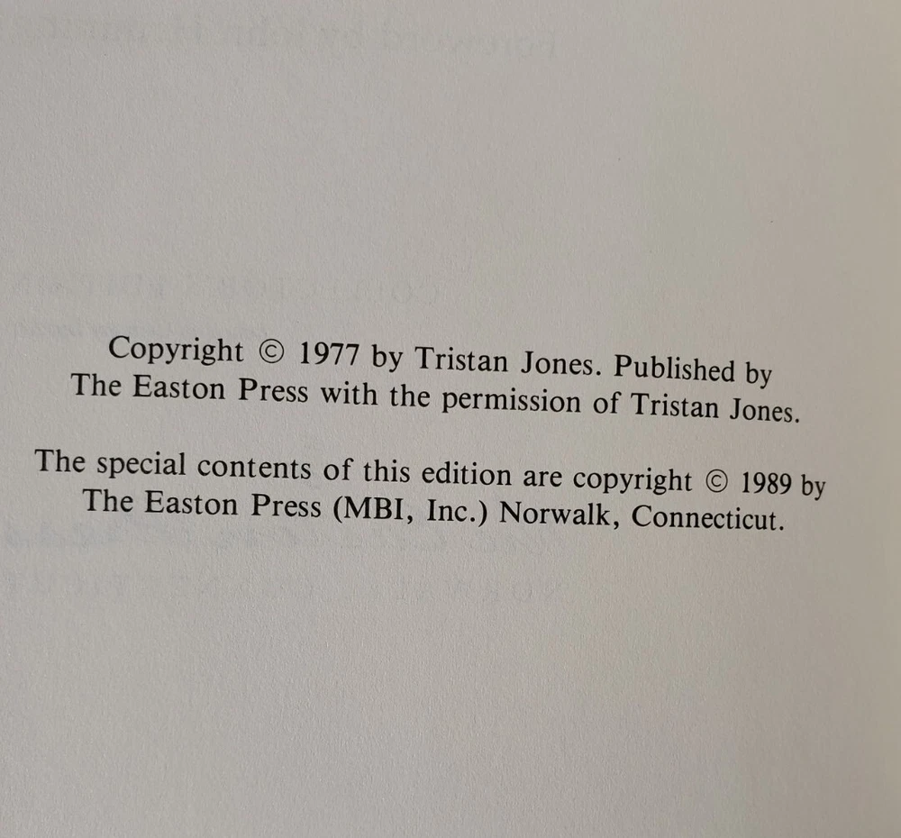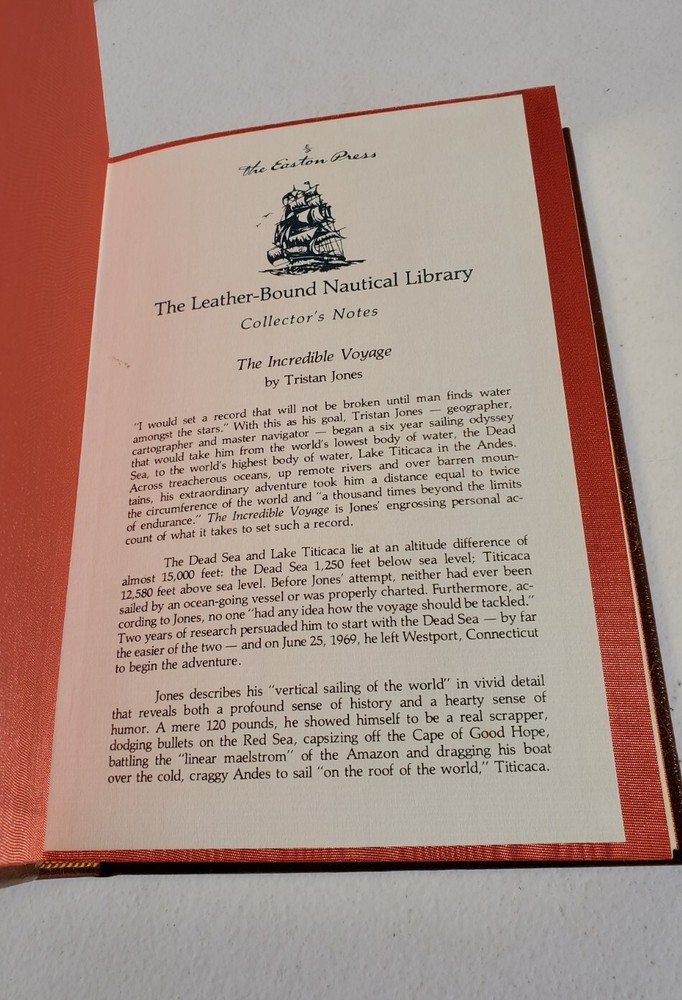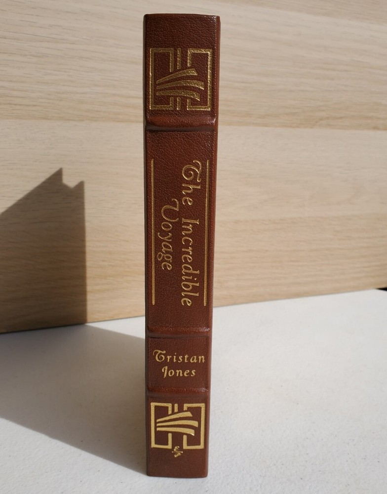 The Incredible Voyage by Tristan Jones Vintage Easton Press Nautical Library. Accented in 22kt gold, printed on archival paper with gilded edges, smyth sewing & concealed muslin joints. Bound In full leather with hubbed spines. A Limited Edition In a salty, slashing style, Tristan Jones unfolds his extraordinary saga— a six-year voyage during which he covered a distance equal to twice the circumference of the world —revealing both a rich sense of history and an insuppressible Welsh wit. Very good condition