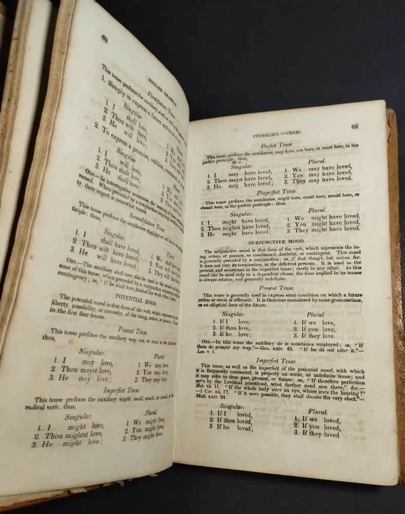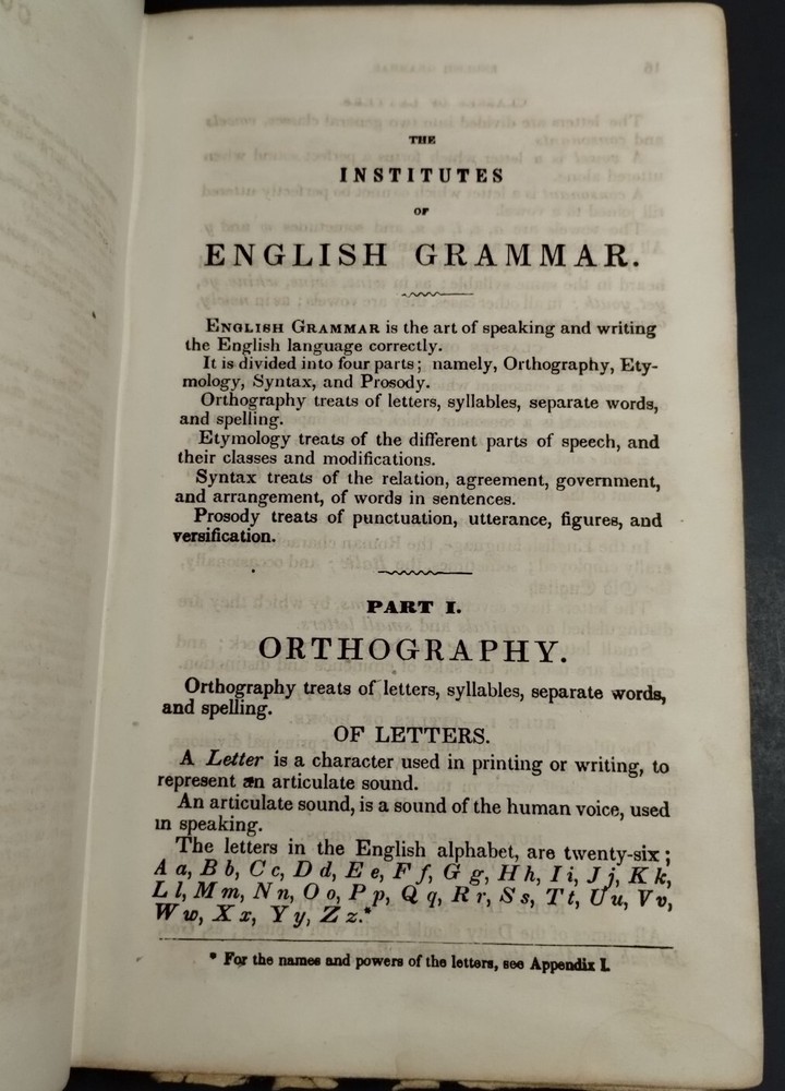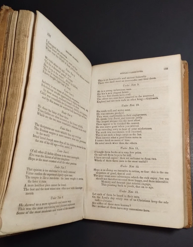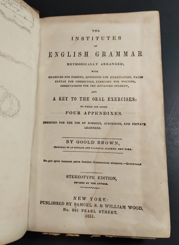 THE INSTITUTES OF ENGLISH GRAMMAR METHODICALLY ARRANGED By Goold Brown 1851 Hardcover. In good vintage condition, no writing on the text pages, excellent binding, natural page toning, marks or writing on the inside cover and first free page, edge wear and surface scuffs on the cover. Shipped with USPS Media Mail Package Thank You for stopping! Please check out my other items.