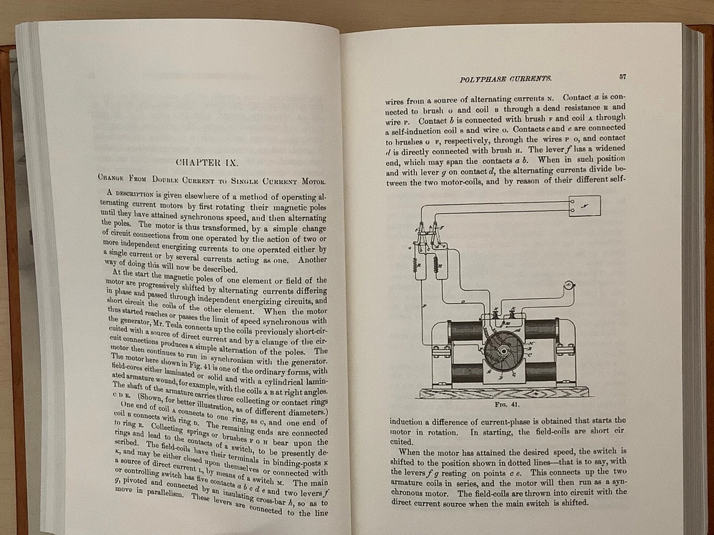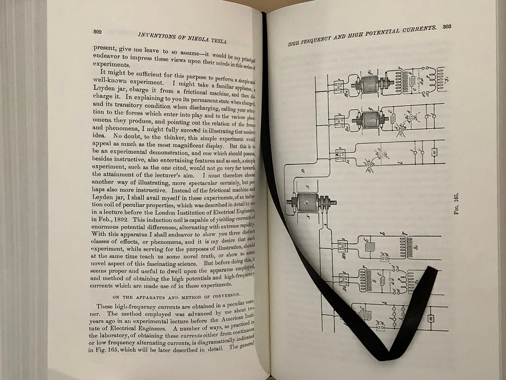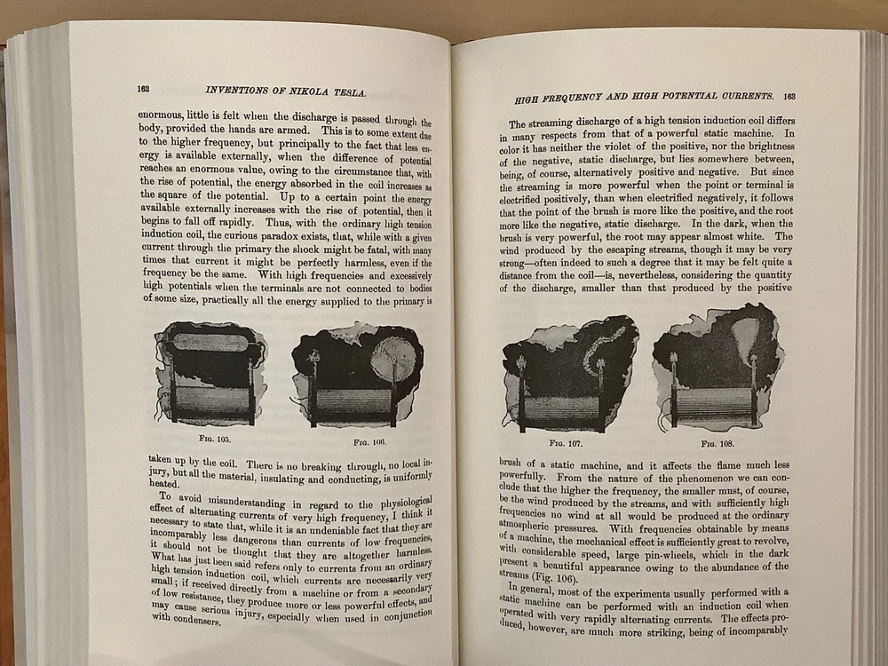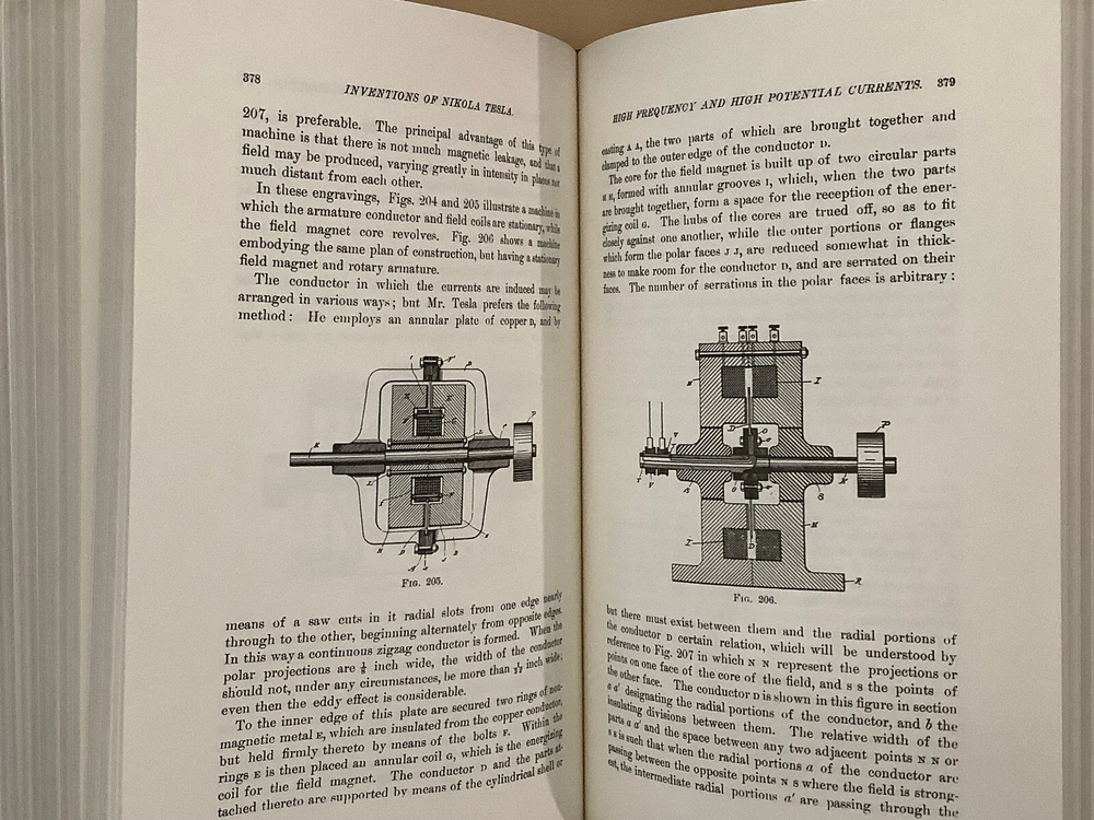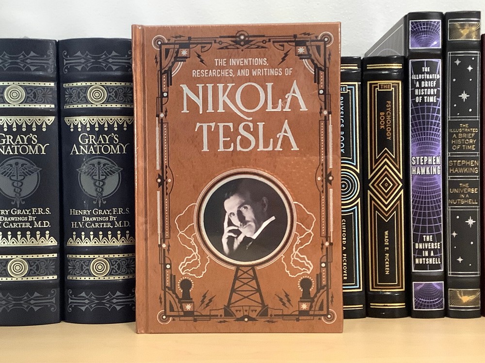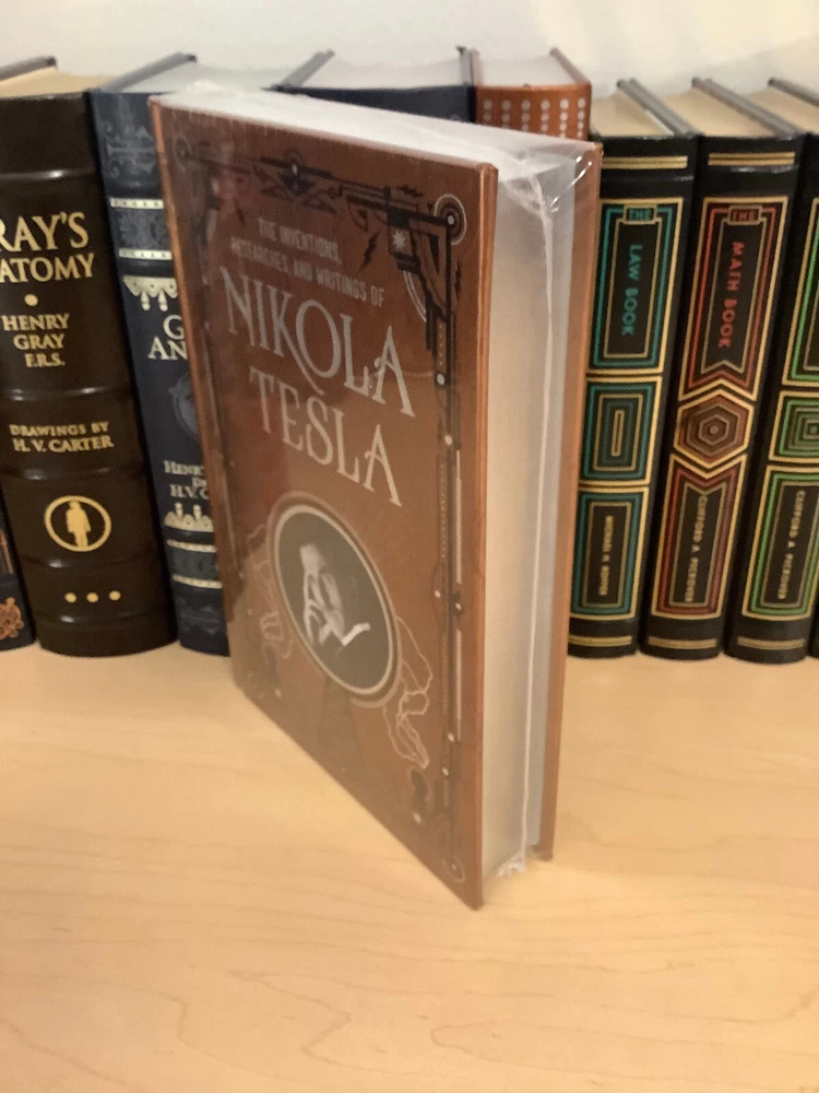 The Inventions, Researches and Writings of Nikola Tesla bound in leather, with silver edged pages and a ribbon marker Item Condition: This is a leatherbound hardcover, sealed. The seal is beginning to open and there are some flaws /dings to the silver page edging, and the corners are lightly bumped. Dimensions are approx: 9.25" x 6.25" x 1.25" This book will ship in a box with bubble wrap. Photos 1-8 are of the actual book that will be shipped, the rest are examples of the book from an open copy.