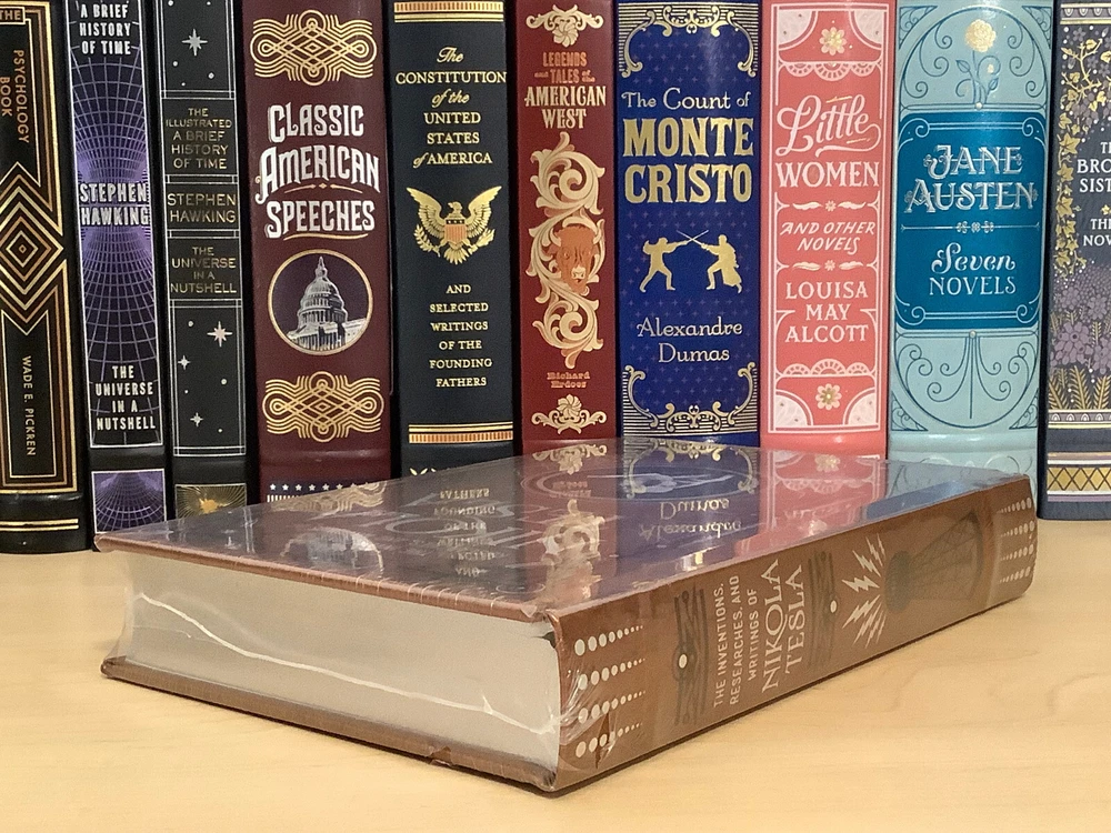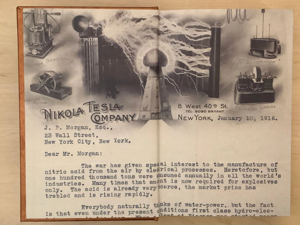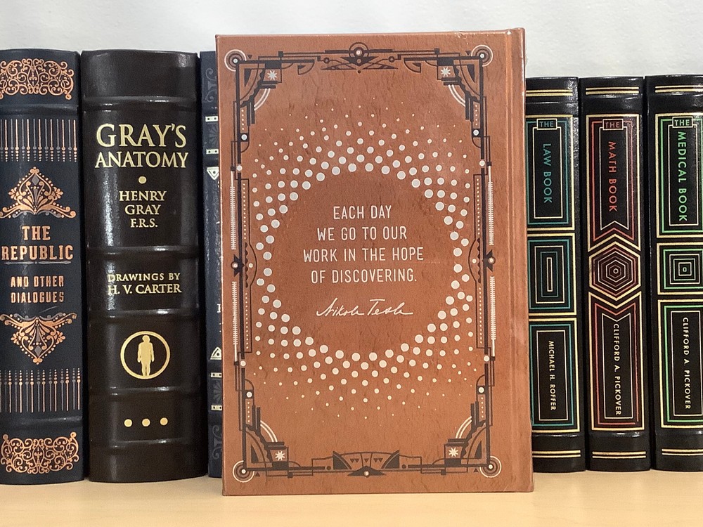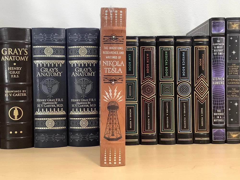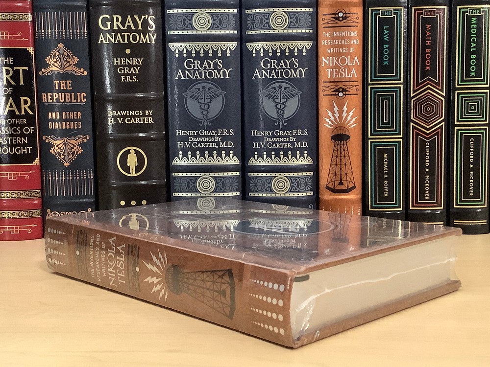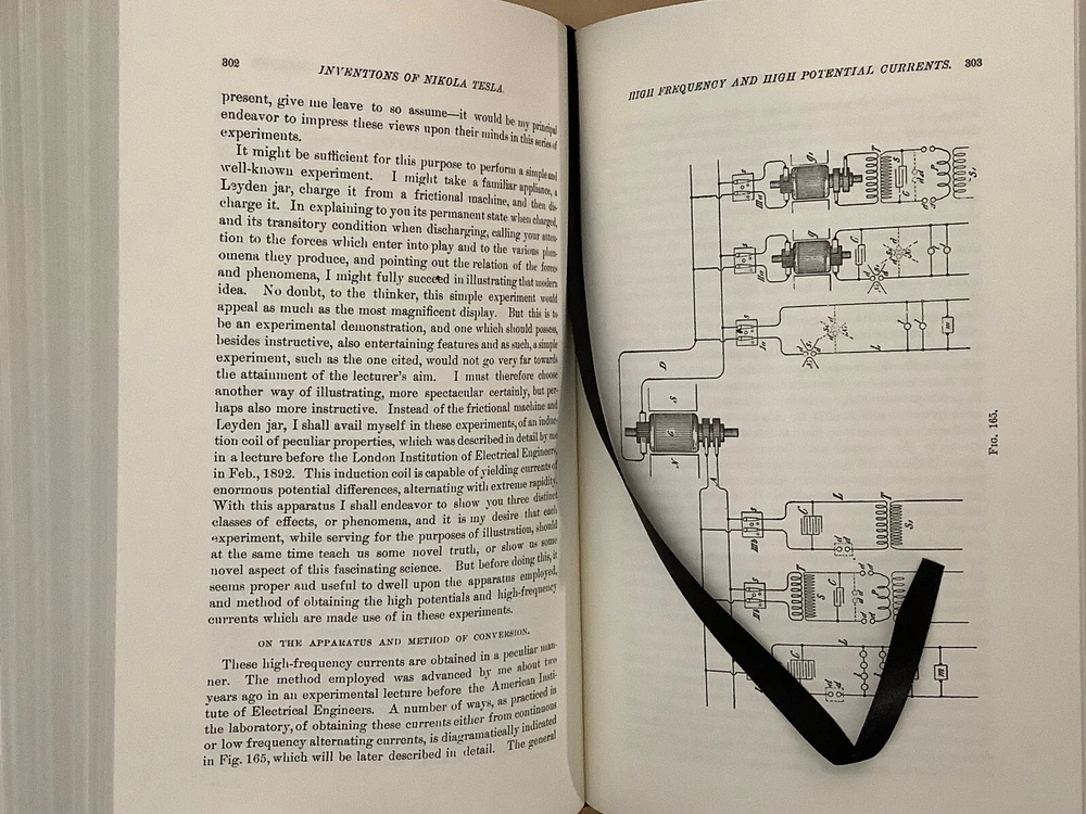 The Inventions, Researches and Writings of Nikola Tesla bound in leather, with silver edged pages and a ribbon marker Item Condition: This is a leatherbound hardcover, sealed. The seal is beginning to open and there are some flaws /dings to the silver page edging, and the corners are lightly bumped. Dimensions are approx: 9.25" x 6.25" x 1.25" This book will ship in a box with bubble wrap. Photos 1-8 are of the actual book that will be shipped, the rest are examples of the book from an open copy.
