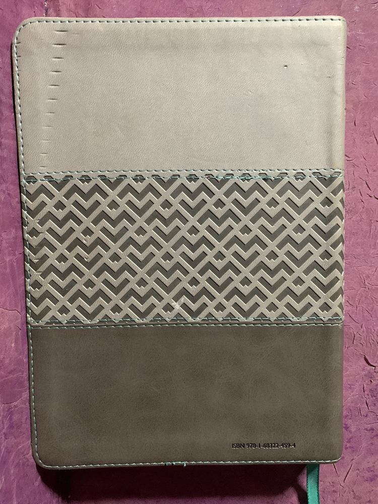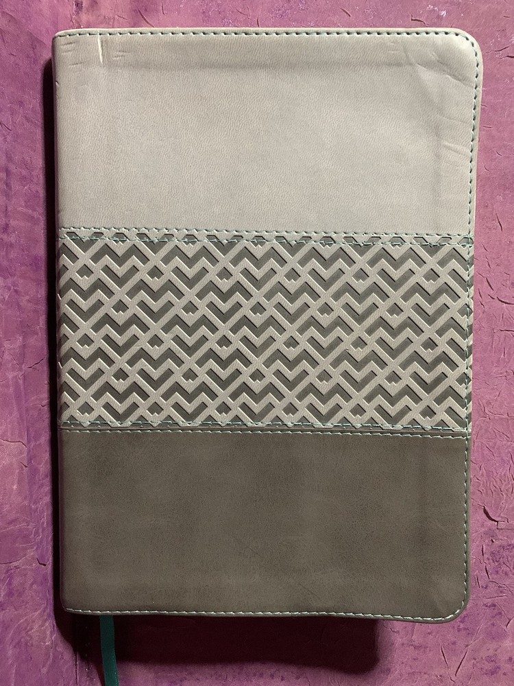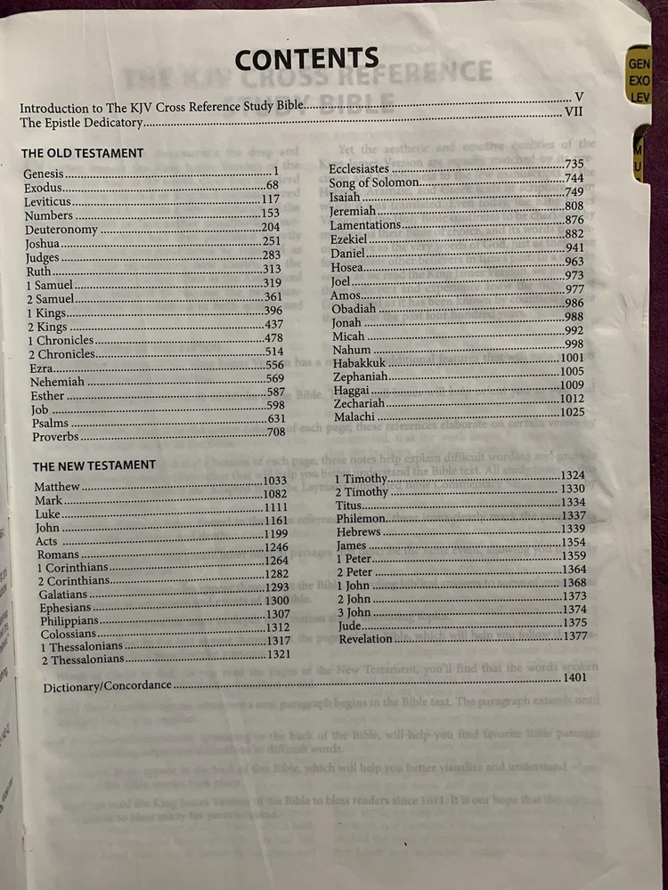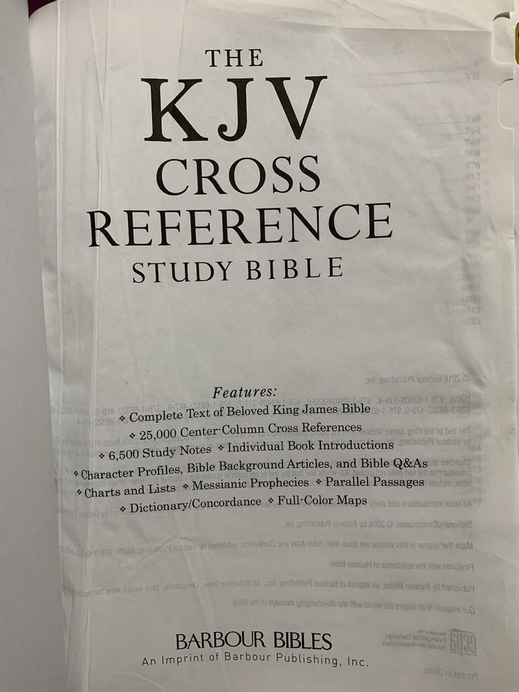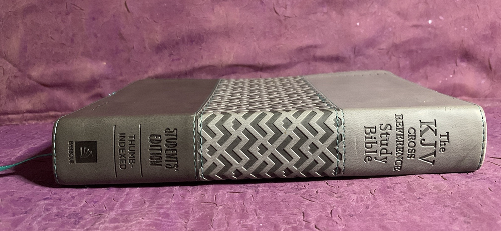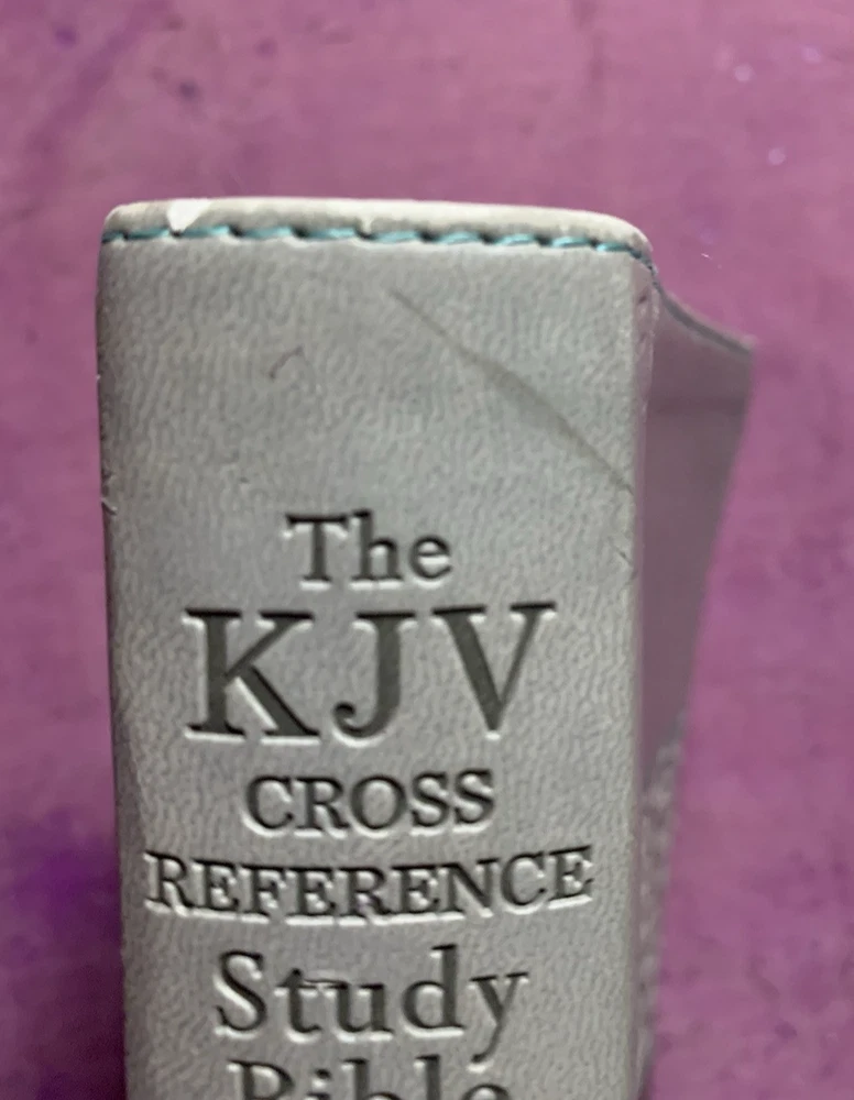 The KJV Cross Reference Study Bible Students' Edition Thumb-Indexed Two-toned Grey Red Letter Edition Teal ribbon bookmark No markings or missing pages found. Scuff marks on the upper front corner, Upper spine, and upper half of the back cover. The text itself is in excellent condition, and the first two pages have wrinkles (see pictures).