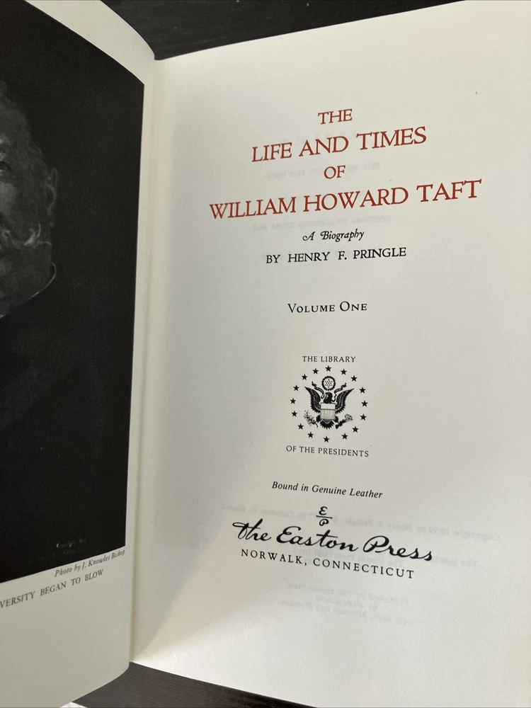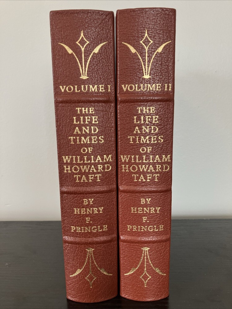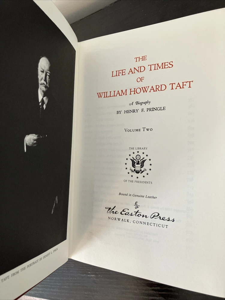 The "Life and Times of William Howard Taft" by Henry F. Pringle is a collector's edition leather-bound book published by Easton Press in 1986. This original edition in English is a biography of the 27th President of the United States, offering a detailed account of his life and times. It is a personalized and valuable addition to any collection, highlighting the history and accomplishments of one of North America's most influential political figures. This two volume set is in excellent condition. Both volumes embossed by previous owner.