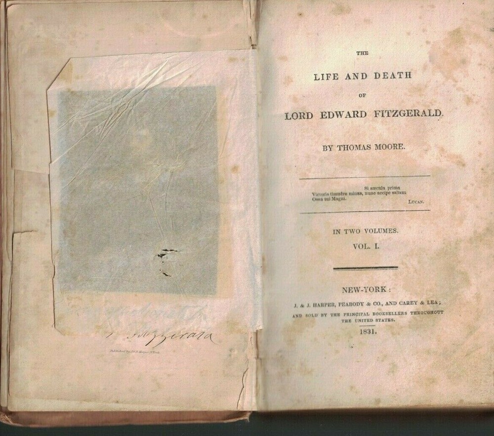 The Life & Death of Lord Edward Fitzgerald HC Thomas Moore 1831 Volume 1 Great book. From a two-volume set, volume one only. From J&J Harper Peabody & Co