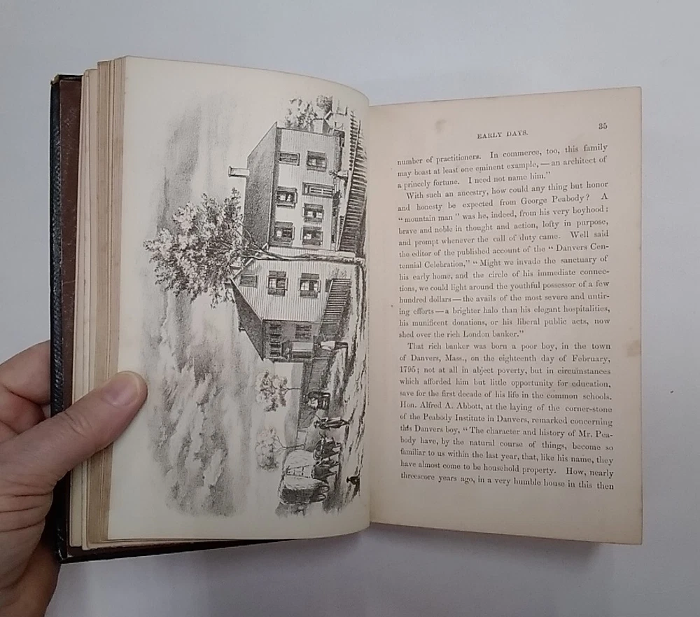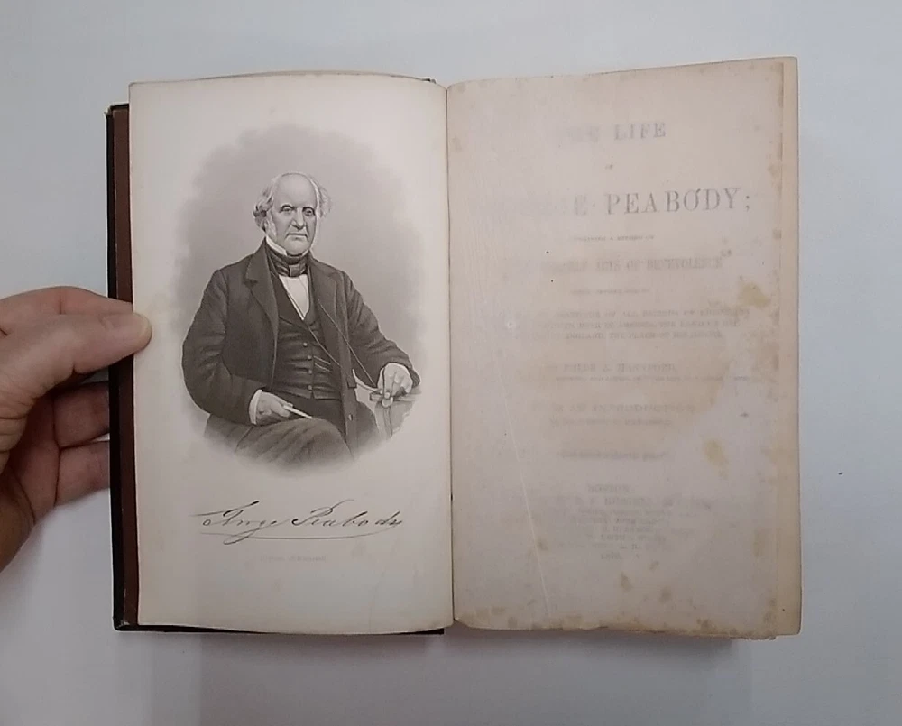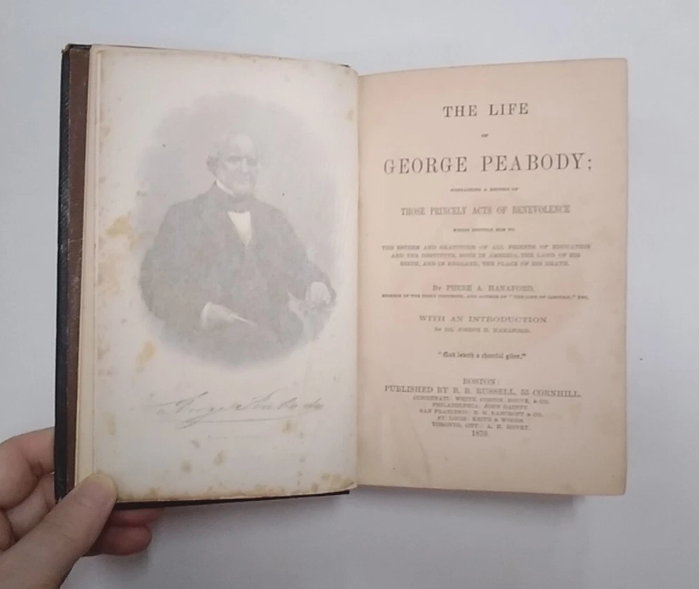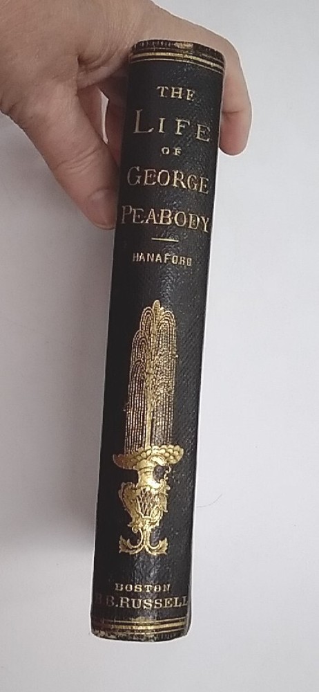 "The Life Of George Peabody," by Phebe A. Hanaford. Introduction by Joseph H. Hanaford. Leather, Embossed, pub. 1870 by B.B. Russell. 7.5 inches by 5 inches, 308 pages. Good Condition. Light wear on cover. Some age-related discoloration of a few pages. Otherwise clean text block. is intact. See photos for details.