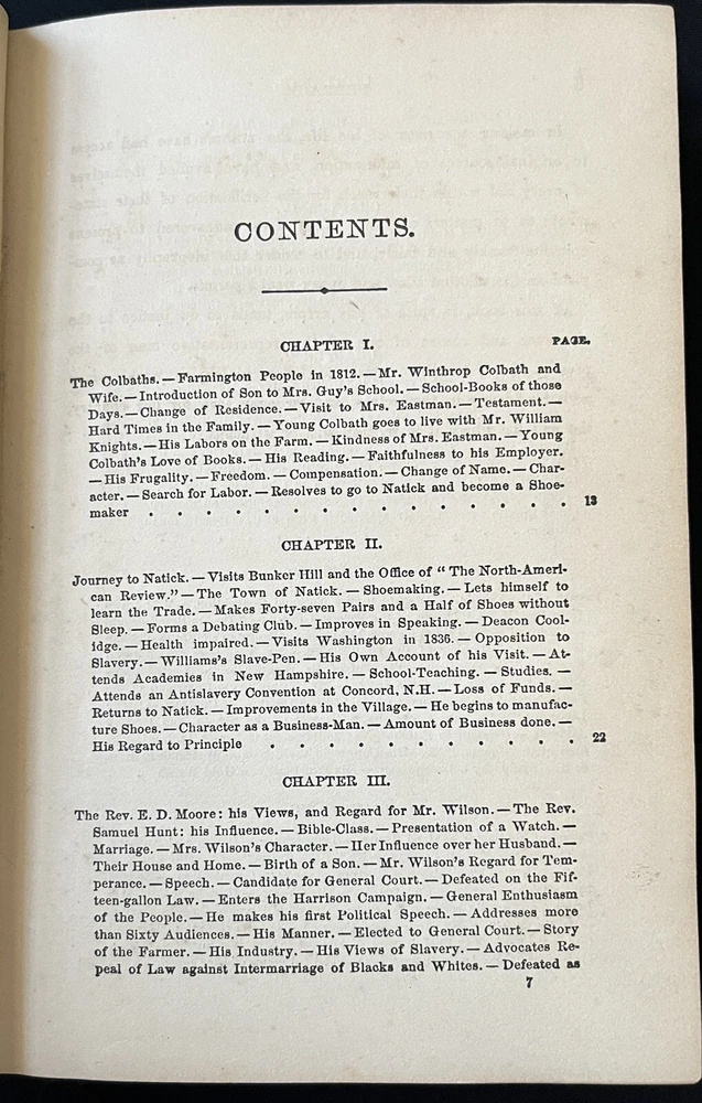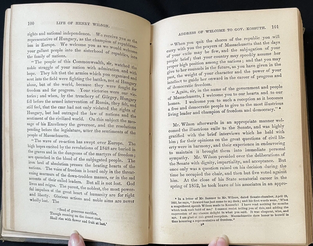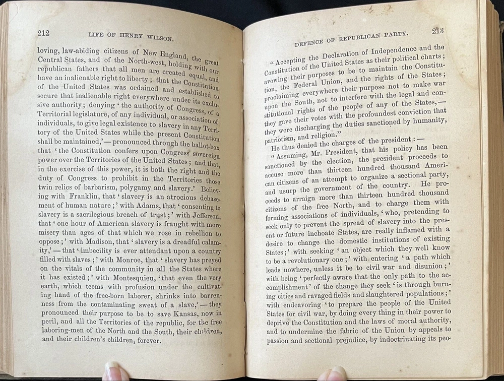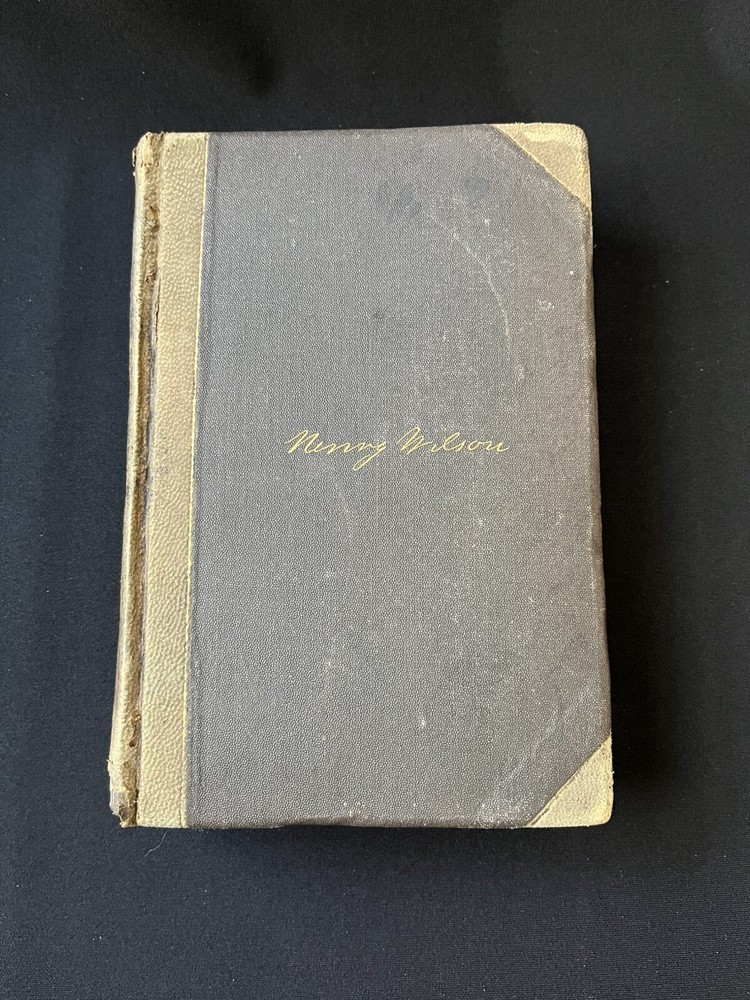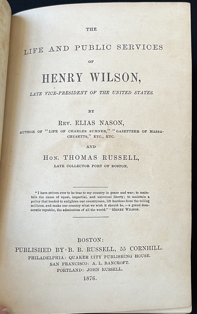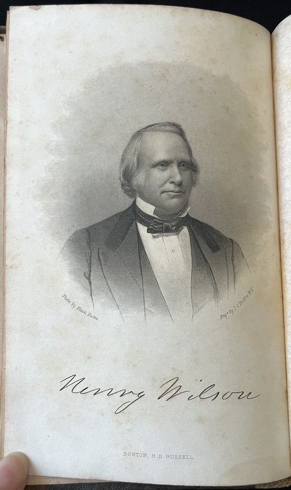 "The Life & Public Services of Henry Wilson" is a leather-bound book published in Boston in 1876 by B.B. Russell. Written by Elias Nason & Thomas Russell, it is an illustrated biography about Henry Wilson who was a previous Vice President of the United States. The book contains illustrations/engravings. The book has leather over the spine and capping the corners. The leather over the spine has substantial wear and the bottom has chipped off. There is no evidence of red rot. The leather over the corners and the boards have wear consistent with the book’s age. Pages have lightly tanned. I saw 1 page with a circle (by pencil) around the text. no other marks or tears were observed. There is a damp stain on the upper corner of some pages (the size of the stain varies but does not go beyond the margins).