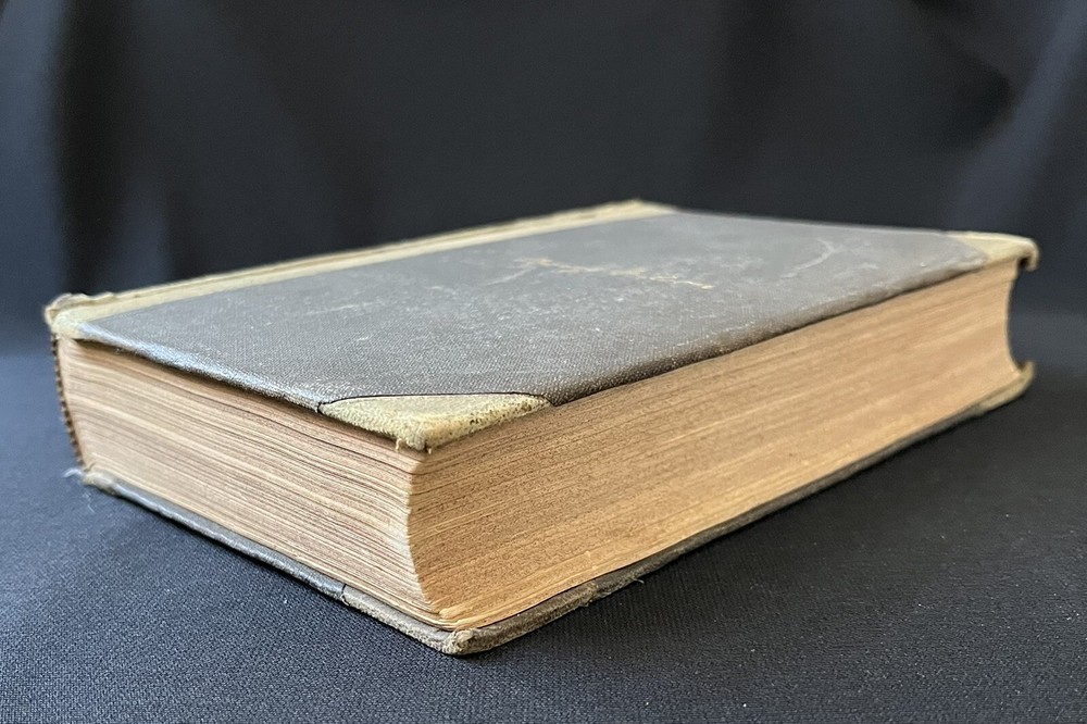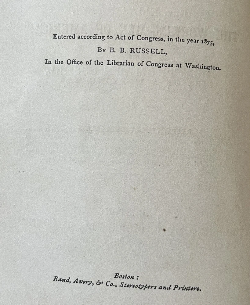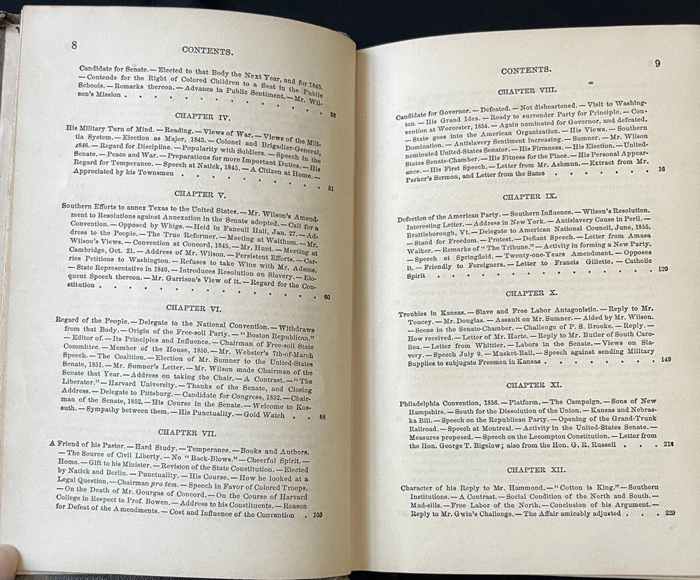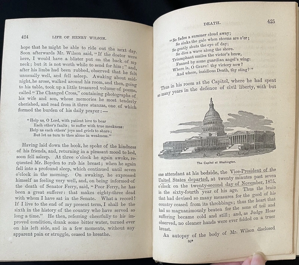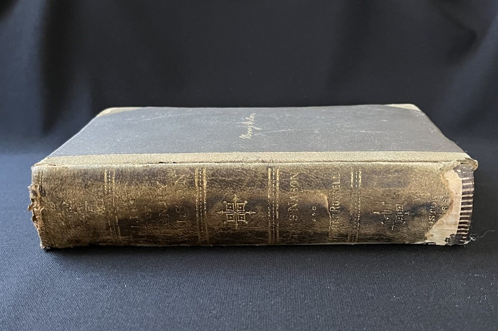 "The Life & Public Services of Henry Wilson" is a leather-bound book published in Boston in 1876 by B.B. Russell. Written by Elias Nason & Thomas Russell, it is an illustrated biography about Henry Wilson who was a previous Vice President of the United States. The book contains illustrations/engravings. The book has leather over the spine and capping the corners. The leather over the spine has substantial wear and the bottom has chipped off. There is no evidence of red rot. The leather over the corners and the boards have wear consistent with the book’s age. Pages have lightly tanned. I saw 1 page with a circle (by pencil) around the text. no other marks or tears were observed. There is a damp stain on the upper corner of some pages (the size of the stain varies but does not go beyond the margins).