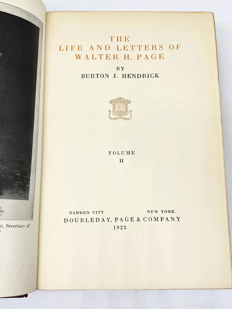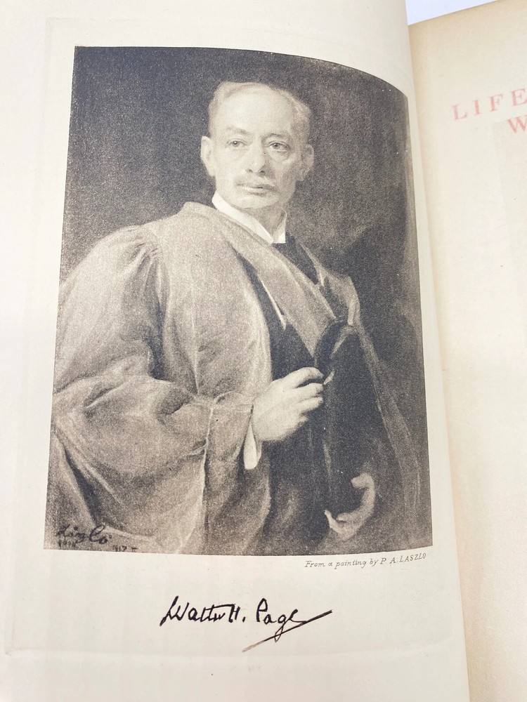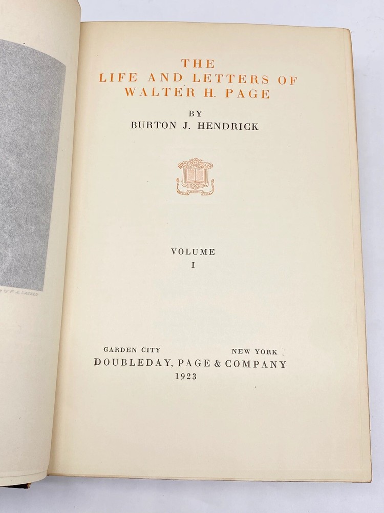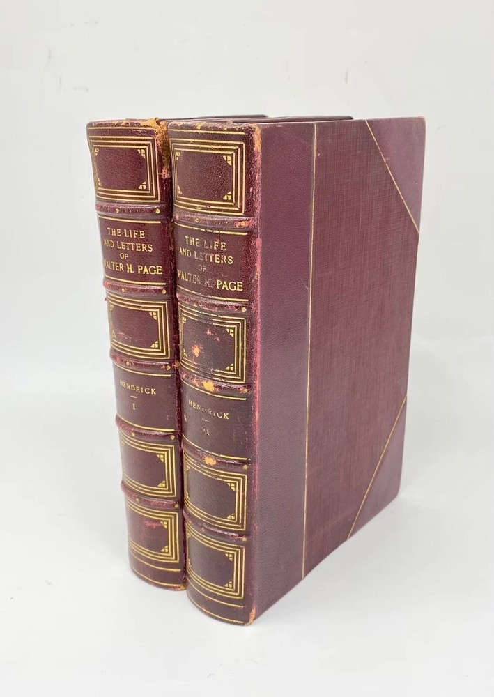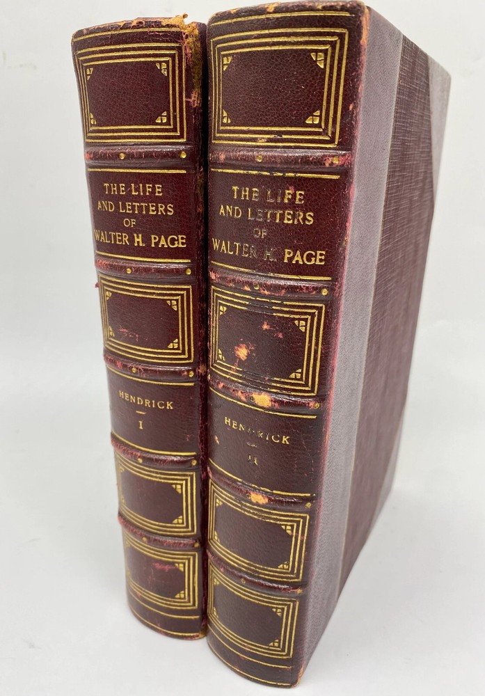 This is a 2 volume leather bound set of The Life and Letters of Walter H. Page by Burton Hendrick. This book set was published in 1923 by Doubleday, Page & Company. This book is three quarter bound in red leather with raised bands on the spine and gilt titling and decoration. The book is about the life of US Ambassador and Publisher Walter Page. This book is in good to very good condition with minor wear throughout. The hinges have some moderate wear. There is some gilt loss on the leather, particularly on the spine of volume 2. Overall, this is a good looking set.