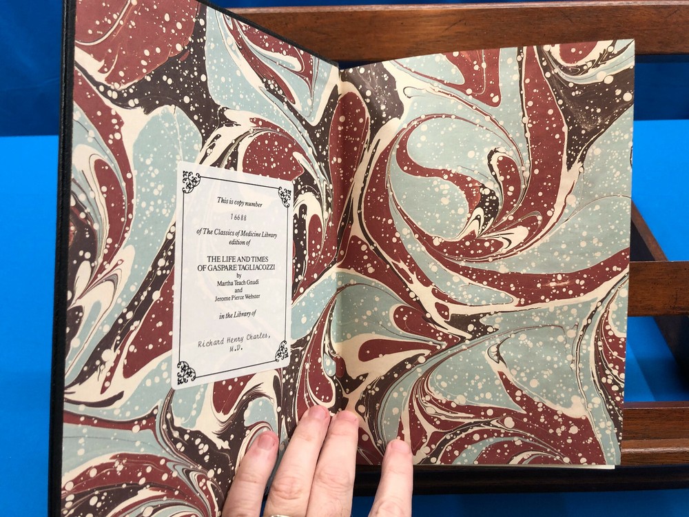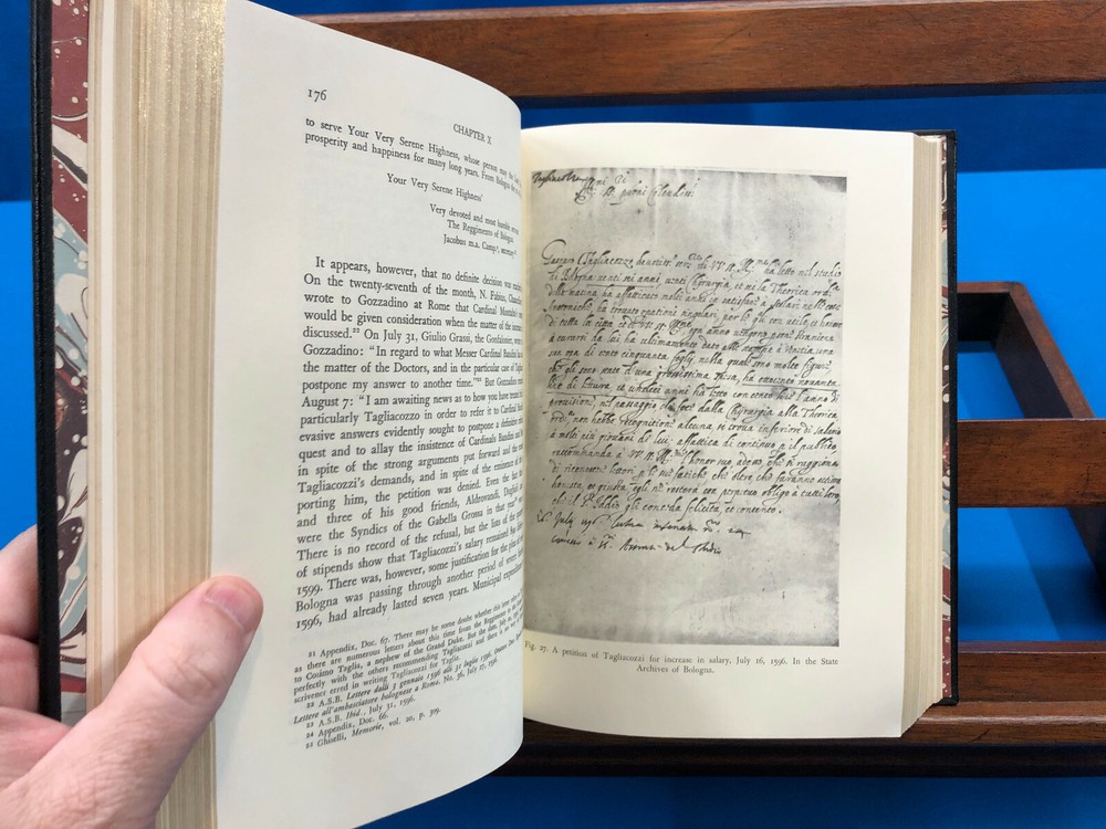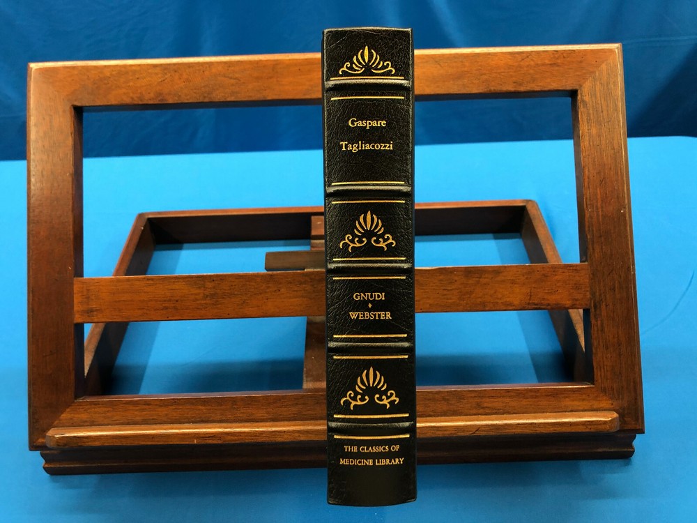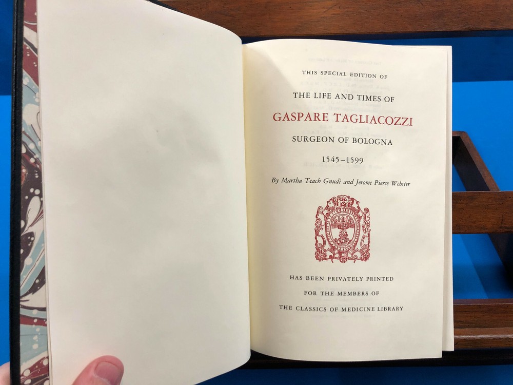 The Life and Times of Gaspare Tagliacozzi, Surgeon of Bologna, 1545-1599- Martha Teach Gnudi & Jerome Pierce Webster, 1989, The Classics of Medicine Library , Published by Gryphon Editions, Inc. , in Very Good condition. All edges gilt. Gilt illustrations on boards and spine. Gilt lettering on spine. 5 raised bands on spine. Some wear to leather with gilt decorations wearing off in spots. Built-in ribbon bookmark. Previous owner's bookplate inside. Copy number 16688 of this book in the Classics of Medicine series. Check out my other items. Shoppers within the United States can add my items to their cart, and request an invoice for combined shipping at checkout! Internal Code: MBS10