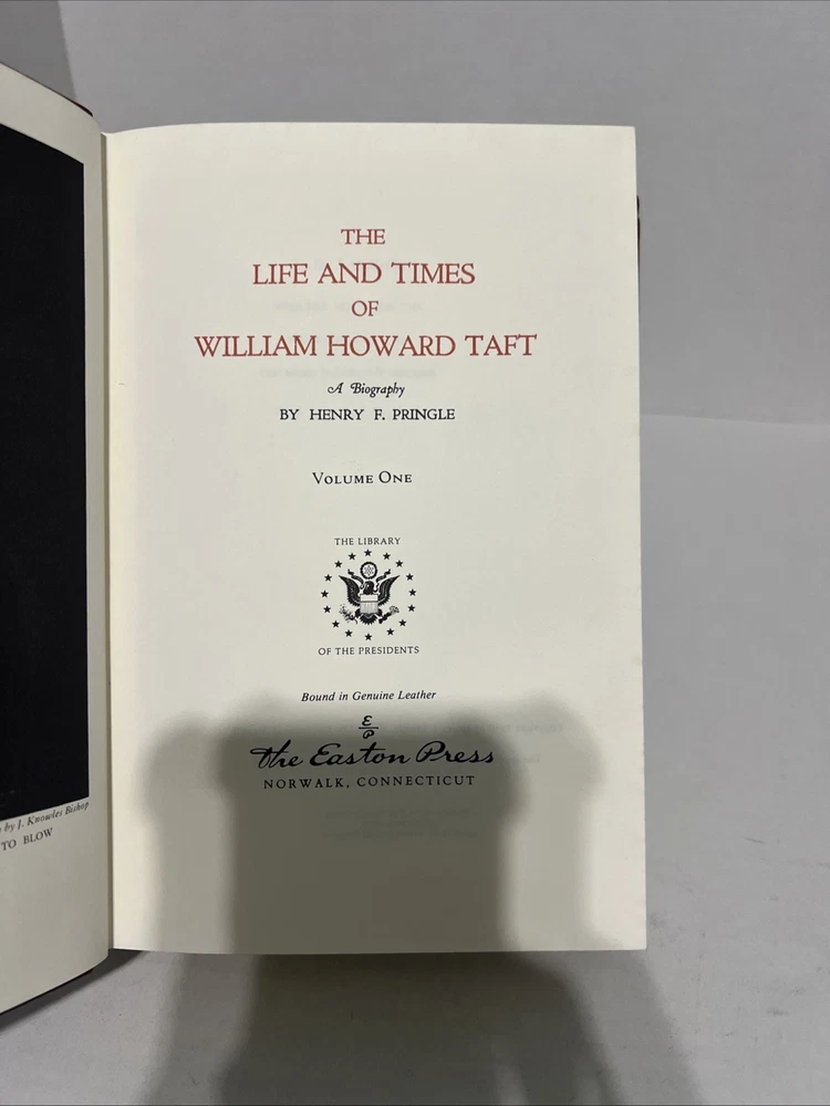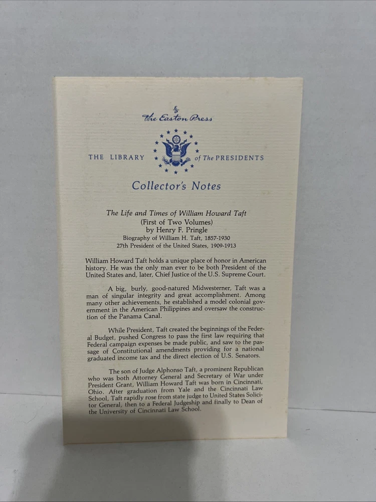 Dive into the political landscape of early 20th-century America with "The Life and Times of William Howard Taft: Vol 1," a comprehensive biography by Henry F. Pringle. Published by Easton Press in 1986, this collector's edition offers a detailed examination of Taft's life, presenting a wealth of information for those interested in presidential history and biographical accounts. Crafted with quality in mind, this leather-bound volume is a testament to the craftsmanship of Norwalk, Connecticut's Easton Press. It stands as a tribute to the influential figures of North America, capturing the essence of a pivotal era in English language literature, all while enhancing any collection with its majestic presense.