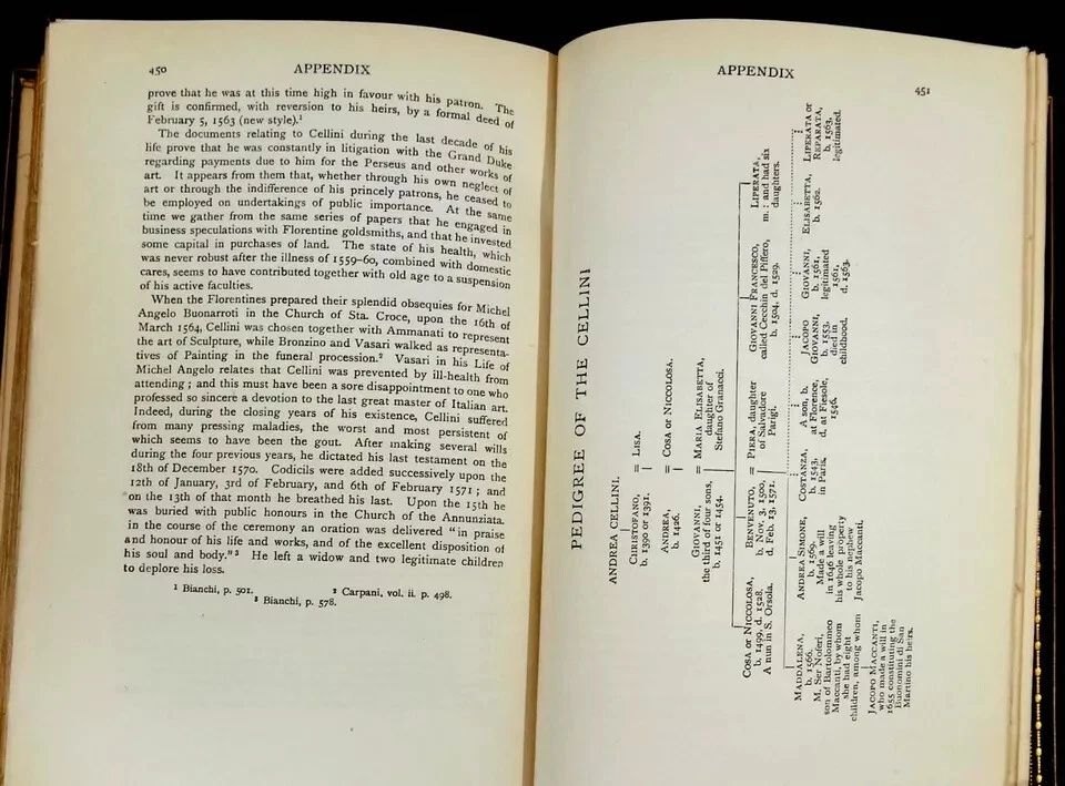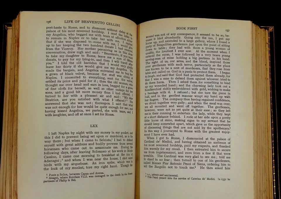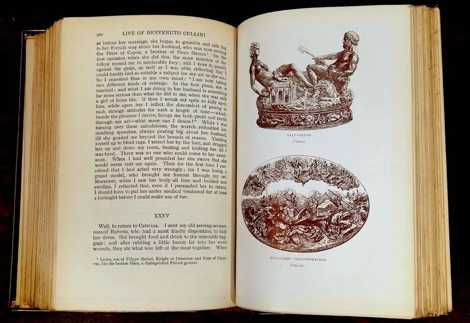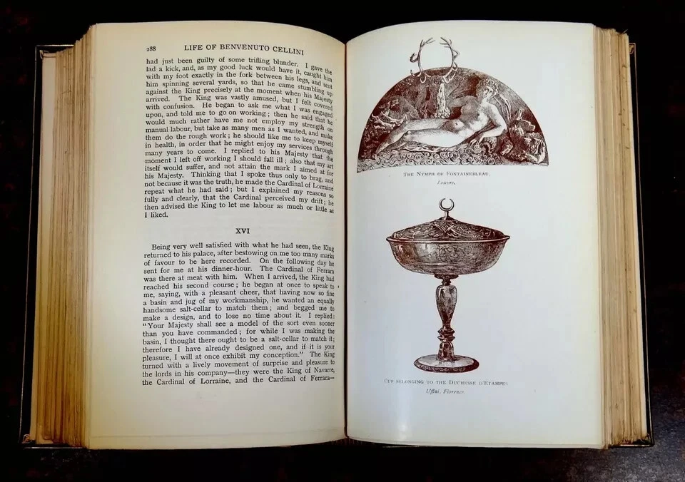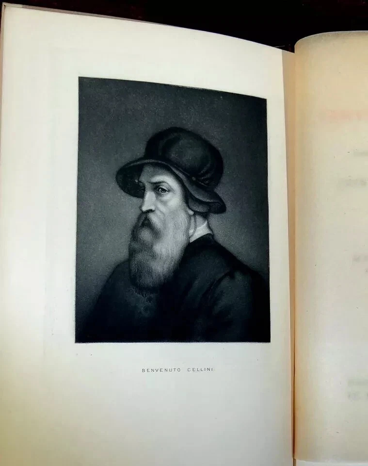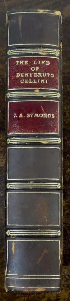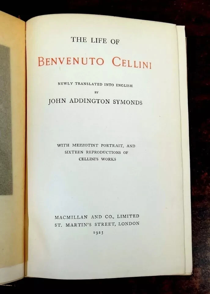 The Life of Benvenuto Cellini. Newly translated into English by John Addington Symonds. Published by Macmillan and Co., London, 1923. Brown leather over boards with title in gilt on spine, between 5 raised bands. Top edge of block of pages gilded. 5 1/2" x 8." 464 pages. Illustrated with mezzotint portrait and 16 reproductions of Cellini's works. Condition: Scuffing to leather, fading to spine and edges of boards, wear to edges. Front inner hinge partially loose, pages lightly yellowed. In good+ condition. Binding tight and square. Pages clean.