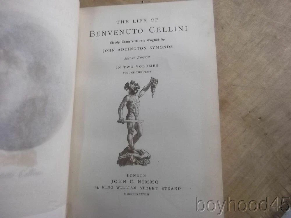 The Life of Benvenuto Cellini Trans. by J.A. Symonds-2 Vol, Set Leather Description The Life of Benvenuto Cellini Trans. by J.A. Symonds-2 Vol, Set Leather I am selling the 2-volume set of "The Life of Benvenuto Cellini" translated by John Addington Symonds. Published by John C. Nimmo, London, 1888, second edition. Bound in half leather. Some light wear/leather loss to corners and bottom edges. Gutters show wear, but are not cracked. Clean, tight. A nice set!! I will call the books VERY Good. Books measure 5 1/2 X 7 5/8. A few complete sets can be found on other internet booksites for upwards of $200!!! I will offer this very nice 2-volume LEATHERBOUND set for only $100.00 plus $5.00 S&H in the US. PLEASE NOTE: SHIPPING FOR THIS 2-VOLUME SET WILL BE $5.00. Shipping costs Canada will be considerably less than the general international rates quoted. Thanks for shopping mellowpagesrarebooks.com Payment I accept the following forms of payment: PayPal Shipping & Handling I will ship Priority for an additional fee upon request. PLEASE NOTE: SHIPPING COSTS FOR MULTI-VOLUME SETS OR OVERSIZED BOOKS WILL EXCEED THE STANDARD "US SHIPPING" ECONOMY RATE OF $5.00. COST OF SHIPPING OVERSIZED BOOKS OR MULTI-VOLUME SETS ARE SPECIFIED WITHIN THE TEXT OF THE LISTING. Canadian buyers are not subject to stated international shipping costs and will pay less than the amount stated. US Shipping $4.00 USPS Media Mail® International Shipping $48.00 USPS First-Class Mail International FREE scheduling, supersized images and templates. Get Vendio Sales Manager. FREE scheduling, supersized images and templates. Get Vendio Sales Manager. Condition Notes: A lovely 2-volume set!!! Payment Payment Options: Paypal Shipping Shipping Options: Domestic shipping: Fixed Shipping Charges. International shipping: Fixed Shipping Charges. Shipping Carrier Domestic International Shipping Locations Usps Book Rate $4.00 - - Usps First-Class Intl - $48.00 Worldwide I will ship to: United States, Worldwide Vendio provides powerful selling automation for sellers of all sizes.