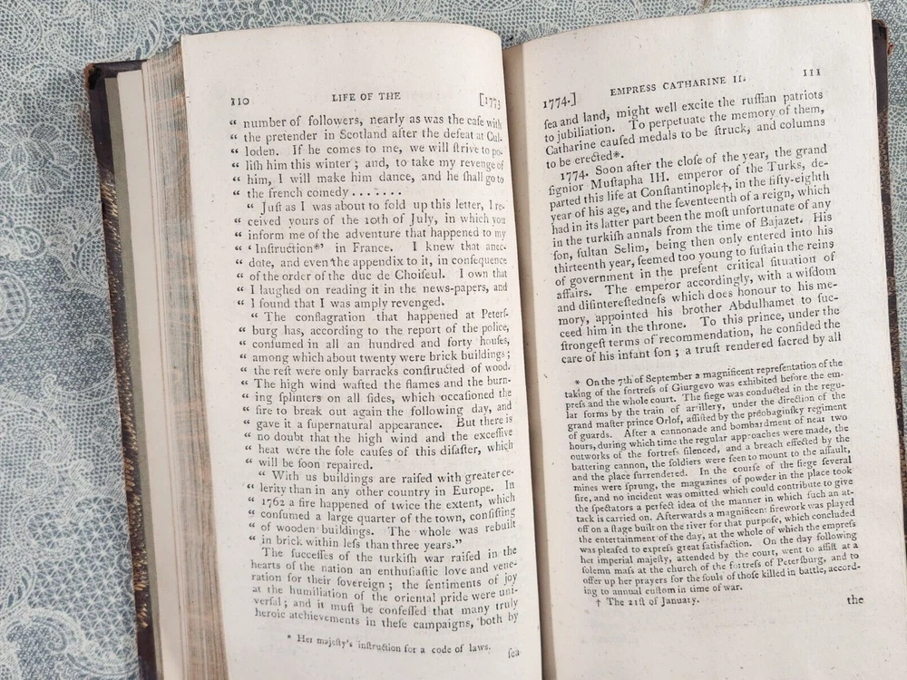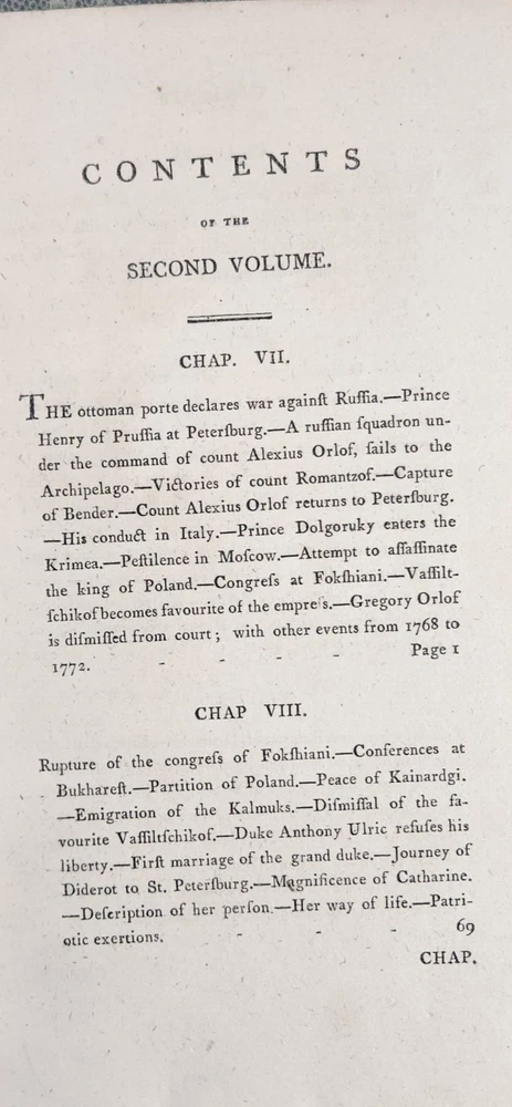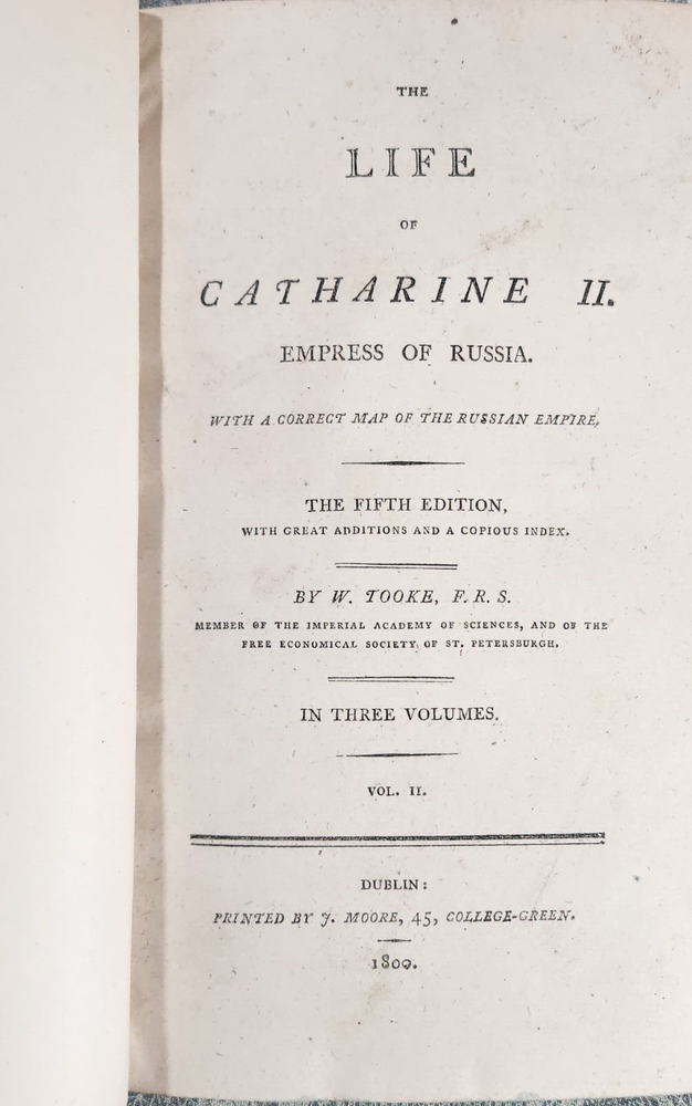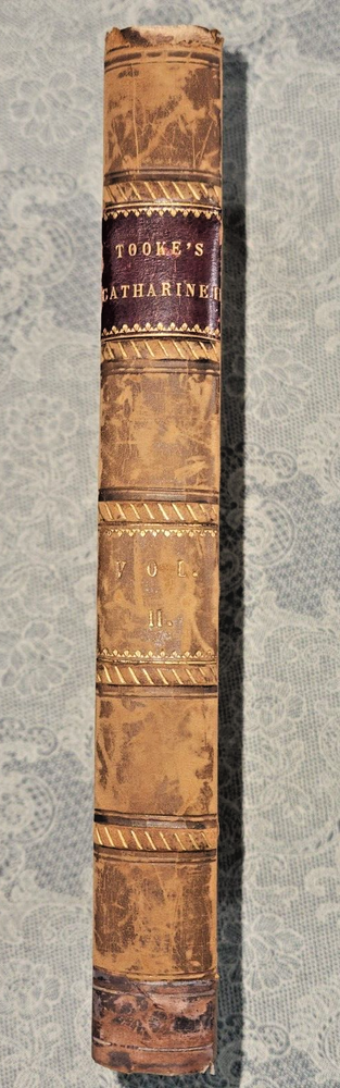 The Life of Catharine II. Empress of Russia: Volume II by, W. Tooke. Strahan for T. N. Longman and O. Rees., Publisher. Printed by, FD. Moore. Dublin Fifth Edition 1800 The Life of Catharine II V2: Empress of Russia is a comprehensive biography written by W. Tooke. This book provides a detailed account of the life of one of the most powerful women in history, Catherine II, who ruled Russia for over three decades. The author delves into Catherine's early life, her rise to power, and her reign as Empress of Russia. Tooke explores Catherine's political and military achievements, including her expansion of the Russian Empire, her patronage of the arts, and her social reforms. The book also delves into Catherine's personal life, including her relationships with her lovers and her children. Tooke's writing is engaging and informative, providing readers with a fascinating insight into the life of this remarkable woman. This book is an excellent resource for anyone interested in Russian history, women's history, or the history of monarchy. We combine shipping on multiple book orders automatically unless instructed otherwise. If you are unable to "Request Invoice" , simply buy all books outright and we will refund shipping overage via Paypal once postage has been printed. We combine shipping via USPS Media Mail . Postage price is calculated by weight . Terminology that may be used in this description: Bookplate: Highly sought after by some collectors, a book plate is an inscribed or decorative device that identifies the owner, or former owner, of a book. Most often bookplates are affixed to the endpaper of a book. Bump: Indicates that the affected part of the book has been impacted in such a way so as to cause a flattening, indention, or light bending. Deckle Edge: Deckle edge is the feathered edge of a page. Traditionally and historically, this was a side effect of the process of making paper. Dust Jacket: Sometimes used as another term for dust jacket, a protective and often decorative wrapper, usually made of paper which wraps around the binding of a book Ex-library: A former library book, generally containing library acquisition and ownership stamped Markings, and other typical indications of the library's use. Foxing: Or, Foxed is the age related browning, or brown-yellowish spots, that can occur to book paper over time. When this aging process happens to the paper in a book it is referred to as "foxed". Remainder Mark: A remainder marked book is just that - a mark to the page edges of a book. This mark is placed on the page edges by a publisher as books are returned from bookstores or sold to discounters. Rubbing: Abrasion or wear to the surface. Usually used in reference to a book's boards or dust-jacket. Shelf Sear: (shelving wear) describes damage caused over time to a book by placing and removing a book from a shelf. Soiled: Generally, refers to minor discoloration or staining.