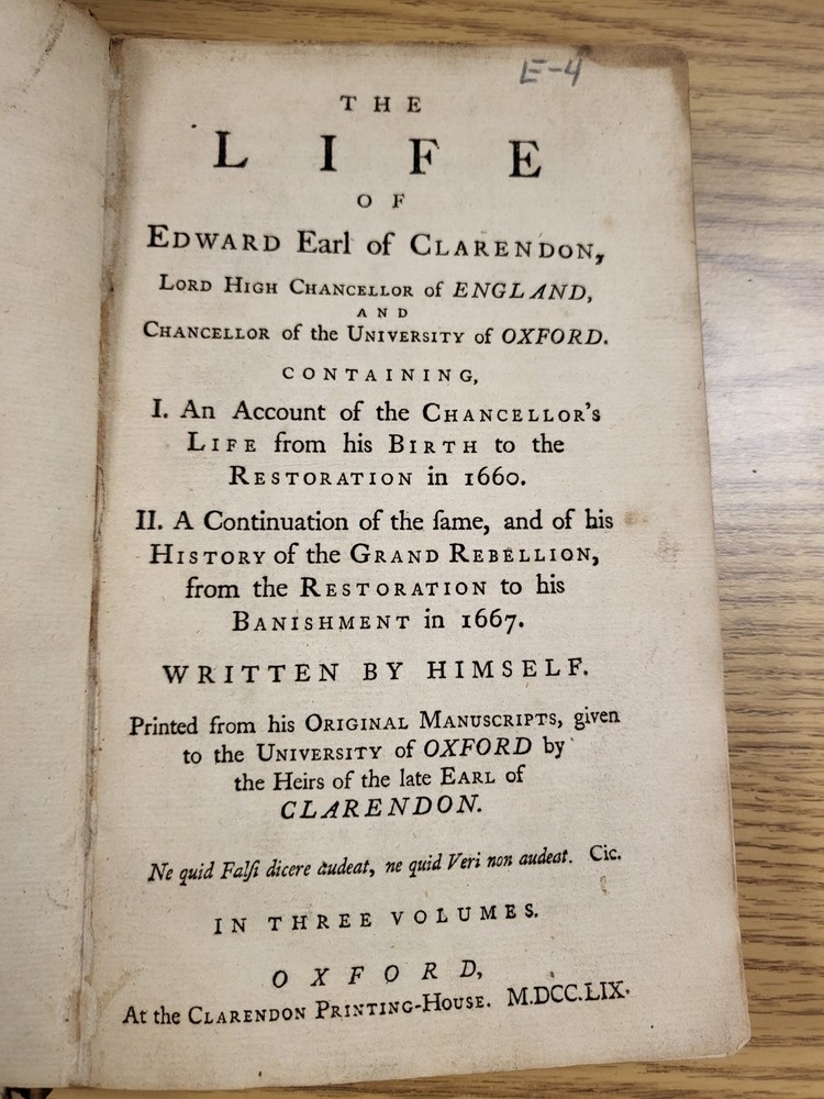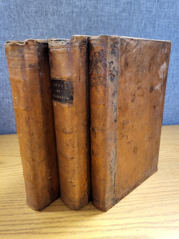 HGG Books presents ... The Life of Edward Earl of Clarendon 3 leather volumes complete Author: Edward Earl of Clarendon Publisher: Clarendon Printing House Release Date: 1759 Seller Category: Biography Qty Available: 1 Condition: Collectible: Good Sku: clarendon Notes: The Life of Edward Earl of Clarendon Lord High Chancellor of England. Includes and Account of the Chancellor's Life from his birth to the Restoration in 1660; a continuation of the same and his history of the Grand Rebellion from the Restoration to his Banishment in 1667. Printed from his original manuscripts. Published in Oxford by the Clarendon Printing House in 1759 in three full leather volumes.Pages clean with light toning to edges, bindings solid, hinges and spines held with leather binding tape matching original calf boards, edge wear to leather boards Don't forget to check out other great deals in our eBay Store!!