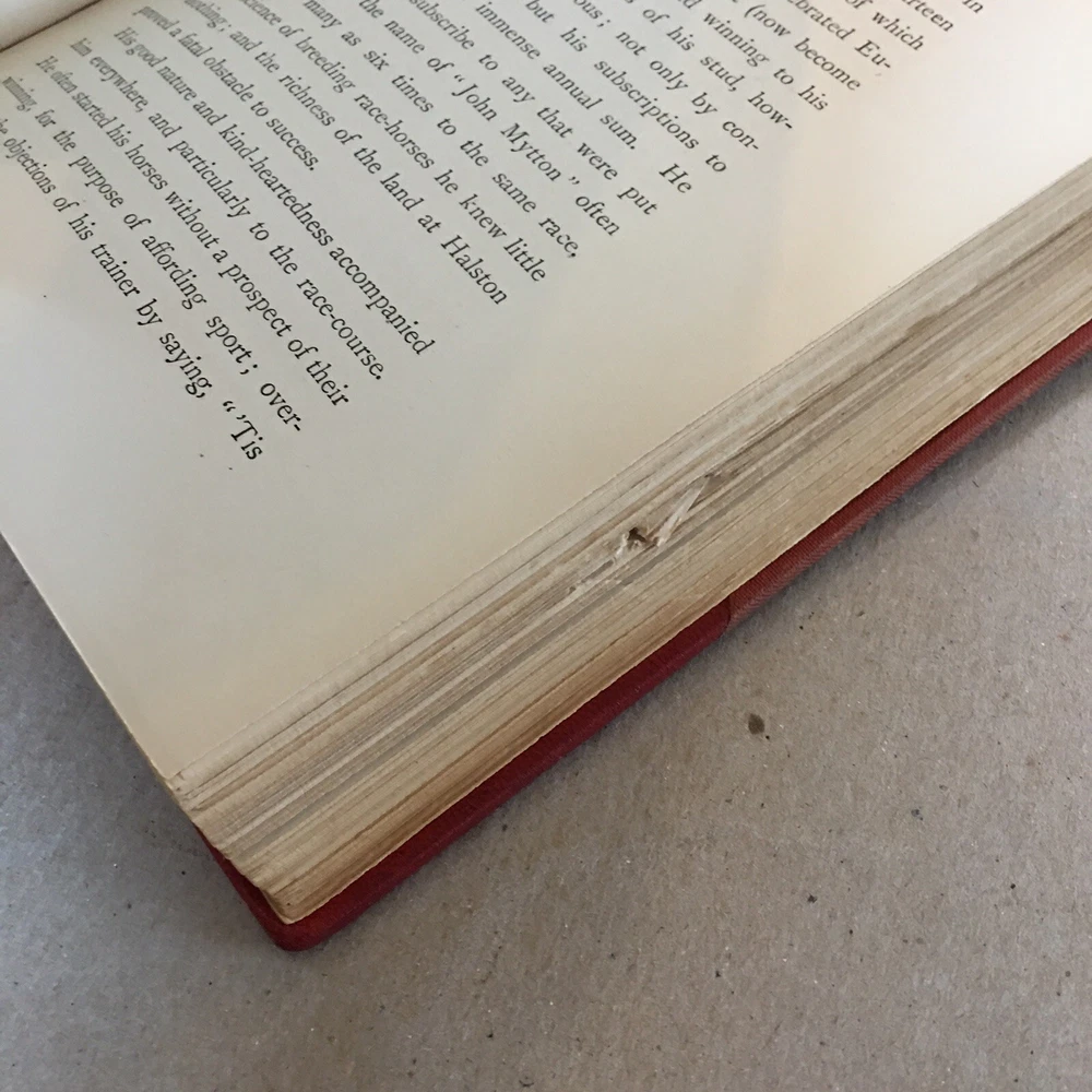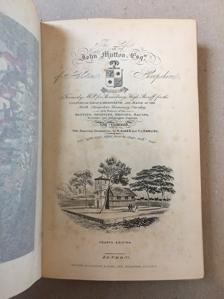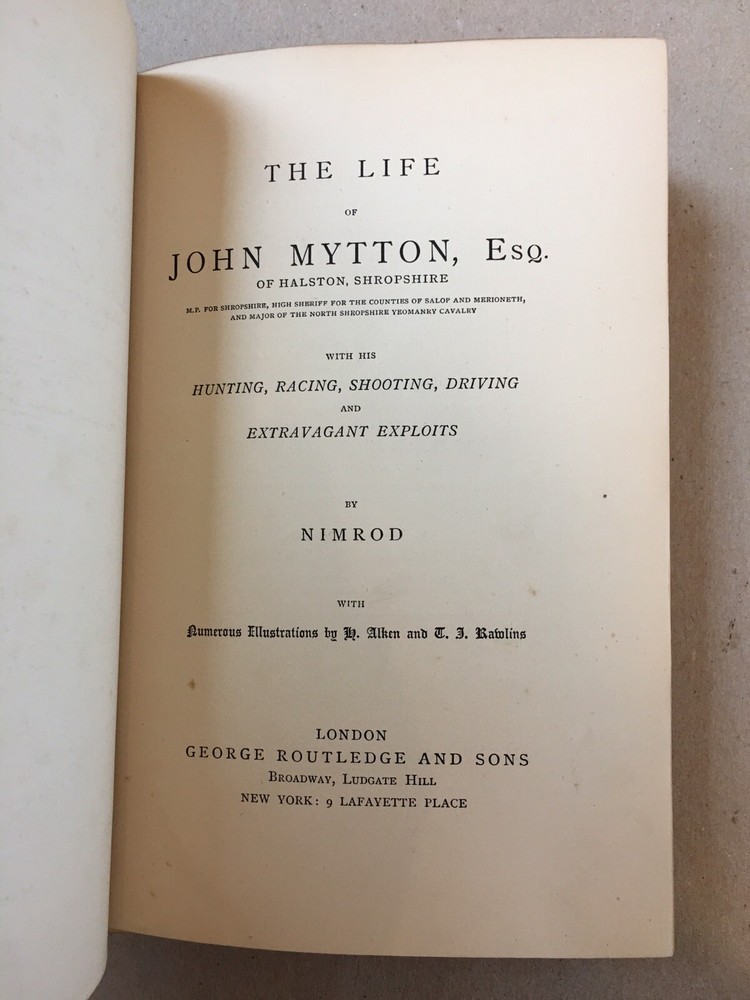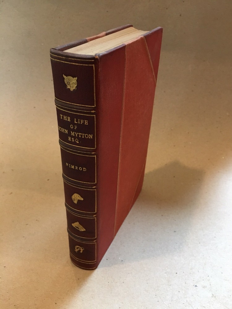 Hardbound in 3/4 red leather over red cloth boards, w/ raised bands, gilt details, and a gilt top edge. 4th Edition . London: George Routledge and Sons, 1869. "The Life of John Mytton, Esq." by Nimrod. Illustrated with 18 hand-colored aquatint plates. Boards show only minor shelfwear and are otherwise in very good condition. There is a small rip along the outer edge of about 10 pages in the center of the text block, and some very minor foxing to a few interior pages and the page edges. Interior is otherwise clean and binding sound. RARE!