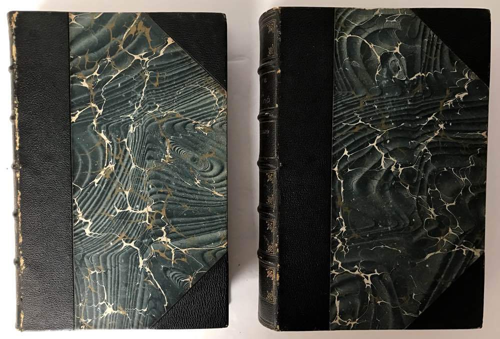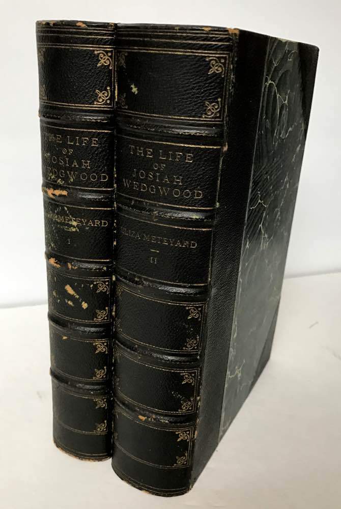 In two volumes. Volume Two published 1866. Index. Half black goat over marbled paper covered boards, marbled paper endsheets, top edges gilt (dulled), raised spine bands with gilt tooling and lettering (dulled). Steel plate engraved portrait frontispieces of Wedgwood and Bentley, 284 woodcut text illustrations, 1 double page chromolithographed plate of border decorations. With an Introductory Sketch of the Art of Pottery in England. With a little rubbing to tips and panels, Spotting to frontispieces otherwise quite a nice and tight set. Branner p297, Solon p284, Weinrich p237.