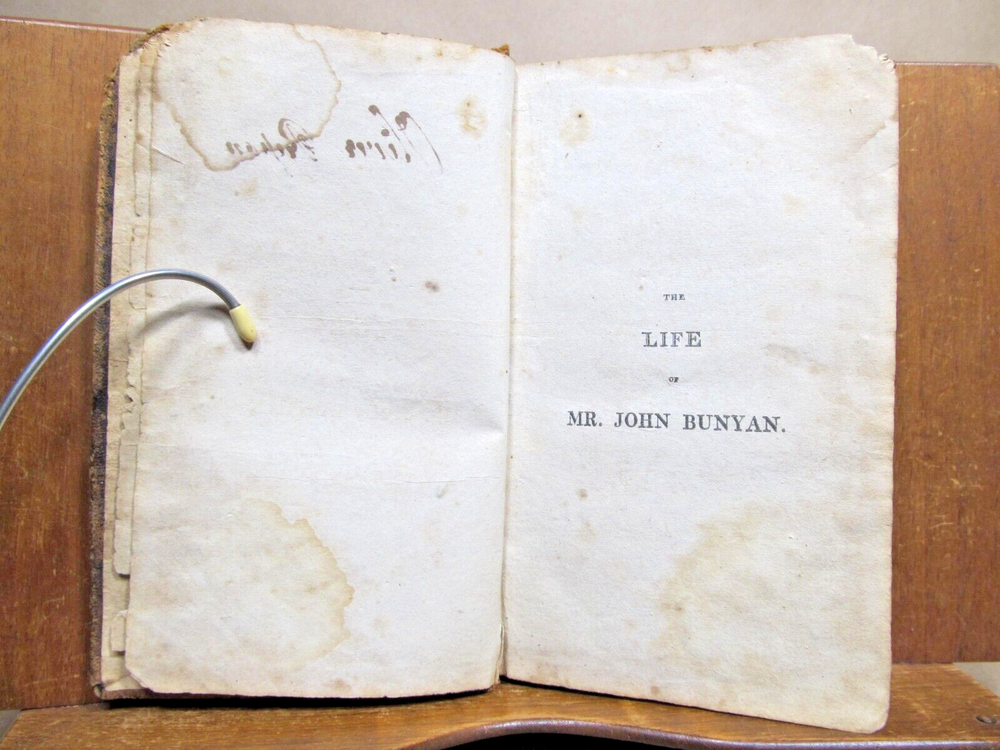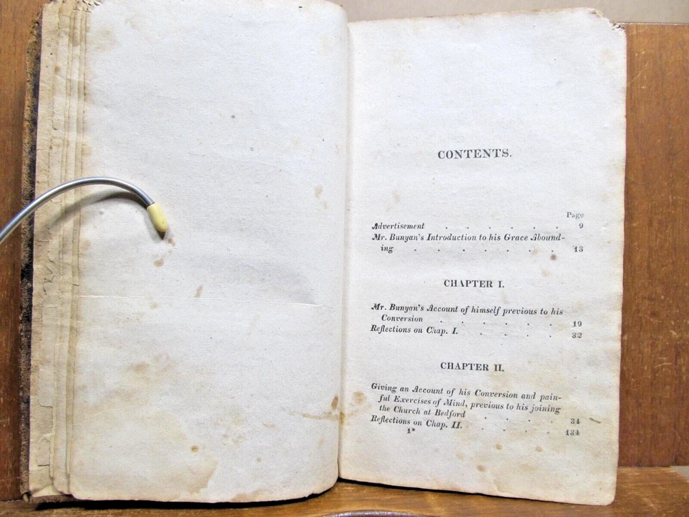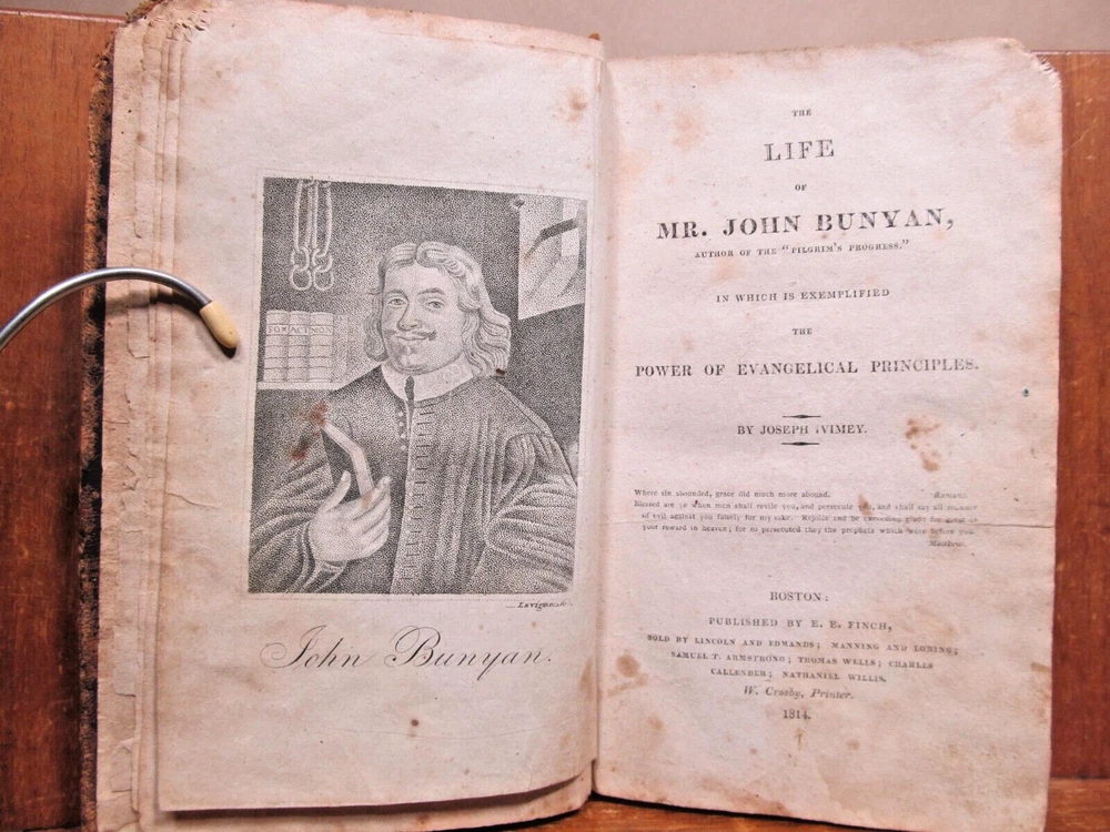 THE LIFE OH JOHN BUNYAN, Author of the "Pilgrim's Progress" in which is exemplified the Power of Evangelical Principles by JOSEPH IVIMEY, First American Edition, Boston, 1814. Description: Full leather covers with gilt title on spine. Engraving illustrated frontis. Condition: Fair. Covers show wear and rubbing, but are securely attached to spine. Top right corner has been nibbled by a hungry rodent. Staining, foxing and age toning throughout, but pges are tight to the spine. (see photos) Pages: 307 Size: 4.5" x 7" Weight: 10 ozs Joseph Ivimey (1773-1834) was an English Particular Baptist minister and historian. John Bunyan (1628-1688) was an English writer and Puritan preacher. He is best remembered as the author of the Christian allegory The Pilgrim's Progress, which also became an influential literary model. In addition to The Pilgrim's Progress, Bunyan wrote nearly sixty titles, many of them expanded sermons. Wikipedia Check out my other current book listings. I will combine shipping for the best rate. Ask if you have questions. No reserve. You bid, it sells! Notice: This book will be shipped book rate. It is slower, but cheaper. Be patient!