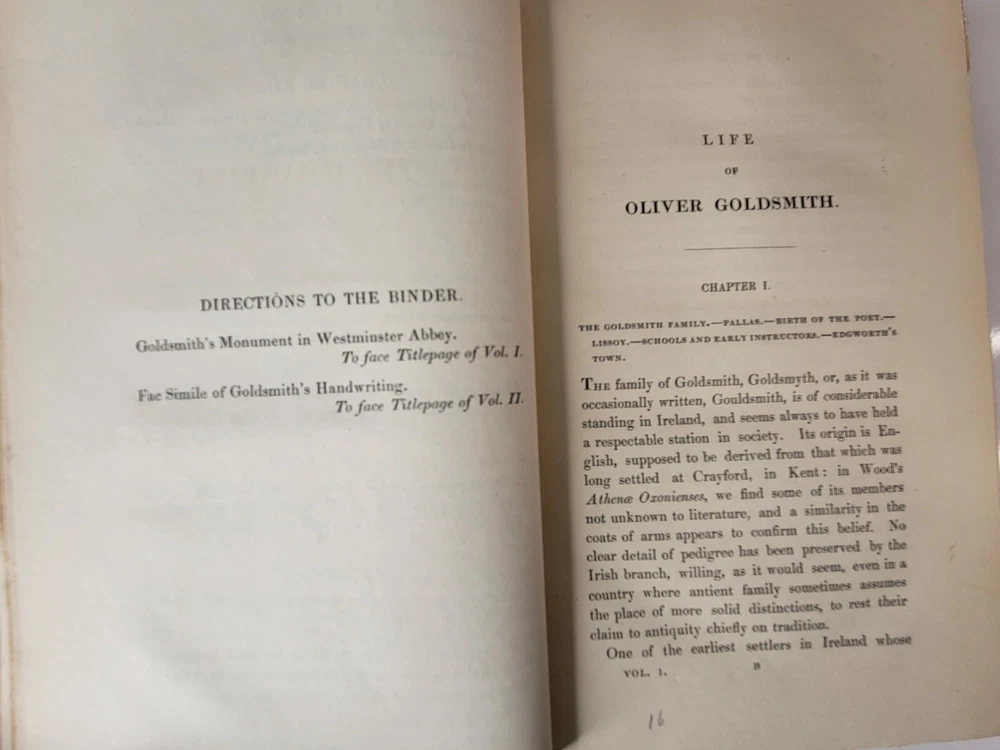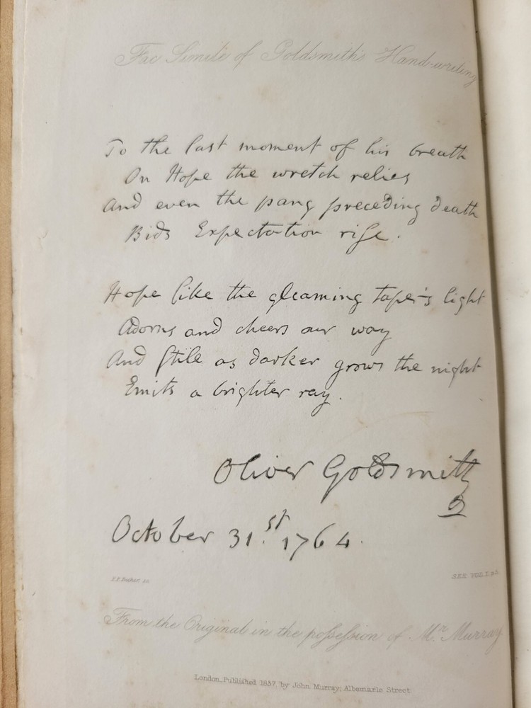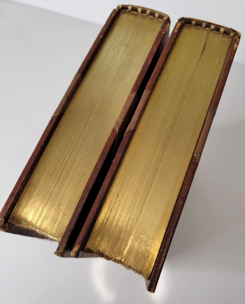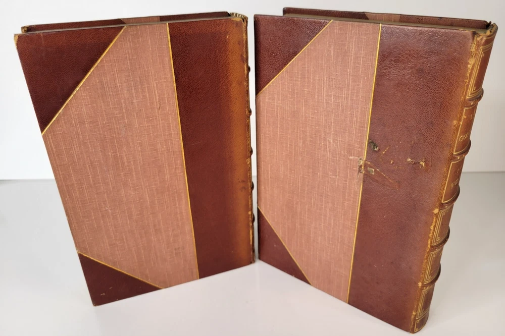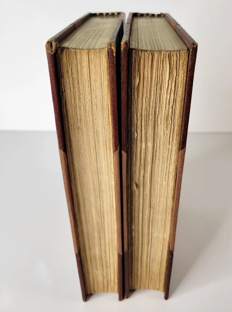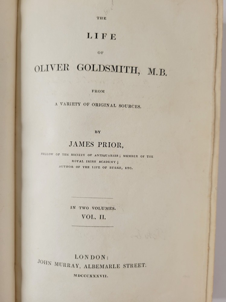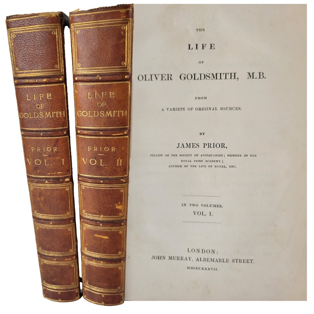 Elevate your collection with this exquisite two-volume first edition set of The Life of Oliver Goldsmith by James Prior, published in 1837 by the prestigious John Murray of London . This attractive and historically rich set is bound in three-quarter leather over cloth by the esteemed Bayntun of Bath, England , a name synonymous with fine bookbinding. ✨ Notable Features: Frontispiece Engraving : Goldsmith's Monument in Westminster Abbey (Vol. I) Facsimile of Goldsmith’s Handwriting : Facing title page (Vol. II) Classic Bayntun Binding : Three-quarter leather over cloth boards with hand-decorated endpapers Elegant Spine Design : Five raised bands, gilt-stamped title , and top edge gilt Provenance : Original bookplates designed by award-winning etcher Walter M. Aikman for previous owner John Kepke 📏 Dimensions & Pagination: 8vo format Vol. I : 515pp Vol. II : 586pp (9” x 5.5”) 📖 Condition : Expected shelf wear with rubbing to leather on spine and corner tips . Some sunning on the spine leather and small scrapes to rear cover of Vol. II. Preliminary blank page of Vol. I has small chips , but all pages remain intact and highly presentable . 🔹 A Distinguished Collector’s Item! This first edition set offers historical significance, beautiful craftsmanship , and a touch of literary elegance. A remarkable addition to any fine library or Goldsmith enthusiast’s collection ! 📦 Ships securely with tracking! Don’t miss this chance to own a rare and expertly bound piece of literary history!