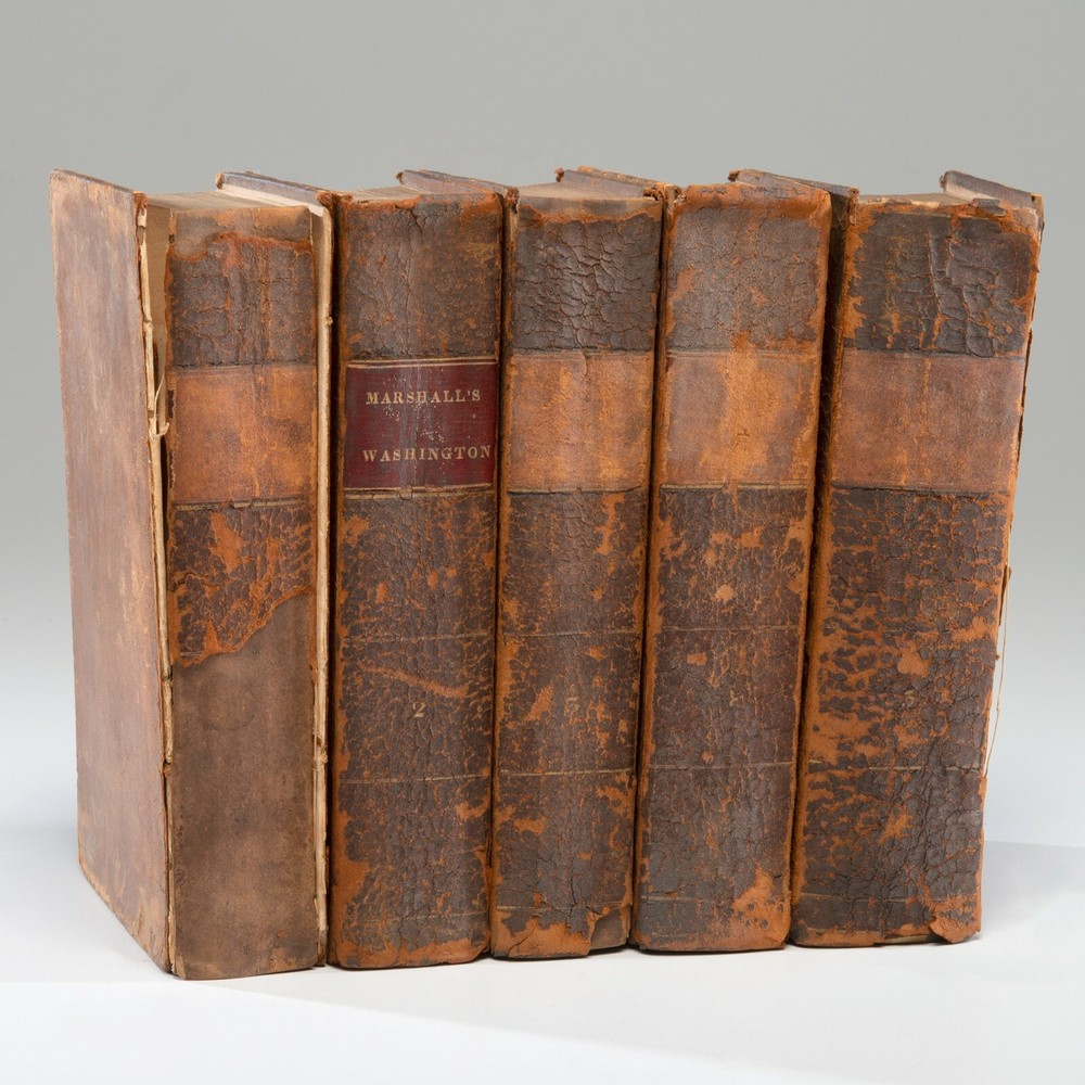 [GEORGE WASHINGTON] JOHN MARSHALL . The Life of Washington, Commander in Chief of the American Forces, during the War which Established the Independence of His Country, and First President of the United States. Compiled under the Inspection of the Honourable Bushrod Washington, from Original Papers Bequeathed to Him by His Deceased Relative, and now in Possession of the Author . Philadelphia, PA: C.P. Wayne, 1804-1807. FIRST EDITION OF JOHN MARSHALL’S THE LIFE OF WASHINGTON PUBLISHED IN PHILADELPHIA, PA BY C.P. WAYNE BETWEEN 1804-1807 First edition, 8.75 by 5.5 inches, complete five volume set, full contemporary calf binding, frontispiece portrait of Washington in Volume I, and in good condition with heavy rubbing to the boards, some of the covers are detached, all but one lacking the label on the spine with two additional labels separate but present, and foxing to the first and last few pages. THIS HISTORIC SET IS ONE OF THE MOST AUTHORITATIVE BIOGRAPHIES ON WASHINGTON EVER WRITTEN One of the most authoritative biographies on Washington ever written due to John Marshall being one of the last to have personally been associated with Washington, in addition to having access to the late President’s papers through his nephew. Marshall served as one of Washington’s captains during the American Revolution and later as Chief Justice of the United States Supreme Court from 1801 to 1835, with his term being widely considered as the most influential in the Court. He greatly admired George Washington and spent several years publishing this biography. Marshall later revised and condensed it into a two-volume work in 1832 and then abridged it to a single volume in 1838 with the goal of making it useful in schools. “It is impossible to contemplate the great events which have occurred in the United States under the auspices of Washington, without ascribing them, in some measure, to him…” (Marshall, 5:779).