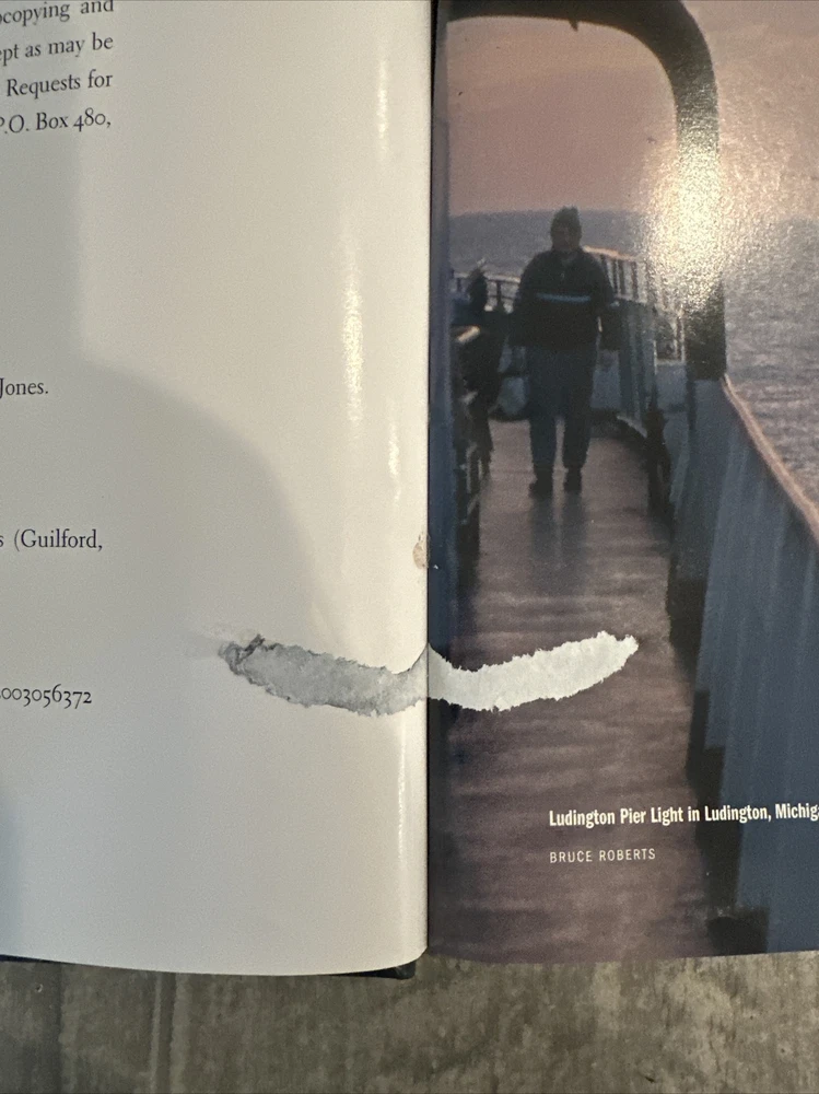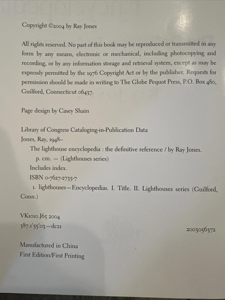 This is a rare and collectible edition of "The Lighthouse Encyclopedia" by Ray Jones. The book is personalized and covers topics related to reference materials. It is a great addition to any collection of antiquarian and collectible books. On the third page it’s stuck to the fourth page and caused a tear in the paper. Please look closely before buying. That’s why the cheaper price.