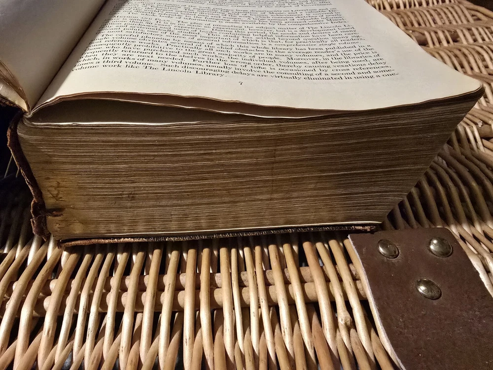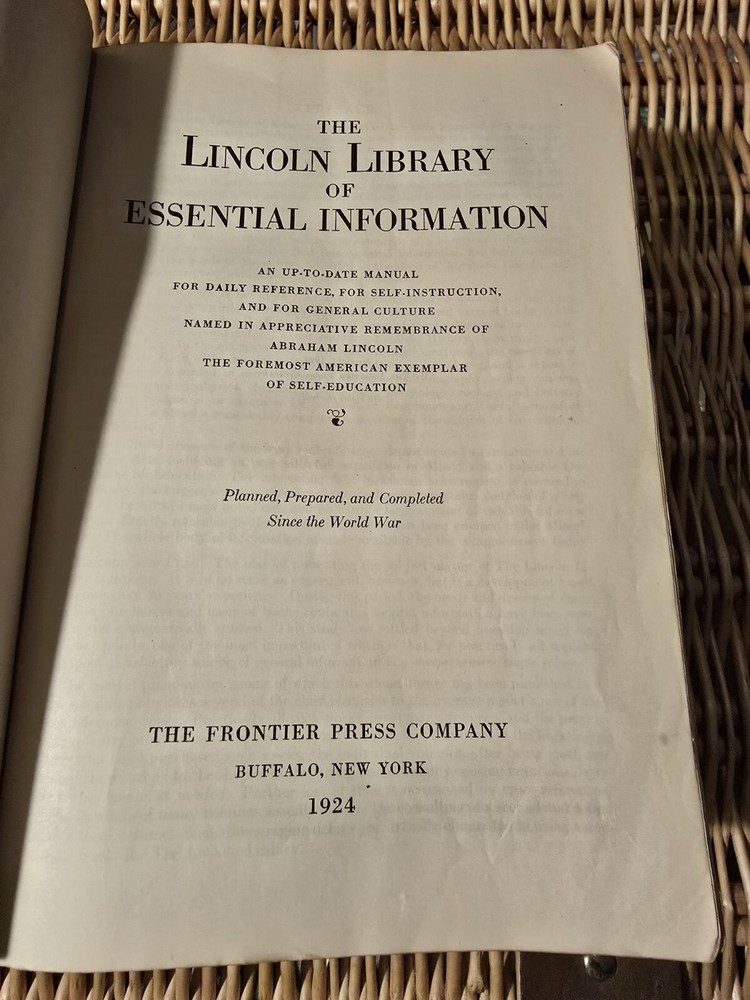 RARE FIRST EDITION 1924 antiquarian book. Fragile binding and first and back pages are marbled paper but poor condition. Please see photos for condition. Returns are accepted. Buyer MUST SIGN FOR PACKAGE. Thanks for looking. The product is "The Lincoln Library Of Essential Information 1924" by The Frontier Press Company. It is a first edition antique book published in Buffalo, New York. The book is in English, illustrated, and serves as a reference on various topics. It is personalized, contains leather binding, and was manufactured in the United States. The book is a valuable collectible item from North America.