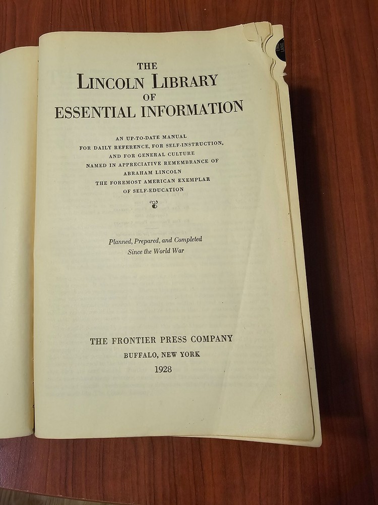 The Lincoln Library of Essential Information was originally published in 1924 by the Frontier Press of Buffalo, New Yor k as a one-volume general-reference work. In later years, it was published in two- and three-volume editions, and the title was changed. The first edition of the Lincoln Library of Essential Information was published It had 2,054 pages and was compiled by Michael J. Kinsella . While primarily a one volume publication during this time, two volume versions of the book were available from 1928. This is almost a century old rare and valuable reference book featuring a leather binding and was printed in 1928 by The Frontier Press Co. in New York. The book is illustrated and contains a wealth of information making it a must-have for any collector or history enthusiast. It would make a great addition to anyone's reference collection. Don't miss out on this opportunity to own a piece of history.