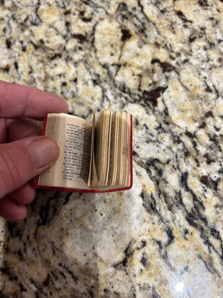 OFFERED FOR SALE HERE TODAY IS THIS VERY CUTE MINIATURE BOOK . THE LITTLE WEBSTER DICTIONARY WAS PUBLISHED IN 1957 BY LANGENSCHIEDT PUBLISHERS IN GERMANY . THE LITTLE LEATHER BOUND BOOK HAS 640 PAGES AND MEASURES 2" by 1.5" AND IS IN VERY GOOD CONDITION . PLEASE BID WITH CONFIDENCE AND THANKS FOR LOOKING. PLEASE FEEL FREE TO ASK AS MANY QUESTIONS AS YOU NEED TO FEEL COMFORTABLE IN MAKING YOUR PURCHASE HERE, AS I DON'T CLAIM TO BE AN EXPERT ON EVERYTHING, PARTICULARLY SERIOUS COLLECTORS THESE ARE USUALLY VINTAGE USED ITEMS AND IF YOUR EXPECTING "PERFECT" PLEASE ASK SPECIFIC QUESTIONS ABOUT YOUR CONCERNS. ALMOST NEVER A RESERVE AND LOW OPENING BIDS. CHECK BACK OFTEN AS NEW INTERESTING AND HARD TO FIND ITEMS ARE ALWAYS ARRIVING. EVERY ITEM IS INDIVIDUALLY PHOTOED, NEVER A STOCK PHOTO AND NEVER RE-USED PHOTOS. ALL SUCCESSFUL TRANSACTIONS WILL RECEIVE POSITIVE FEEDBACK WITHIN 30 DAYS AFTER THE COMPLETION OF THE TRANSACTION, OR RIGHT AFTER YOUR POSITIVE FEEDBACK HAS BEEN PLACED. NO RESERVE AND LOW OPENING BID. DON'T FORGET THAT I COMBINE SHIPPING, MULTIPLE BUYS SAVE YOU MONEY ON SHIPPING!!