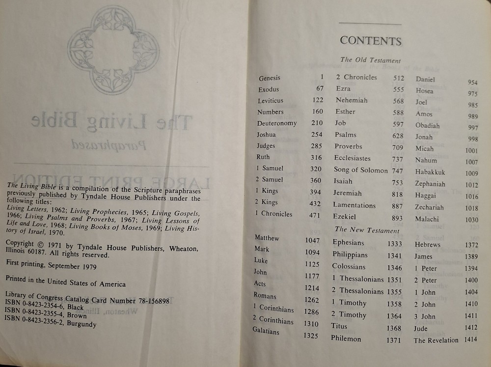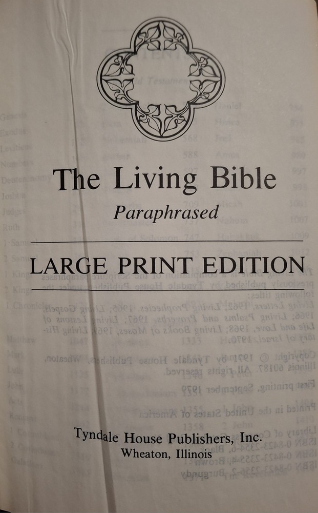 The Living Bible Paraphrased Large Print Edition, published by Tyndale House Publishers in 1979, is a vintage Bible designed for young adults and adults. This Bible features large print text and red lettering for easier reading, making it accessible and engaging for a wide range of readers. With 1437 pages, this edition offers a comprehensive collection of religious and spiritual teachings, making it a valuable addition to any home or personal library. Its faux leather binding adds a touch of elegance to this timeless piece of American literature from the 1980s.