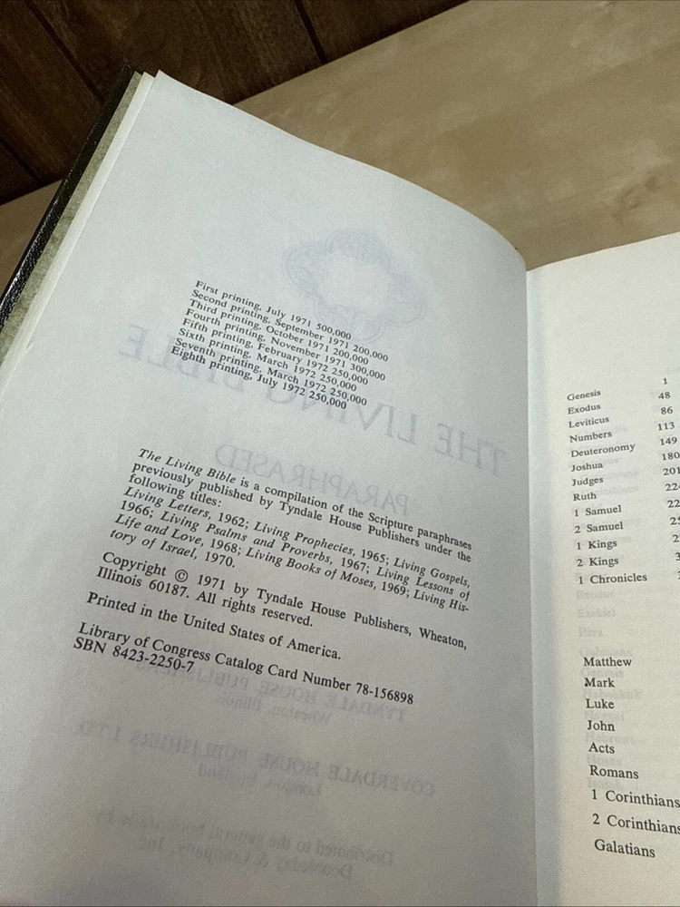 The Living Bible Paraphrased TYNDALE 1971 Hardcover Green Faux Leather Padded. Condition is Good. Shipped with USPS Media Mail.