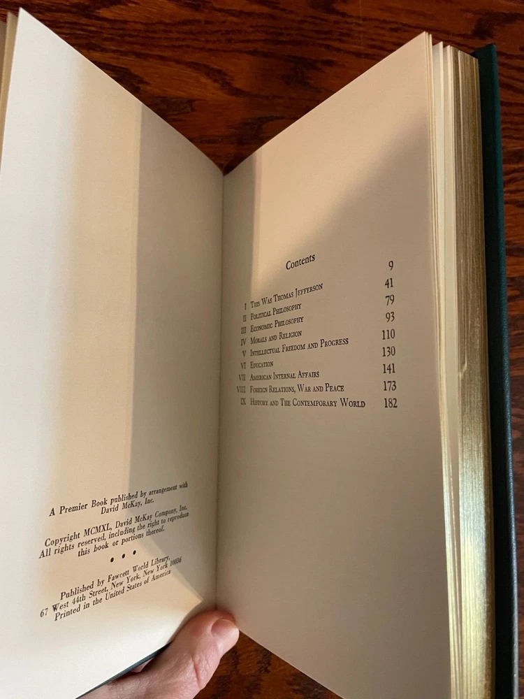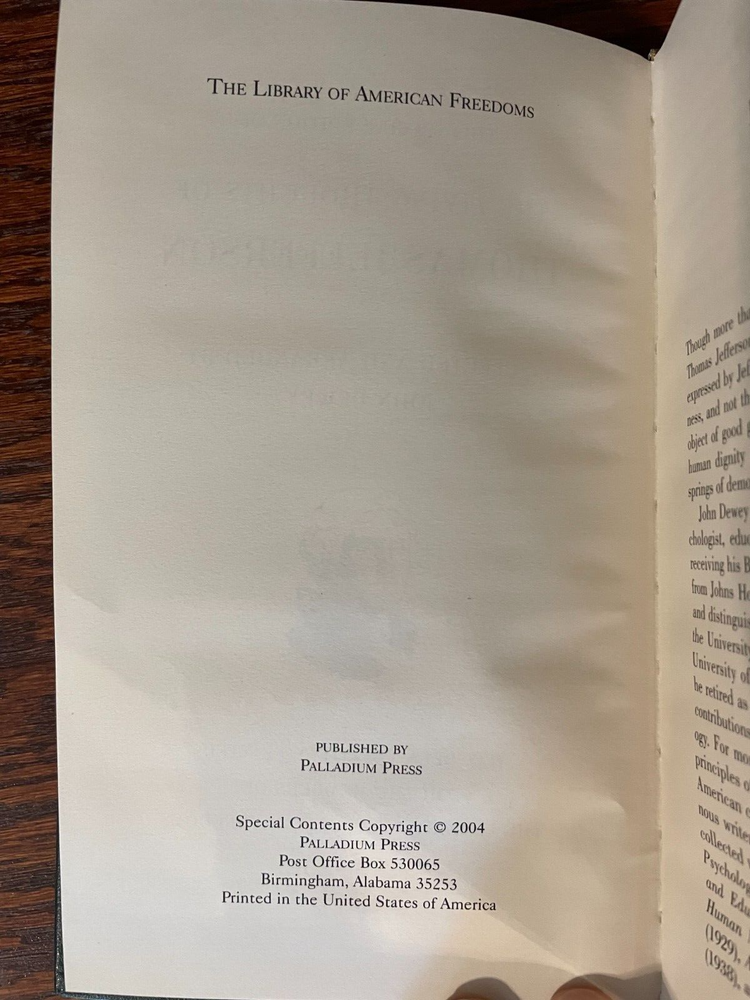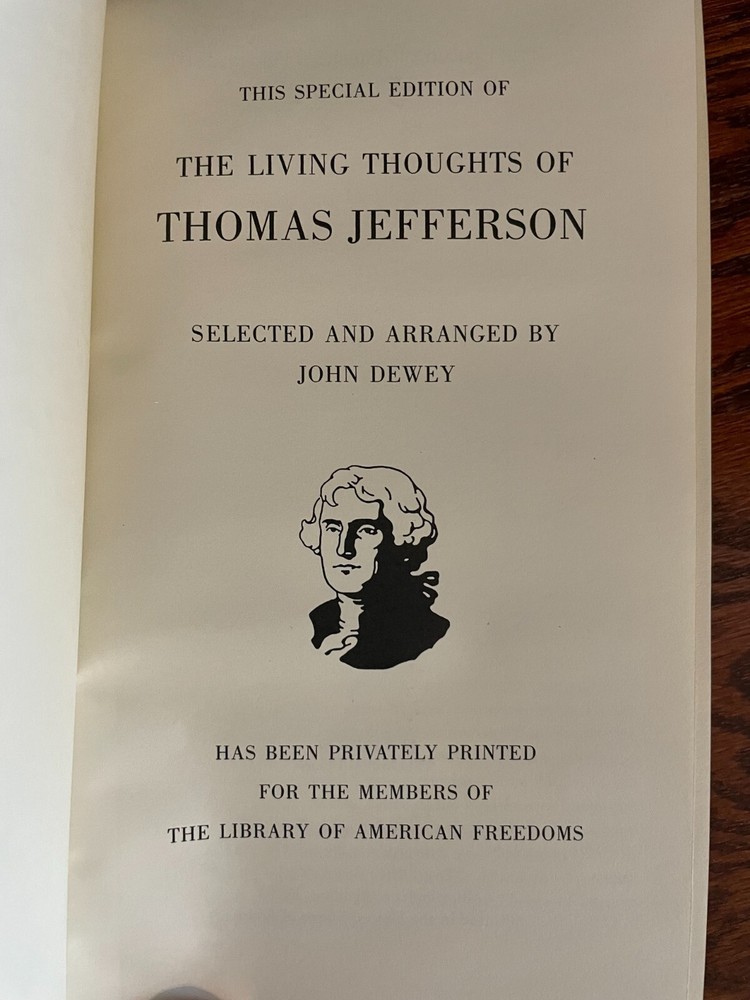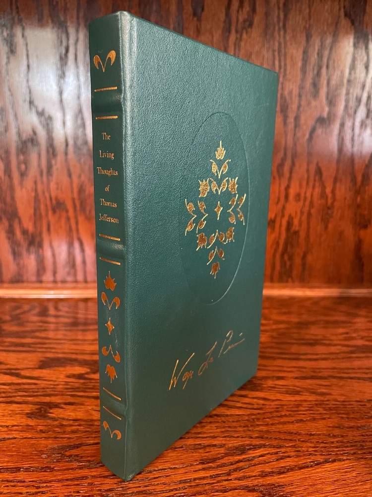 The Living Thoughts of Thomas Jefferson. Selected and Arranged by John Dewey. Palladium Press. Birmingham, AL USA. 191 pages. 2004. Leather bound, special edition. Deep green leather with raised bands, a gilt stamped title on the spine, and decorative gilt stamped patterns on the spine and front covers. All edges gilt. Marbled endpapers. Part of The Library of American Freedoms collection. Dimensions are 8"x 4.8"x .75". Condition: Used. Very Good to Near Fine. Tight binding with very clean and crisp pages. No missing or damaged pages. No dust jacket. Pictures are of actual books offered. Shipped by US Media Mail unless Priority selected.
