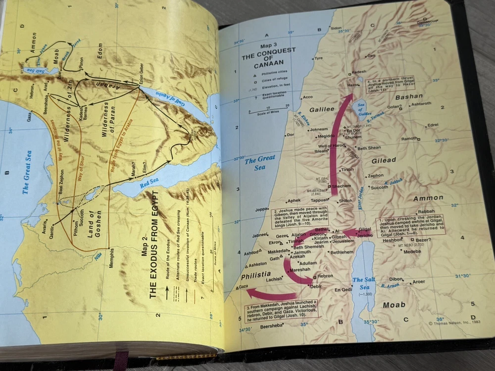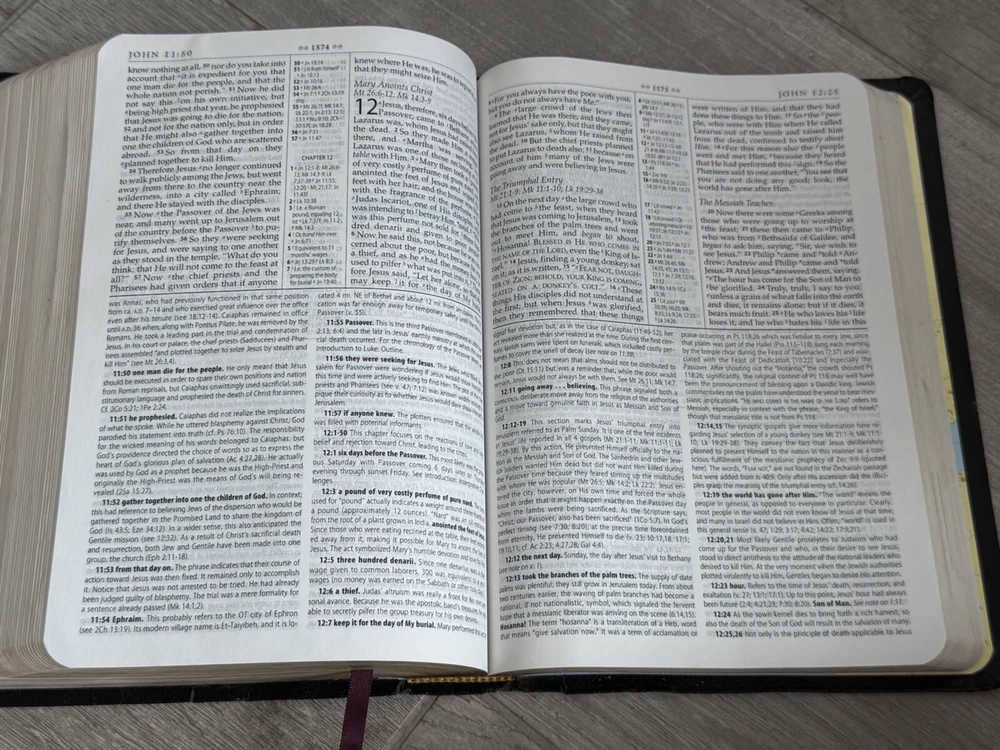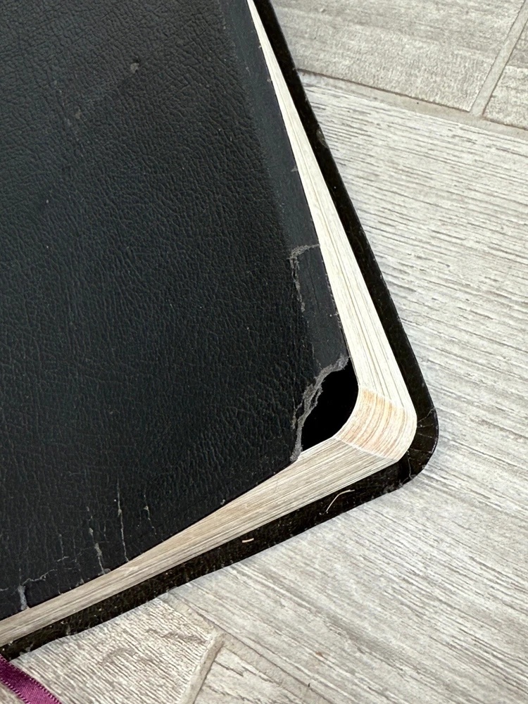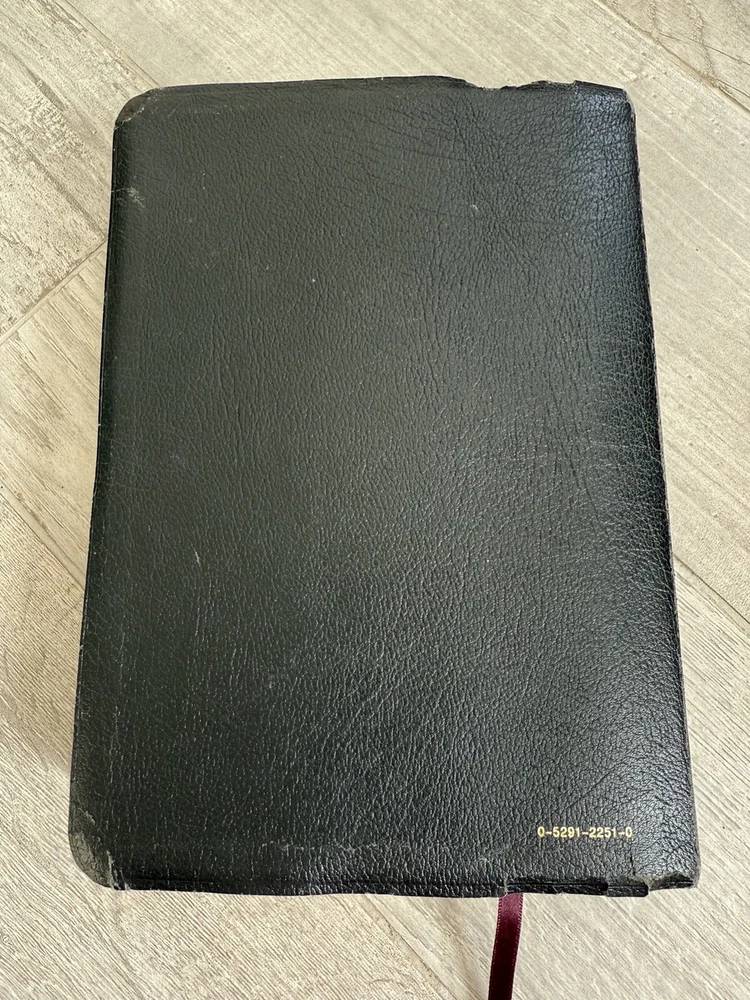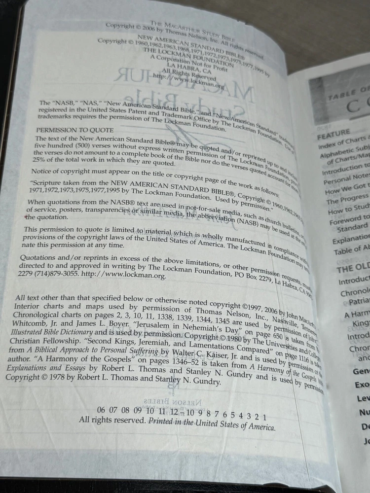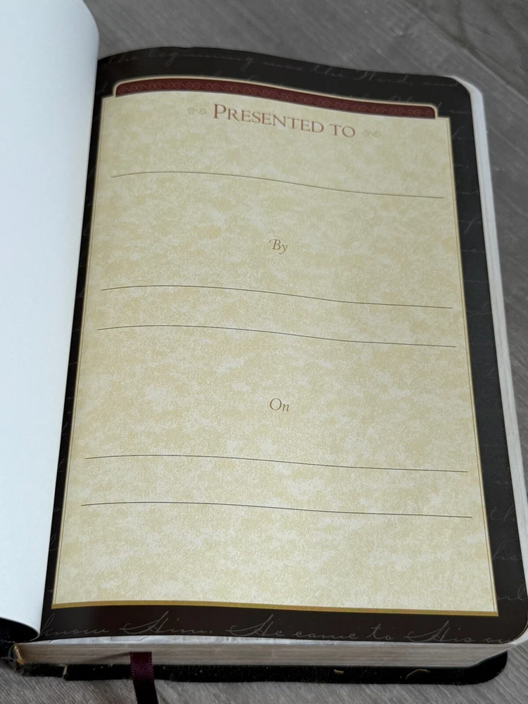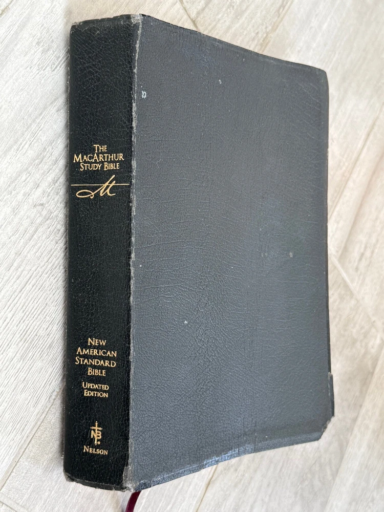 (250127) This exiting and well put together study Bible is going to be a perfect addition to your collection! The cover has a nice shine with minor wear from typical handling and a nice he bottom right corner of the cover has been clipped. There is some minor highlighting. The spine and binding are in good shape. The product is "The MacArthur Study Bible," a leather-bound edition published by Thomas Nelson Incorporated in 2006. Authored by John Macarthur, it features a comprehensive concordance and contains 2208 pages. The book is intended for young adults and adults interested in religious topics, particularly focusing on Christianity and the history of the Christian Church. Written in English, it includes topics such as the history of the Christian Church, study of the New American Standard Bible, and regions like the Middle East, specifically Israel and Palestine.