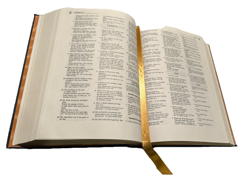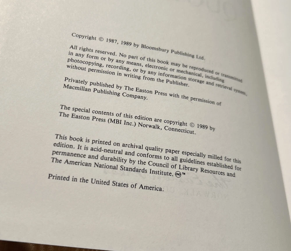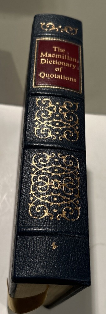 For your careful consideration: The Macmillan Dictionary of Quotations - Easton Press Collector's Edition 1989 Easton Press books are printed on archival quality acid-neutral paper and bound with premium genuine leather in the U.S.A. They have 22k gold gilt page edges and gold accents/design on the cover, hubbed spines and Silk Moire lining. ITEM CONDITION NOTES: Excellent/Fine condition with clean and unmarked text, tight/square binding and pristine leather cover. The gold gilt page edging is near perfect. PLEASE SEE ALL PHOTOS BEFORE BUING. Calculated Shipping via USPS Media Mail or Carrier of Buyer's Choice (UPS Ground, FEDEX Ground or Home Delivery, USPS Priority Mail).