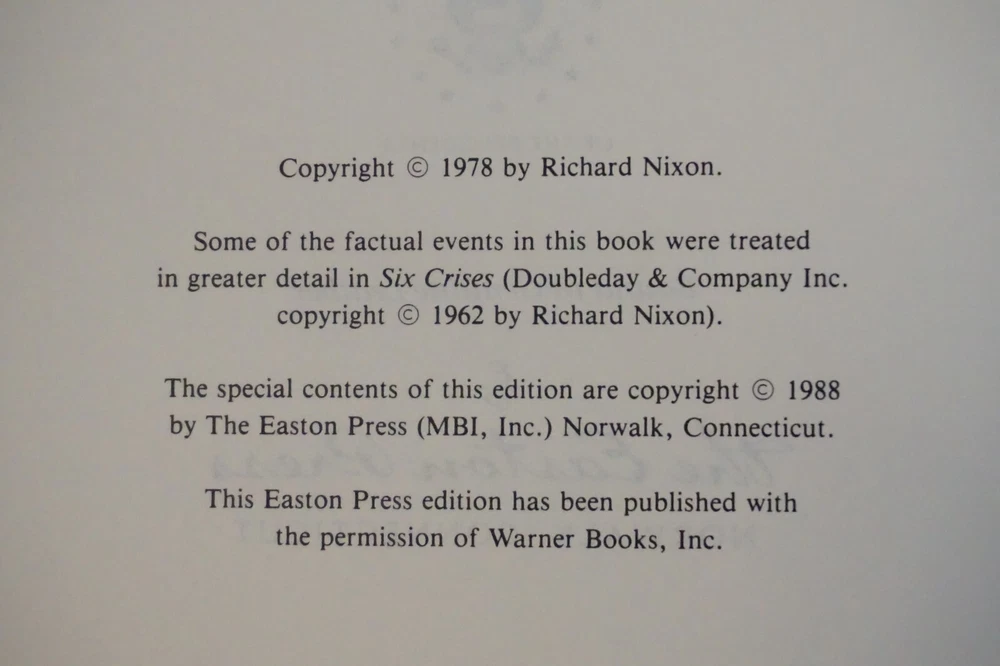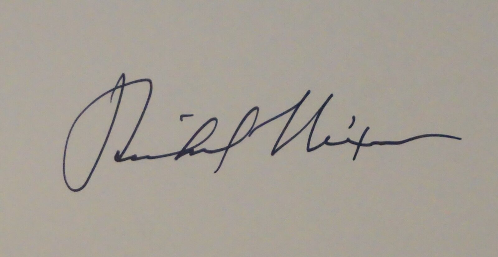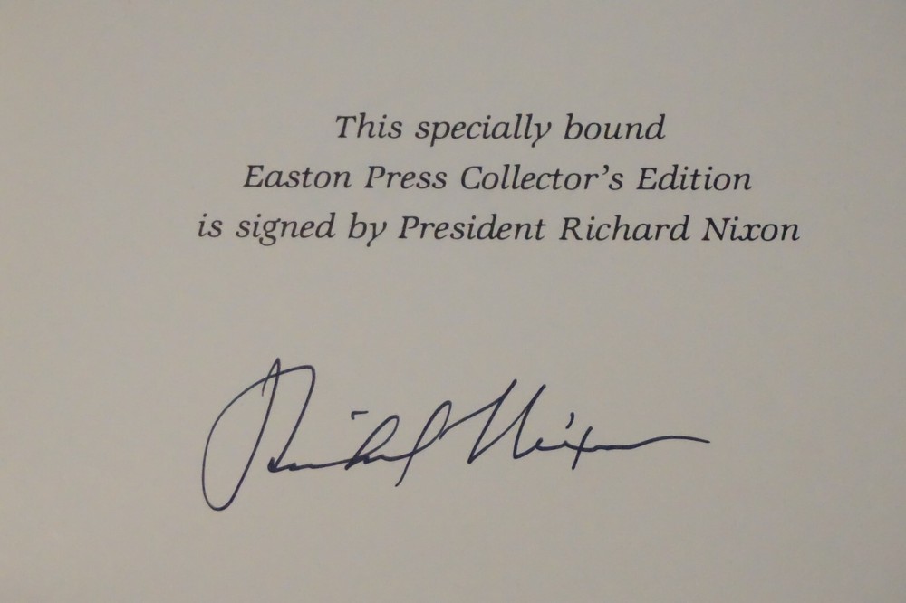 Wonderful vintage signed copy of The Memoirs of Richard Nixon. Published in 1988 by Easton Press of Norwalk, Connecticut. The leatherbound book is in very good condition for its age, with minor wear to the cover and edges. The book is signed by President Richard Nixon on the front flyleaf (see photos). Great find at a great price! Please note the S&H charges, which include USPS postage, materials, and handling. Pictured bookends are not included in the sale. This item will be shipped insured. View our other eBay listings at Weiss Lane Books! https://www.ebay.com/str/Weiss-Lane-Books