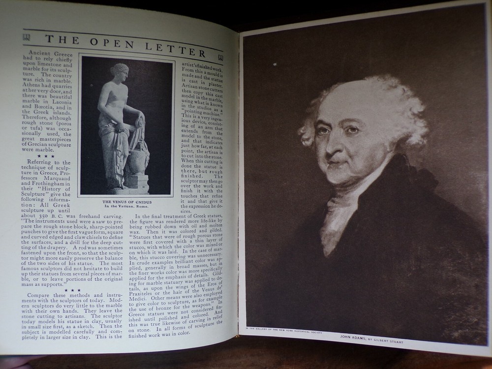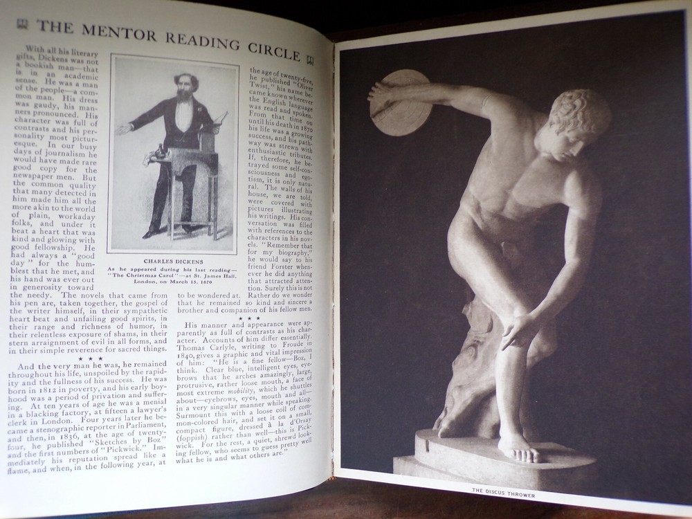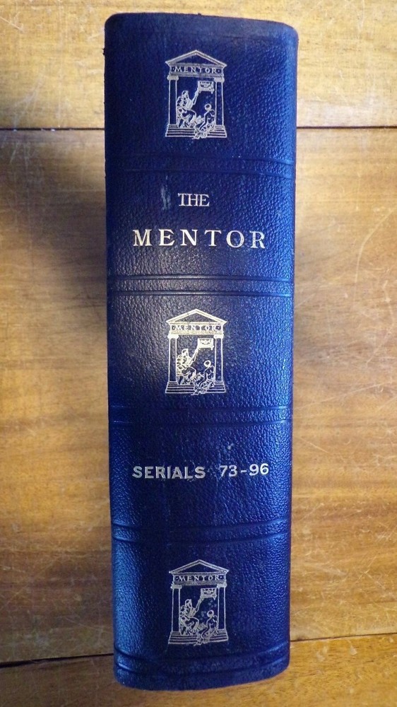 The Mentor: Serials 73 - 196 Dec. 15, 1914 - Dec 1, 1915 Black Quarter Leather with Green Buckram Boards Gold Gilt titles with Mentor Logos on spine. Book is in very good condition, with a stain to the back cover, and some wear to the spine. The Mentor was an early magazine showcasing arts, history, and travel