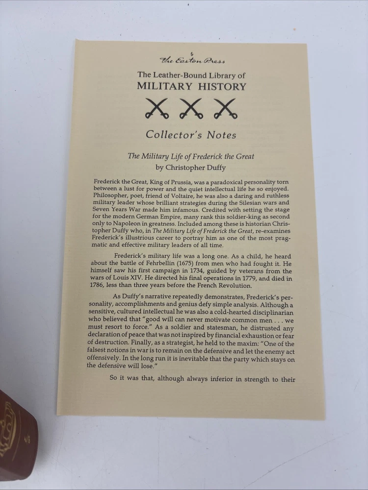 The Military Life of Frederick the Great by Christopher Duffy - Easton Press This book is in excellent condition as seen in photos. There is no marking in the book. There is a couple of very small marks on the front cover as seen in one of the photos. Check out my other Easton Press listings.