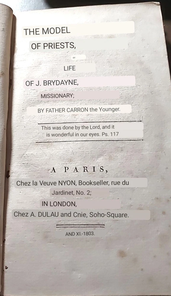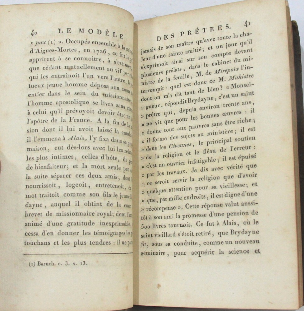 The Model of Priests or Life of J Bridaine Missionary by Father Abbe Carron . Published by A Paris, chez la veuve Nyon, An XI-1803. Full Leather. All text is in French. Biography of Jacques Bridaine, who was a Catholic priest and missionary. Having completed his studies at the Jesuit College of Avignon he entered the Seminary of the Royal Missions of St. Charles of the Cross. He was renowned for having a sonorous and penetrating voice that could easily be heard by an audience of ten thousand people. He tended towards great theatrics to engage his audience. In Paris, in 1744, his sermons created a deep impression. He died in 1767. This book has a bookplate from John Jebb when he was the Bishop of Limerick, Ireland. The spine is missing and the front board is separated. Some mild foxing throughout, but still quite readable. The title page has been interpreted using google lens. These are included on the listing.