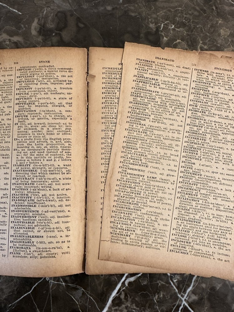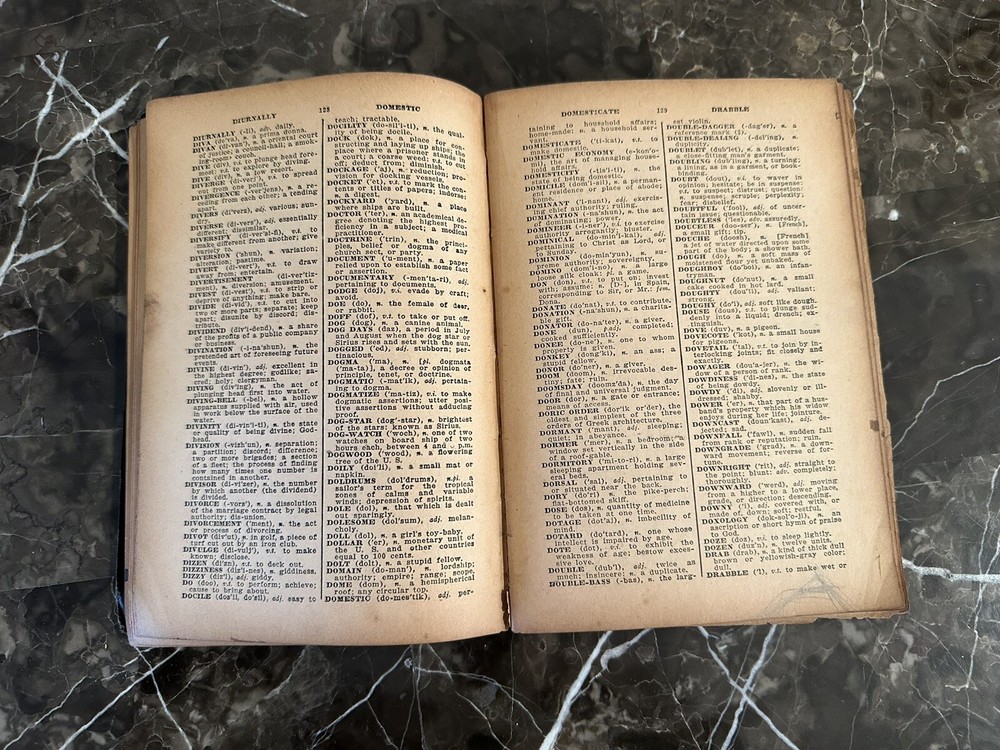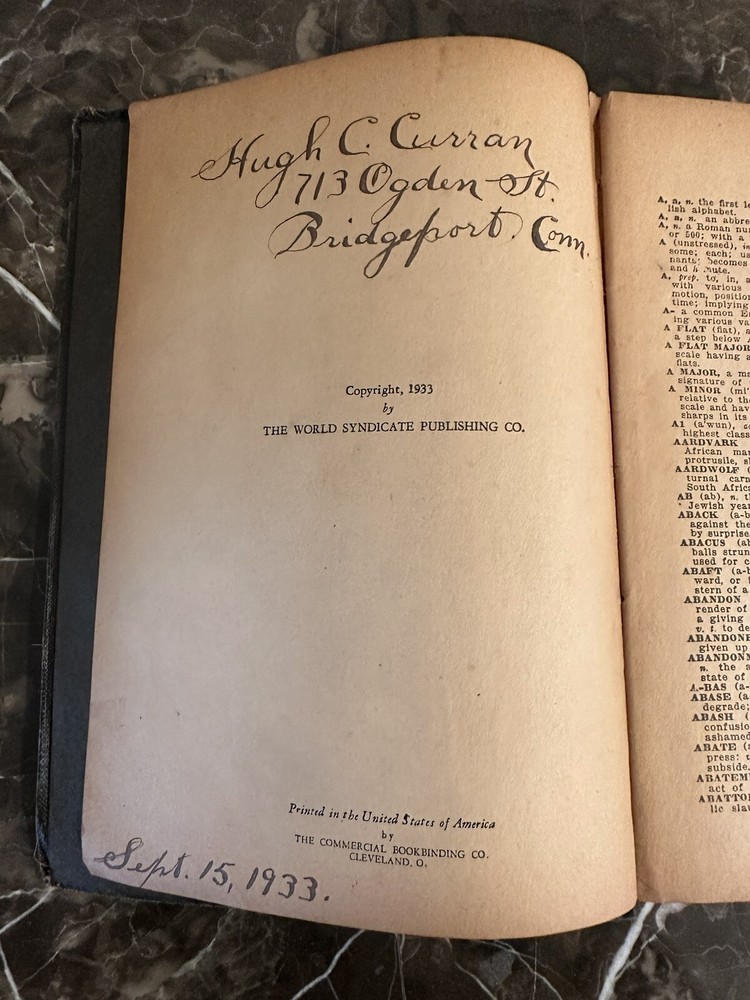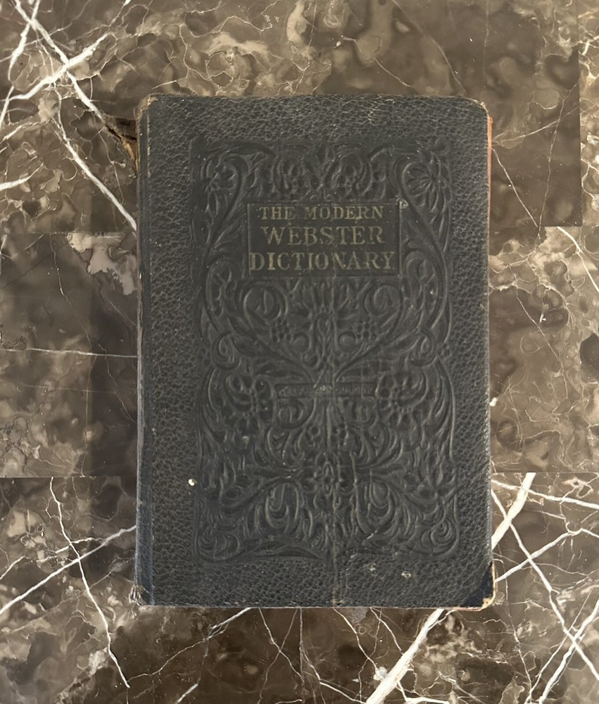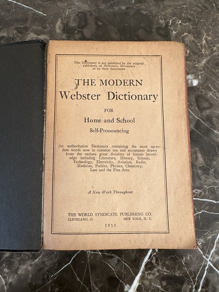 The Modern Webster Dictionary 1933 Home and School Self-Pronouncing. Please see photos for condition as it does have wear and discoloration. One page is loose from binding. Measures at 8” x 5.5”.