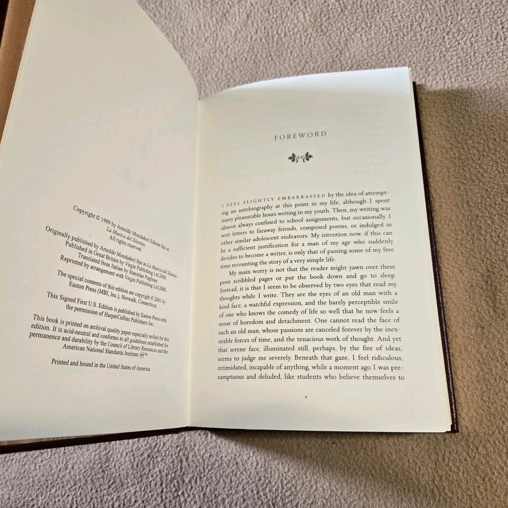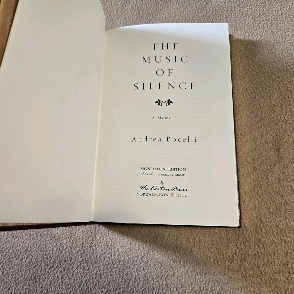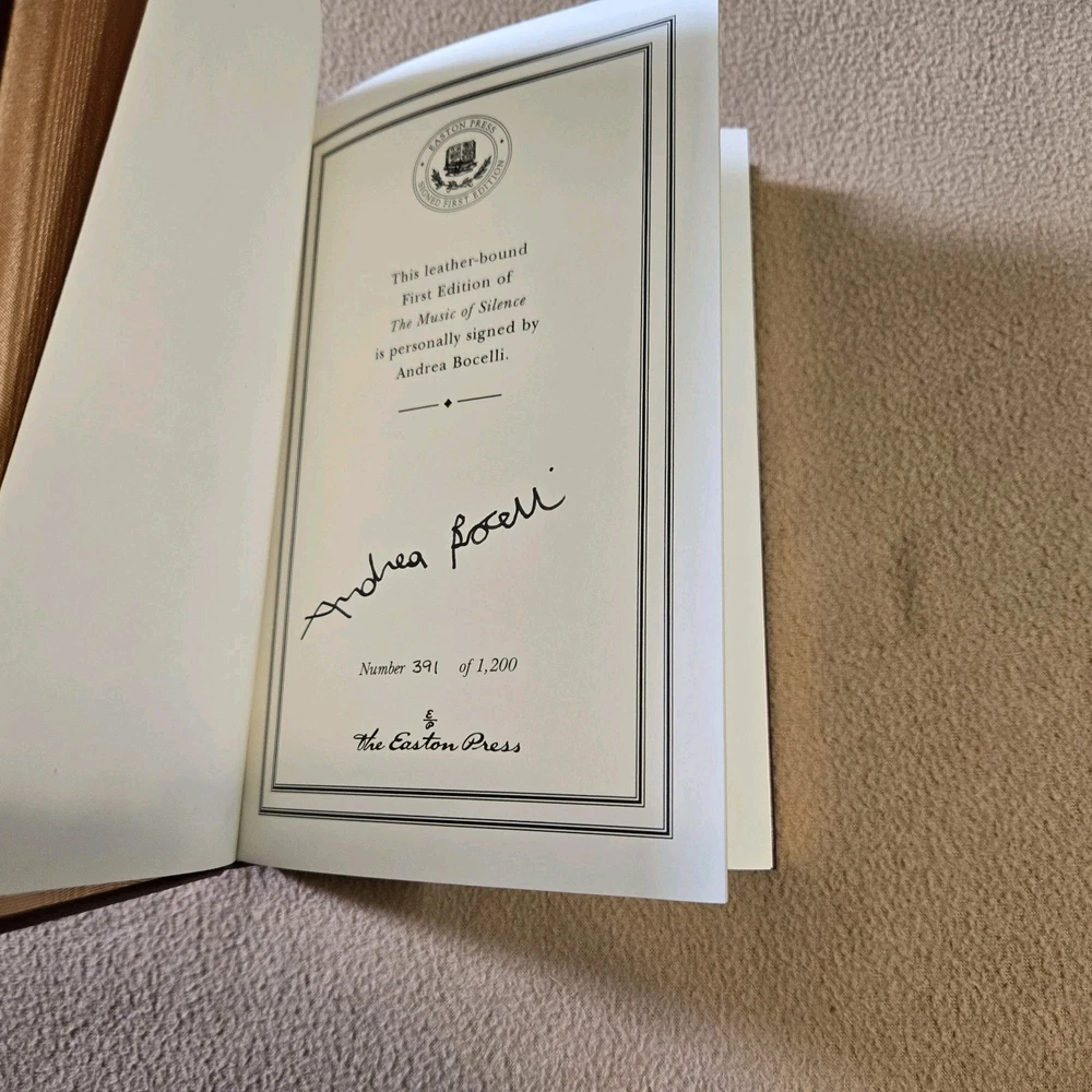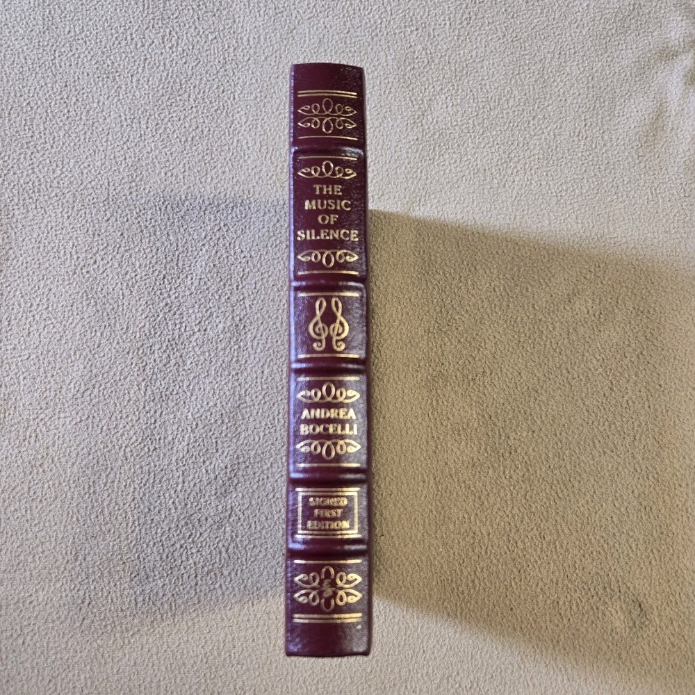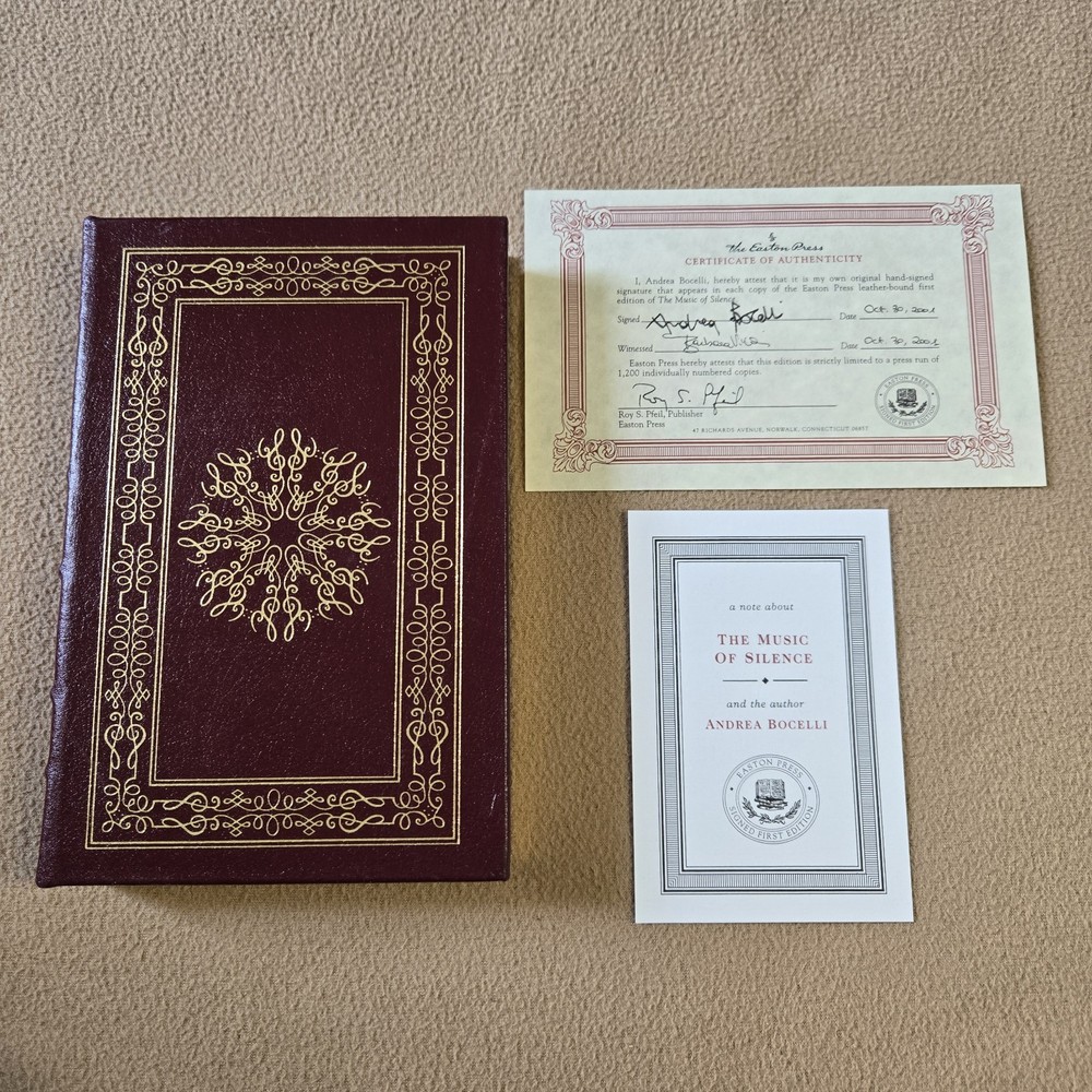 The Music of Silence: A Memoir , Andrea Bocelli, Easton Press, 2001. Signed limited 1st edition, #391 0f 1,200 copies signed by Andrea Bocelli. Includes Easton Press certificate of authenticity and notes about the book. This book is internally clean and tight, has light wear to the page ends, boards, and board edges. Appears unread. Please examine all of the pictures closely. Thanks for looking!