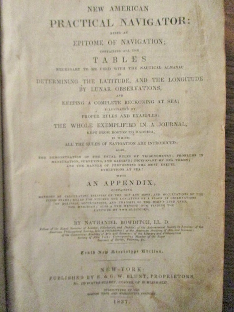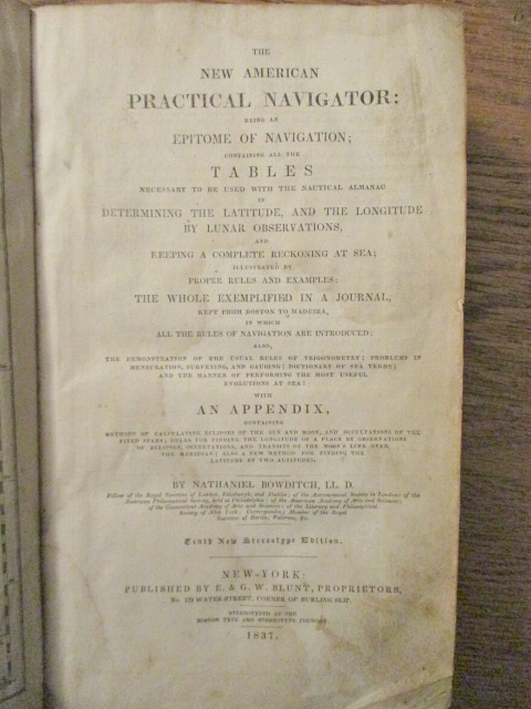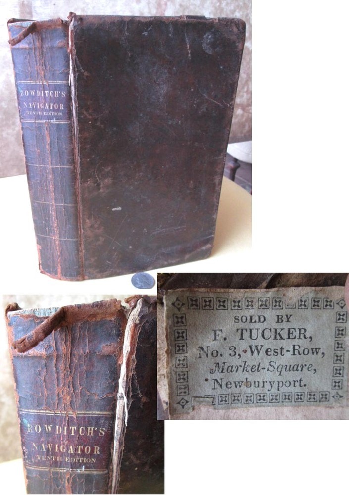 bc230. The New American Navigator, by Nathaniel Bowditch. Pub. E & G. W. Blunt, NY., 1837. Tenth Edition. Octavo, 317 pages. Text with complete folding map in front opposite Title page. Page 384, Tables, and Pages 385-439, Catalog of Tables, plus 13 plates of which No. 6 on page 54 is missing. Full calf, crown of spine is frayed, good spine label. Front cover is started halfway down from top. Bookseller's label, "F.Tucker, Newburyport", inside front cover. Book was used at sea with usual light damp stains, pretty much throughout. Acceptable condition. Please do not hesitate to e-mail with any questions. As Always, Satisfaction Guaranteed! PAYMENT: PayPal, because eBay requires sellers to list electronic payments exclusively. I expect to receive payment within 10 days, unless we have made other arrangements. MEDIA MAIL: The majority of my books are sent Media Mail to U.S. customers. I add $1.00 for shipping materials, etc. (The shipping price that you see at the top of the page includes the handling fee.) PRIORITY MAIL: I will send both Media cost and Priority cost with invoice, on books which seem to warrant Priority service or when buyer requests it. I'm glad to combine multiple purchases in order to minimize shipping costs. I WILL SHIP INTERNATIONALLY, and I try to be as economical as possible with the shipping costs. Whenever a book will fit comfortably in a Priority Flat Rate Envelope, I'll send it that way. RETURN POLICY: Satisfaction Guaranteed!