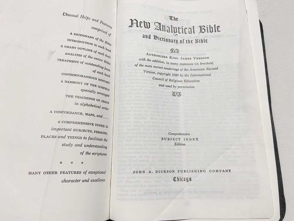 The New Analytical Bible and Dictionary of the Bible by J. A. Dickson 1950 I have new listing everyday. Please visit my store and click Follow to be updated new products and promotions. I always try to check carefully the books' condition to provide the most accuracy description. Your satisfaction is my goal and my motivation. If you have any question, please let me know. Thank you and enjoy reading! Shipping: Handling time: same day Fast shipping with tracking number. Returns/ Exchange: Please visit my store to check the return policy
